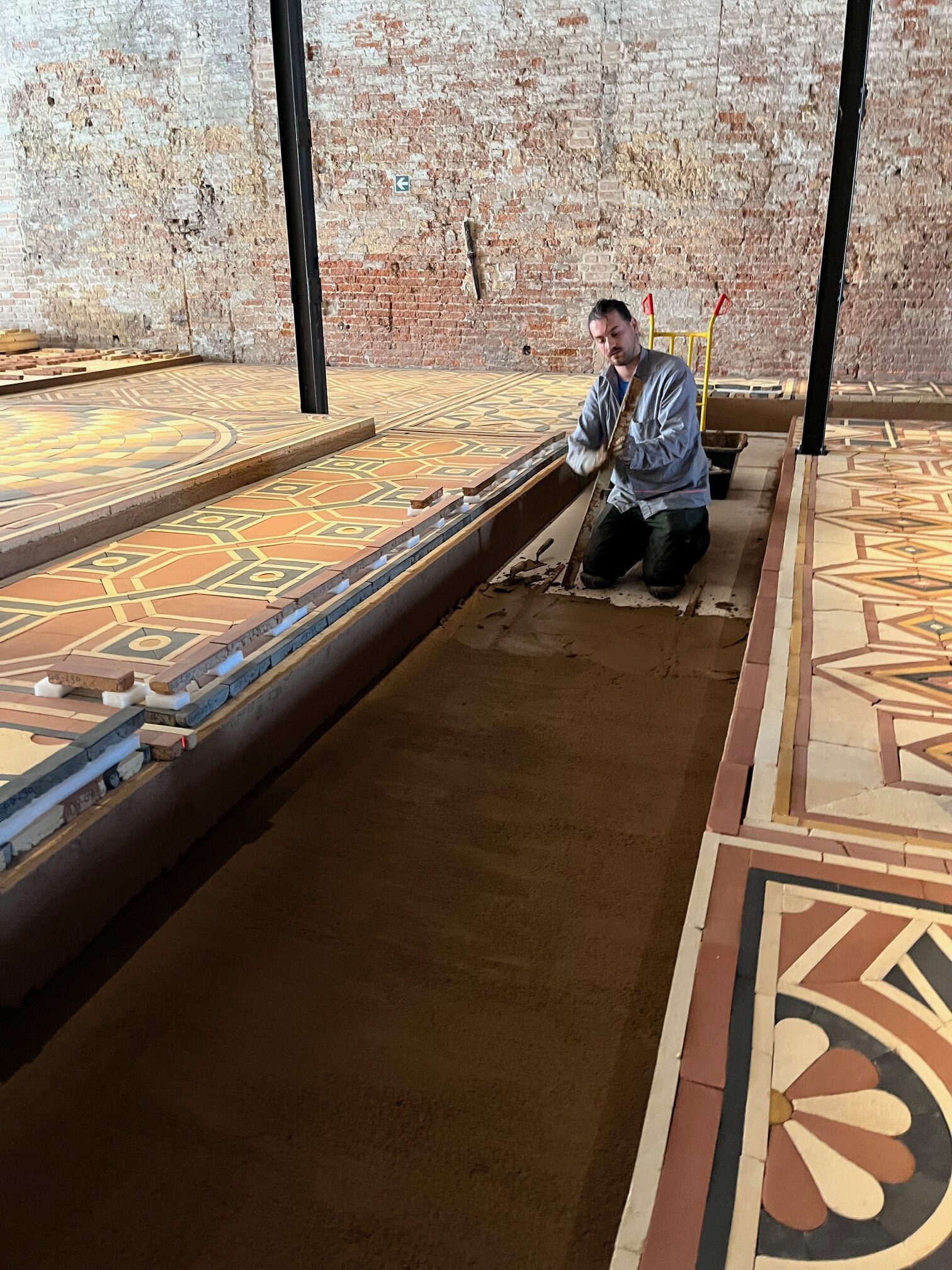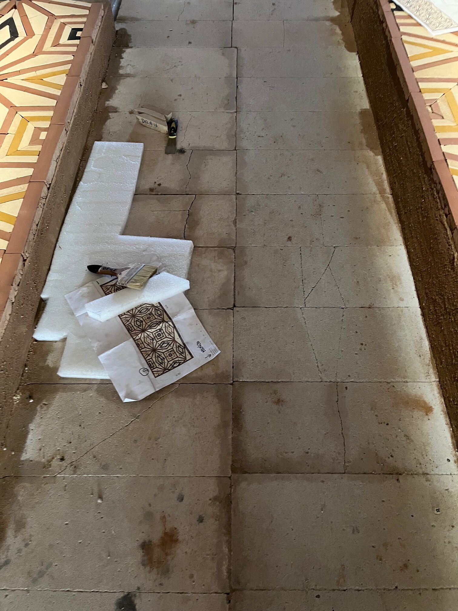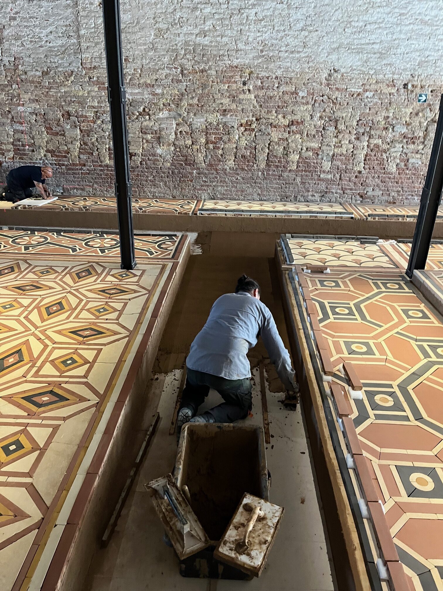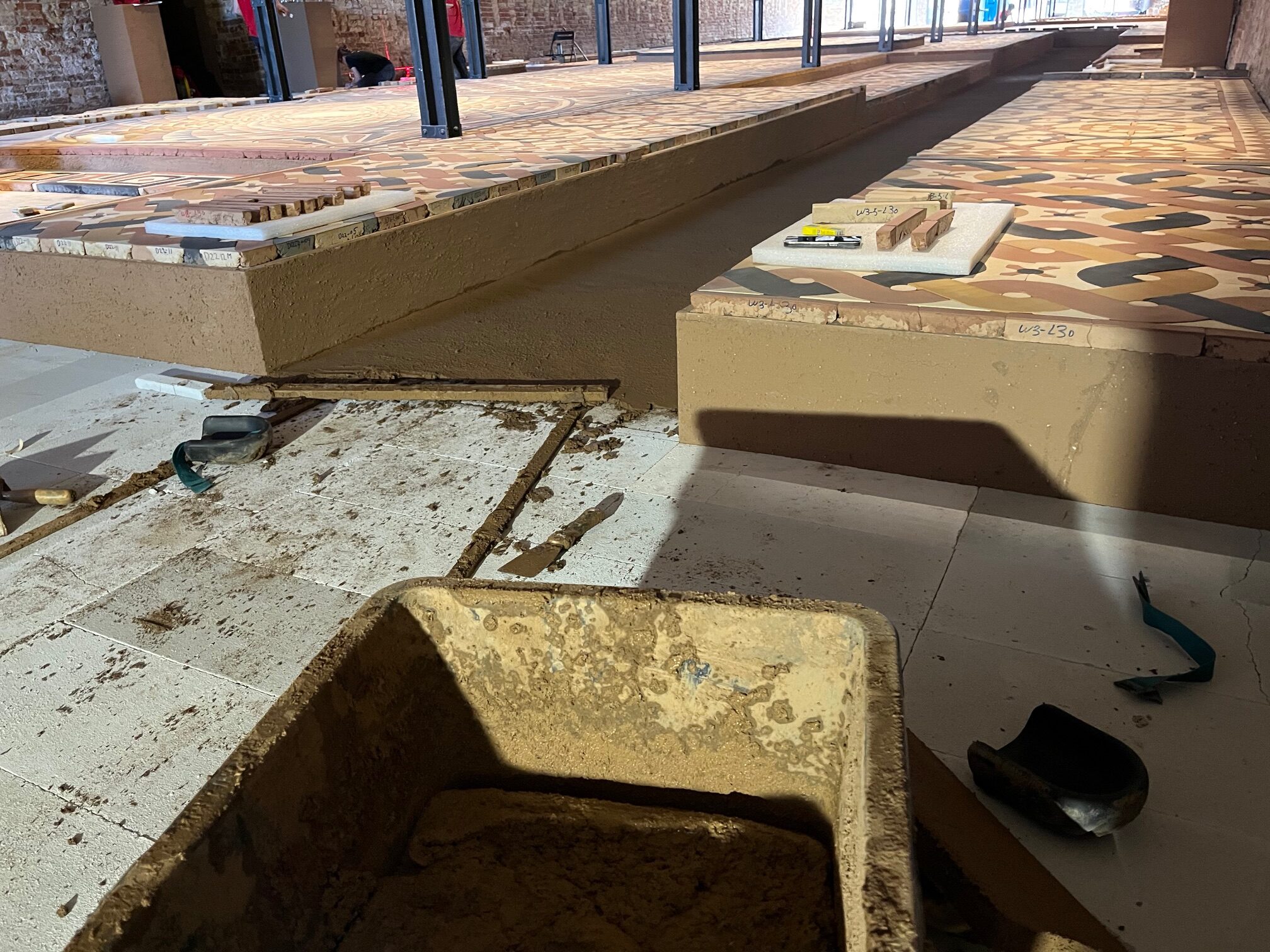 Namesto kontemplativnega dela z zemljo smo se znašli v bitki s časom. Mozaiki, izjemno kompleksni in natančni, so začeli nastajati istočasno z zemeljsko arhitekturo, ki jih obdaja. Delo, ki bi si želelo mir, zaporedje in počasnost, se je spremenilo v sočasno usklajevanje različnih rok, odločitev in ritmov. Vsak korak je vplival na drugega. Zemeljski sloj je potreboval svoj čas, mozaiki svojega, otvoritev pa se bliža.