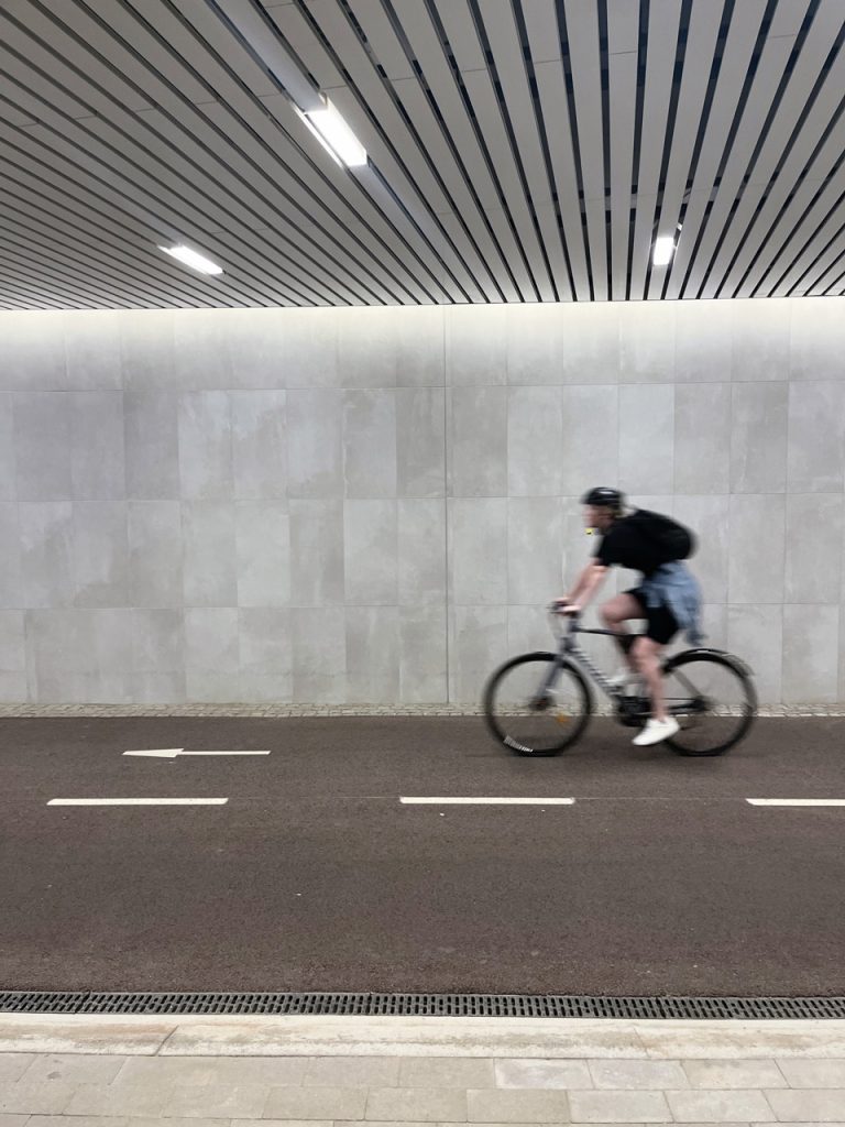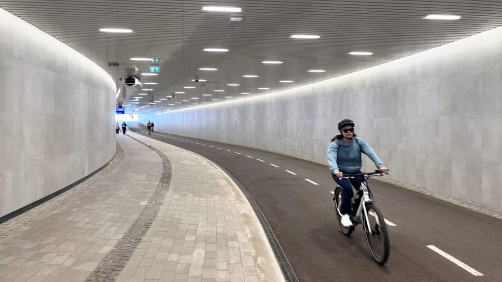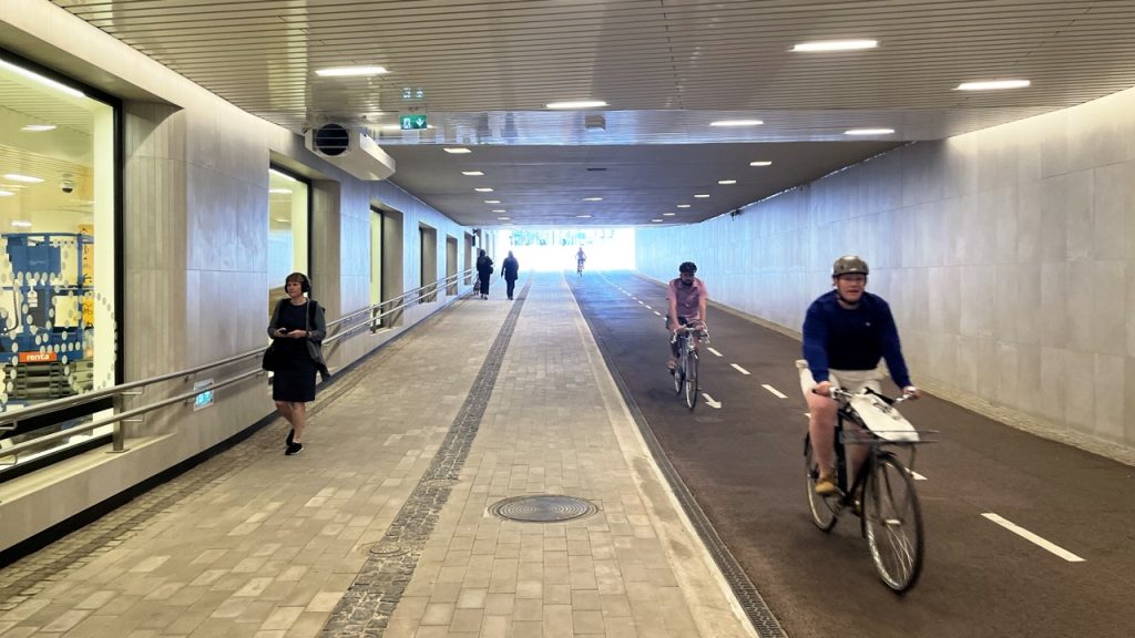 Predor ima ukrivljeno obliko, da se izogne obstoječim stopniščem, ki vodijo do postajnih peronov, in ostali obstoječi infrastrukturi železniške postaje. Radij predora je kar največji, 120 metrov, kar zagotavlja dobro vidljivost in varnost tudi najhitrejšim kolesarjem. Predor sledi trenutnim načrtovalskim smernicam za udobno in varno kolesarjenje – visok je tri metre in širok osem metrov, s štirimetrsko kolesarsko stezo, ki je z robniki ločena od 3,5-metrskega koridorja za pešce.