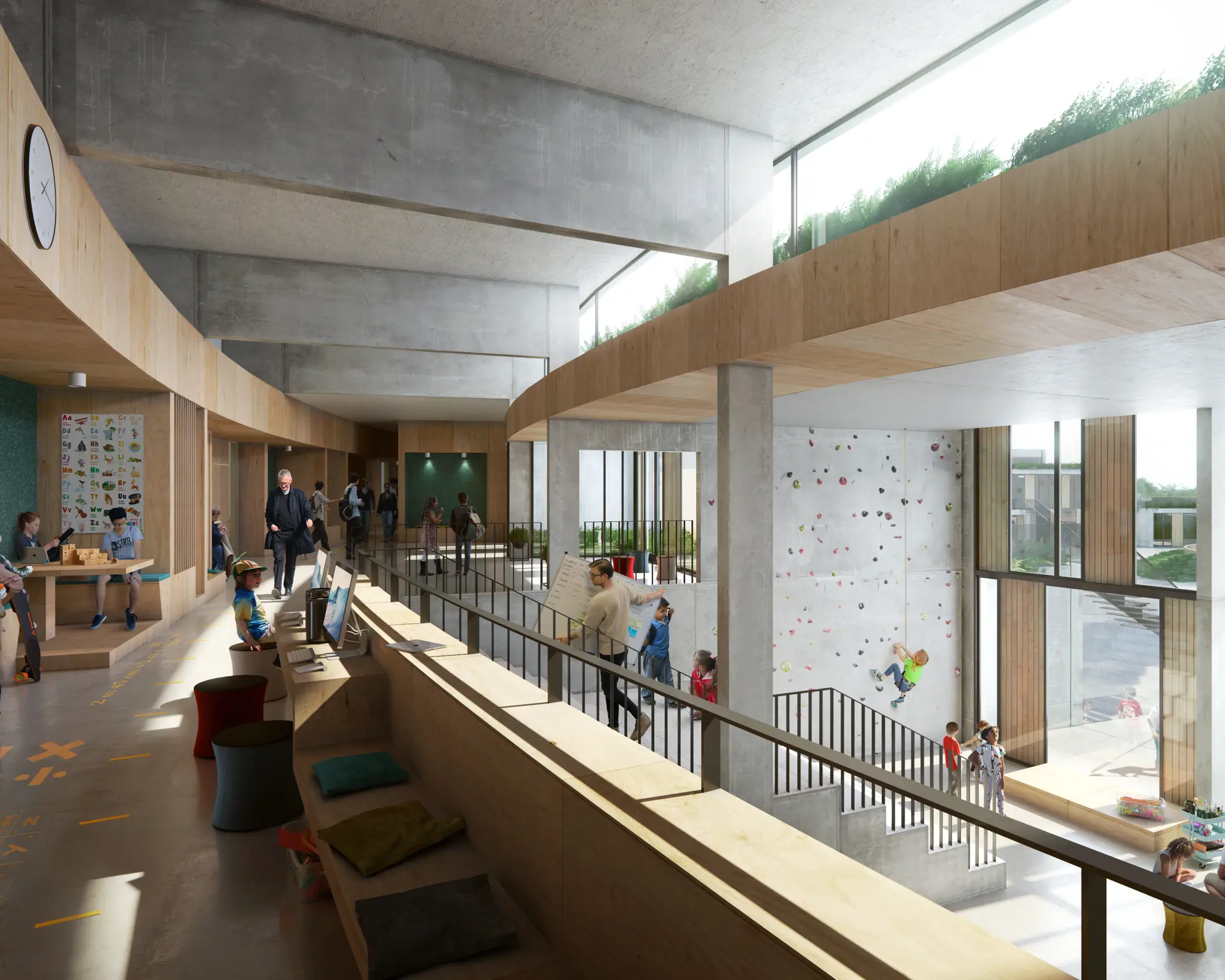 Nahajajoč se na obrobju mesta, dizajn izkorišča bližino šole do narave in si prizadeva, da prinese naravo v življenje učencev. Šola nima obodnega ograjenega prostora, kar omogoča učencem raziskovanje okolice. Nagibna streha se poveže z zemljo in omogoča dostop javnosti. Šola vključuje tudi prostore, kot so knjižnica, kavarna ter športni in glasbeni objekti, ki bodo na voljo lokalni skupnosti po šolskem času.