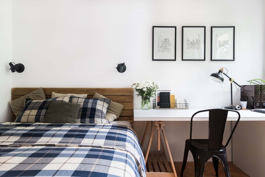 Ker sta oba prebivalca stanovanja mlada profesionalca, sta tudi doma potrebovala kotiček, namenjen delu. Tega so arhitekti umestili v spalni del stanovanja, kjer je poleg postelje dovolj prostora še za delovno mizo za dva. Kadar je potreba po koncentraciji večja, se eden izmed obeh lahko umakne v dnevno-jedilni prostor: tam se ob izhodu na balkon namreč nahaja raztegljiva zofa, ki se po potrebi prelevi v ležišče, kavč ali udoben kotiček za delo od doma.