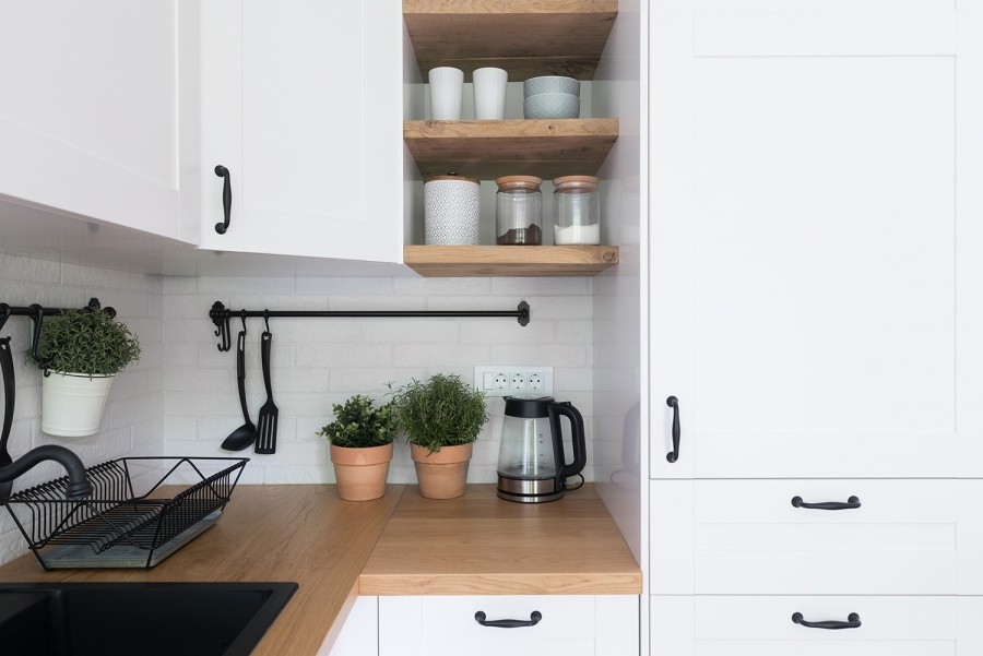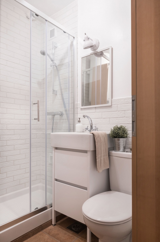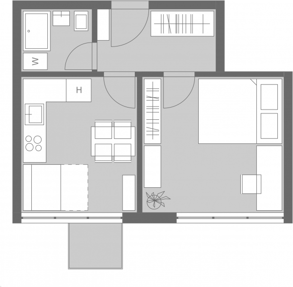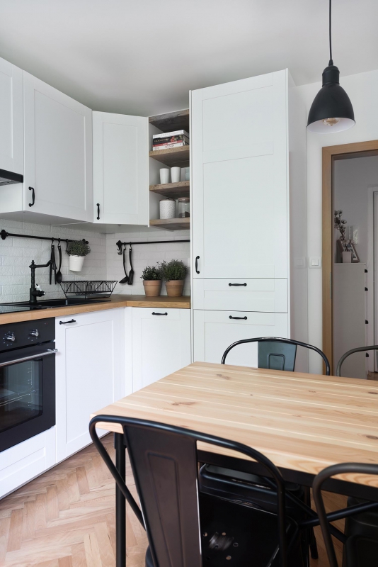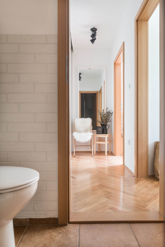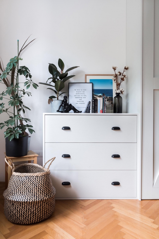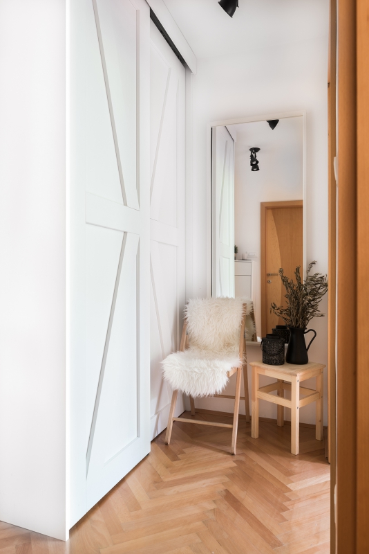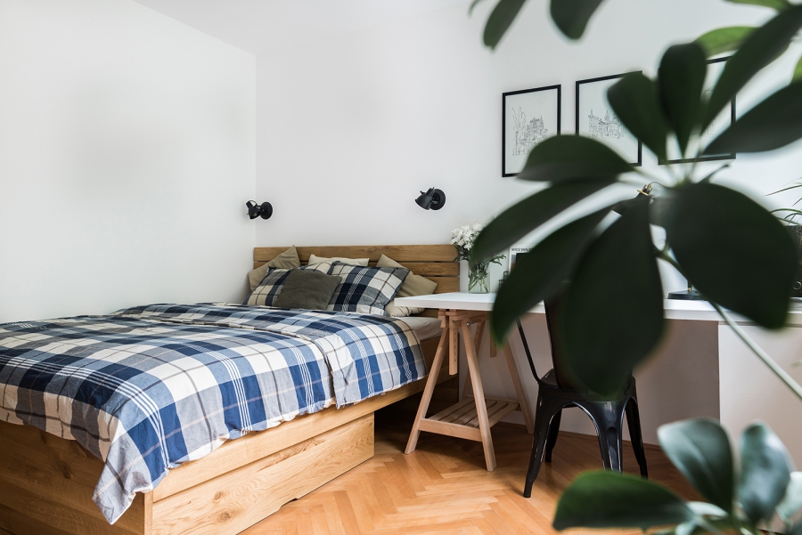 Manj kot 30m2? Tlorisna površina za življenje mladega par popolnoma zadostuje, vendar pa so arhitekti morali poseči po iznajdljivih načinih zagotavljanja prostora za shranjevanje. Tega, kot vemo vsi, nikoli ni preveč: v spalnici tako najdemo vgradno garderobno omaro, komodo, pa še prostoren predal pod posteljo, v predprostoru pa po meri narejeno omarico za čevlje, še eno vgradno omaro za zimsko garderobo in pa zložljivo stojalo za perilo. Pralni stroj, ki se je prej nahajal v kuhinji, so arhitekti brez večjih posegov premaknili v kopalnico, zagotovili pa so tudi prostor za večjo tuš kabino. Vse to zagotavlja udobno in funkcionalno bivanje s kar največjim prostorskim izkoristkom.