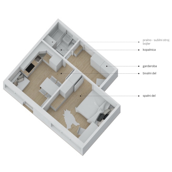 »Svojevrstnost naročnikov mnogokrat izvabi iz arhitektov bolj nepričakovane rešitve, tako v sami tlorisni zasnovi, kot tudi pri samem oblikovanju interierja. Pri omenjenem projektu smo reorganizirali tlorisno zasnovo znotraj obstoječih sten iz precej klasične zasnove s kuhinjskim in spalnim delom v bivalni del (vključujoč dnevno sobo) in spalni del, ki vključuje tudi delovni kotiček. Tako tlorisna zasnova bolj ustreza sodobnemu načinu življenja naročnikov v poznih dvajsetih, njihovo željo po industrijsko-rustikalnem stilu pa smo združili s svetlim sodobnim okvirjem, ki se rezultira v prijetnem in domačnem interierju.«