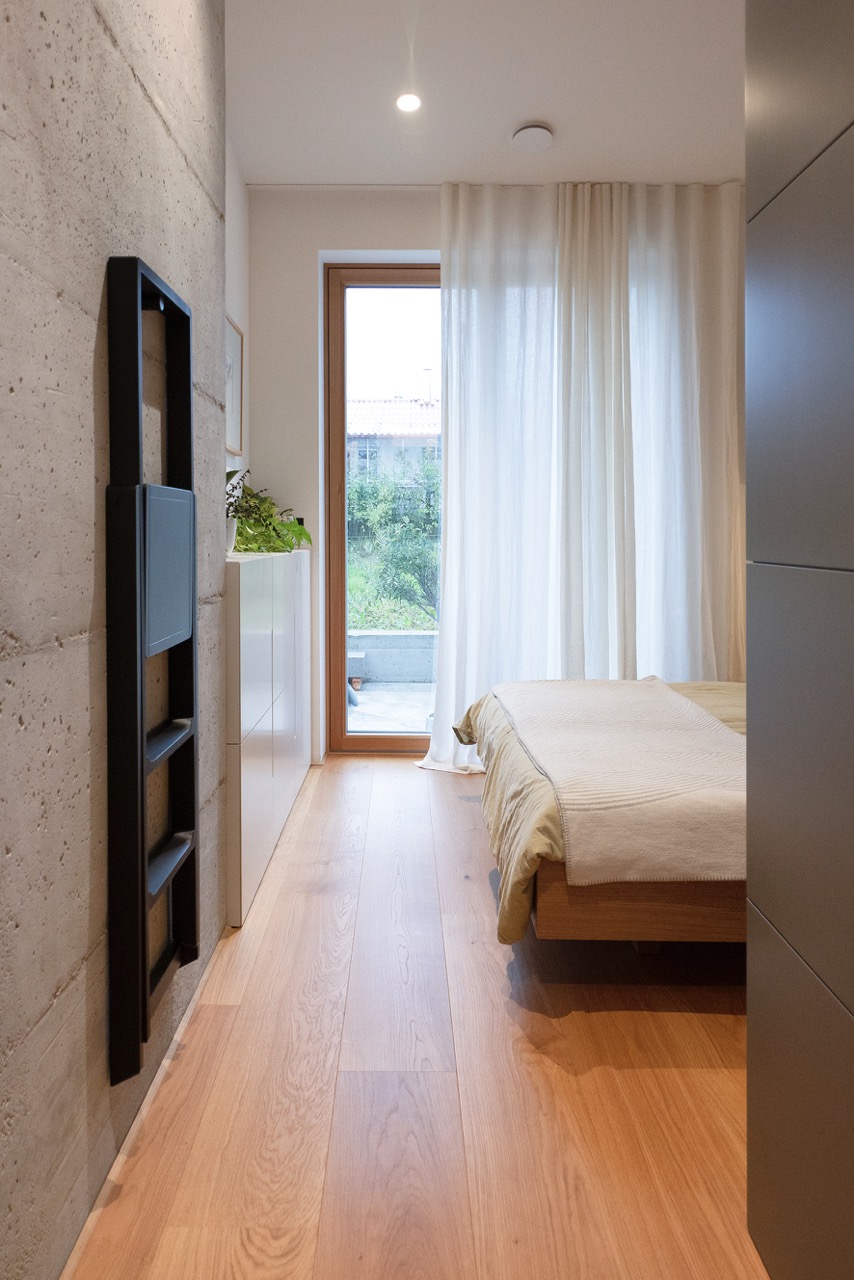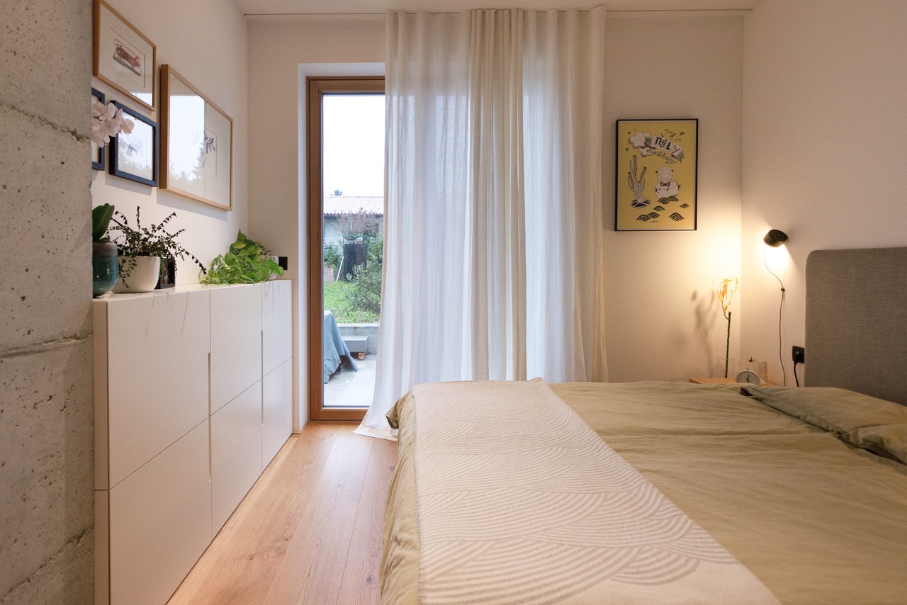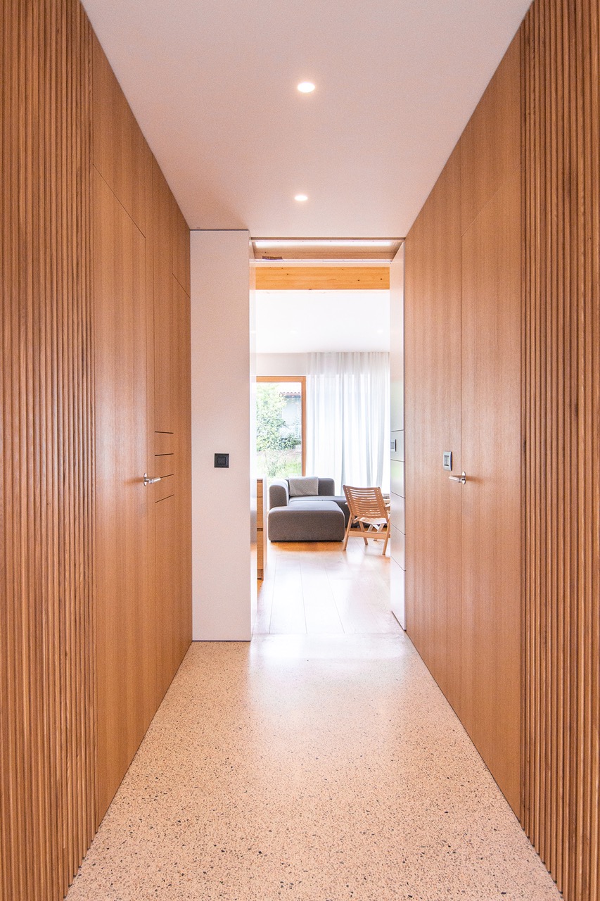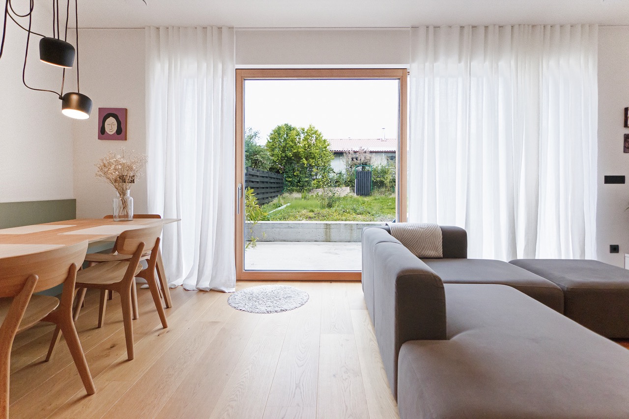 Pri izbiri materialov in barv sta se avtorici odločili za tople odtenke lesa, ki ga še poudarijo velike bele površine, z nekaterimi poudarki v sivi in olivno zeleni. Ob bivalnem prostoru sta uredili spalnico staršev z lastno kopalnico. Otroški sobi, kopalnica in utility so zasnovani zelo racionalno in opremljeni s pohištvom po meri, ki omogoča najboljši izkoristek omejenega prostora.
