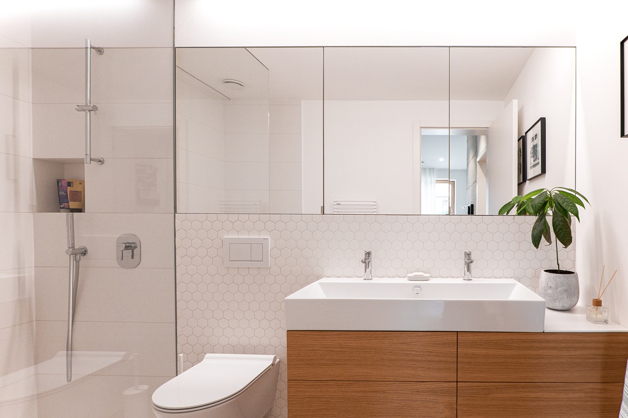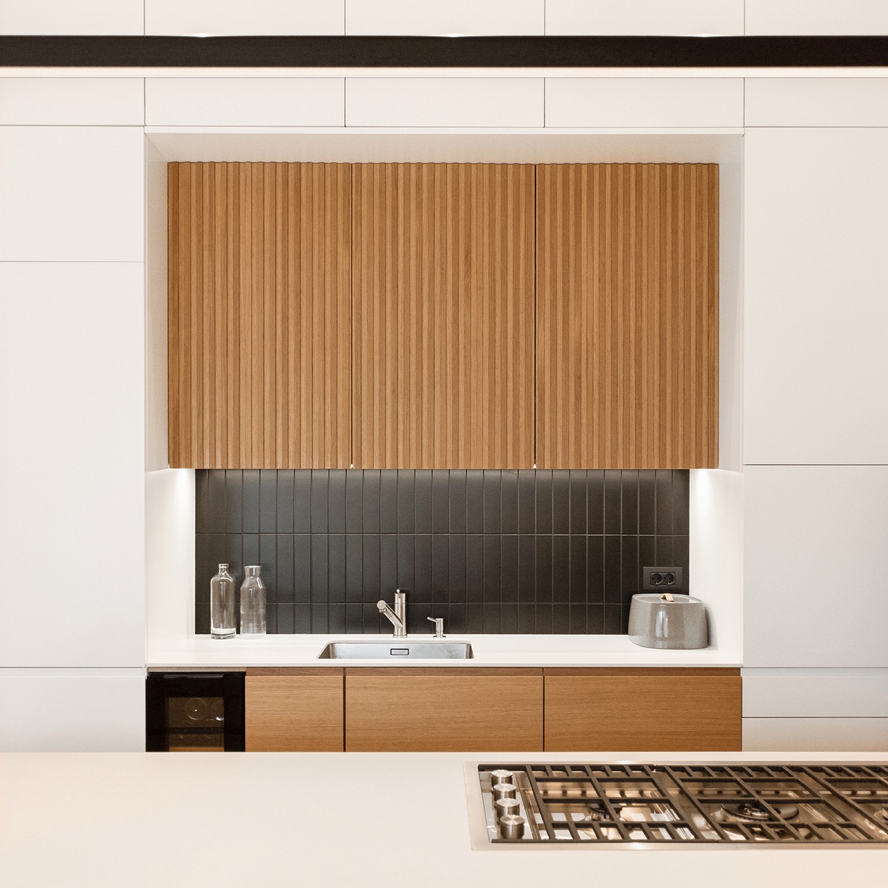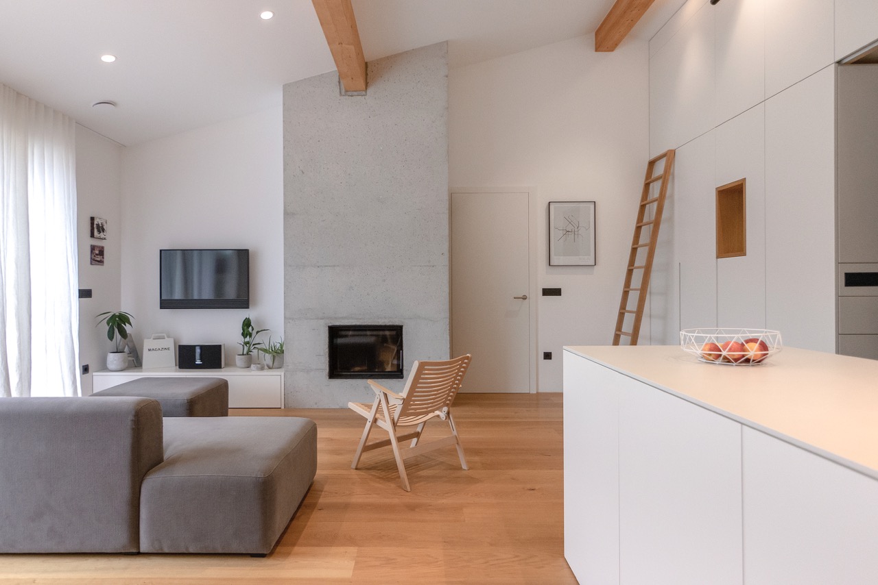 Pri izbiri materialov in barv sta se avtorici odločili za tople odtenke lesa, ki ga še poudarijo velike bele površine, z nekaterimi poudarki v sivi in olivno zeleni. Ob bivalnem prostoru sta uredili spalnico staršev z lastno kopalnico. Otroški sobi, kopalnica in utility so zasnovani zelo racionalno in opremljeni s pohištvom po meri, ki omogoča najboljši izkoristek omejenega prostora.