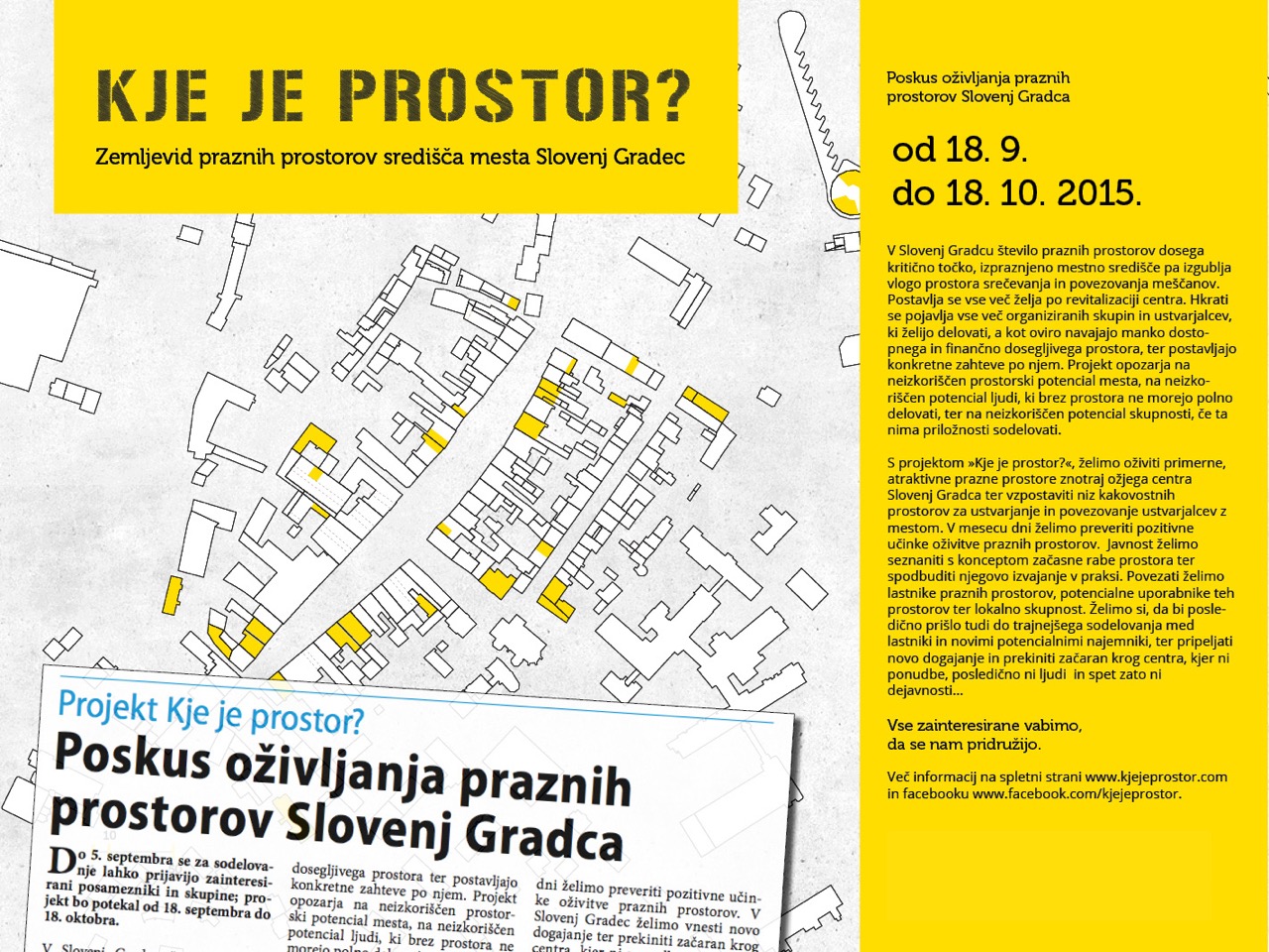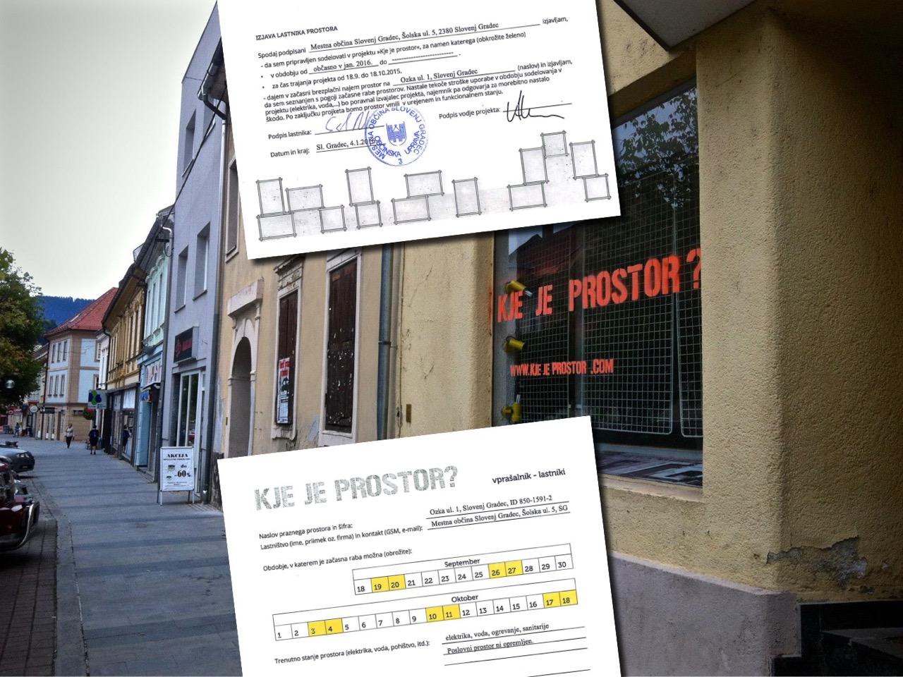 Prva faza projekta je zajemala detektiranje in popis praznih prostorov, izložb v starem mestnem jedru Slovenj Gradca. Izdelali so načrt centra Slovenj Gradca z vrisanimi praznimi prostori – »Načrt neizkoriščenih potencialov mesta«. Z ozaveščanjem o prednostih začasne rabe in predočenjem promocije, ki jo je prostor sam ob takem projektu deležen, so uspeli k sodelovanju pritegnili večino zasebnih lastnikov praznih prostorov v mestu, prazne lokale je ponudila tudi Mestna občina. Oddaja nepremičnin je potekala po principu začasne rabe prostora, brez najemnin. Prek javnega poziva in so k sodelovanju povabili potencialne uporabnike praznih prostorov in prek vrste delavnic so se ti organizirali v skupine, ki so napolnile prostore.