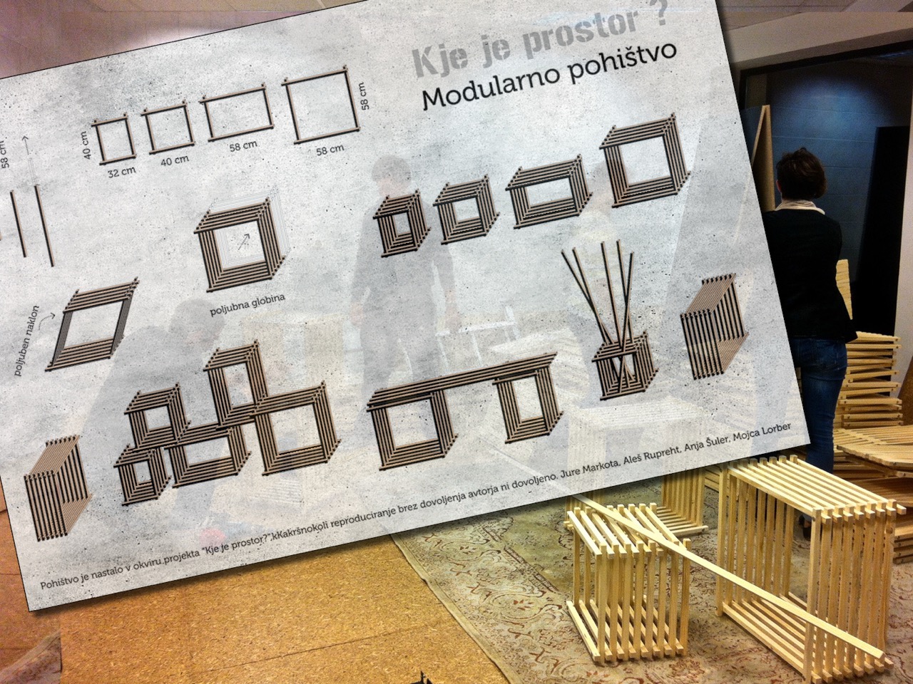 Za projekt so oblikovali lesene modularne kubusne prostorske elemente – pohištvo praznih prostorov. S sestavljanjem posameznih elementov sonastale mize, razstavne police, klopi, predelne stene, obešalniki…. Oprema je s svojo fleksibilnostjo sestavov sama nagovarjala k ustvarjalnosti; glede na svoje potrebe so jo sestavljali in si vsak prostor po svoje opremili uporabniki sami. Ti elementi so postali prepoznaven znak projekta, vsi skupaj pa so tvorili enotno prostorsko instalacijo, ki je bila vpeta v celoten prostor mesta – posamezni elementi so simbolno in emocionalno povezali vse lokacije.