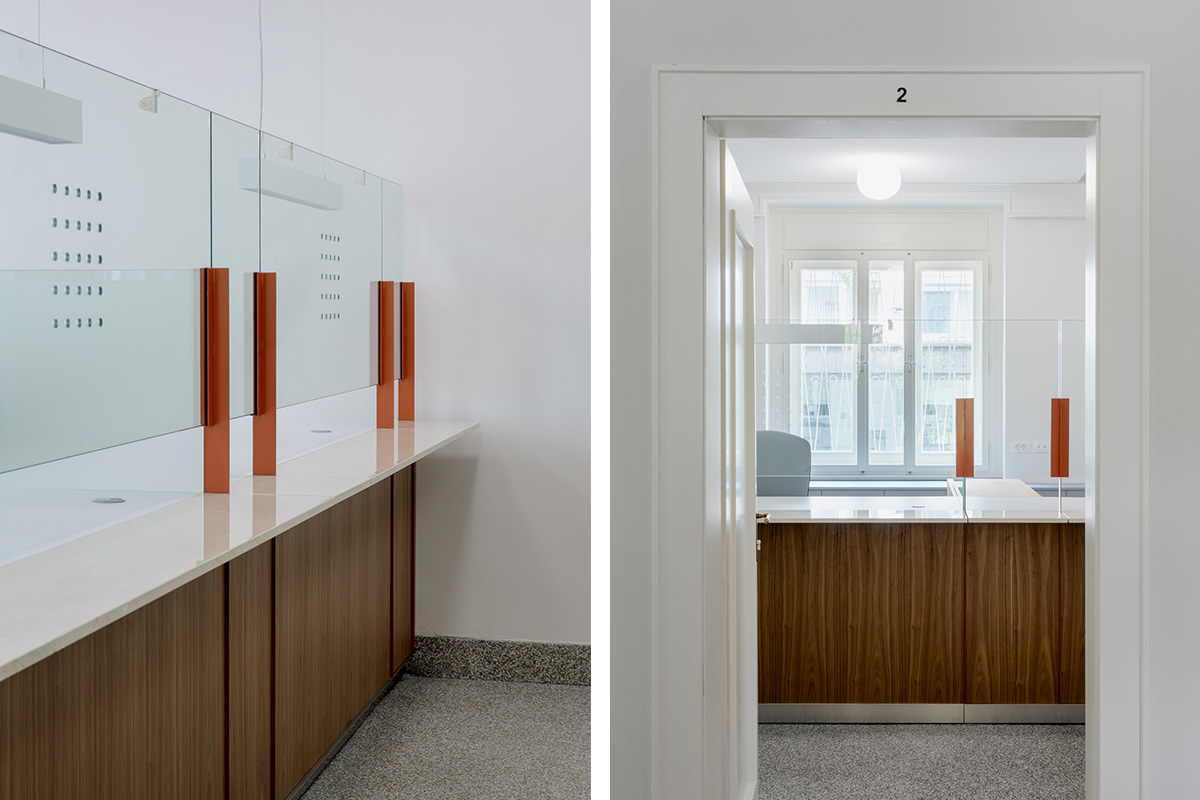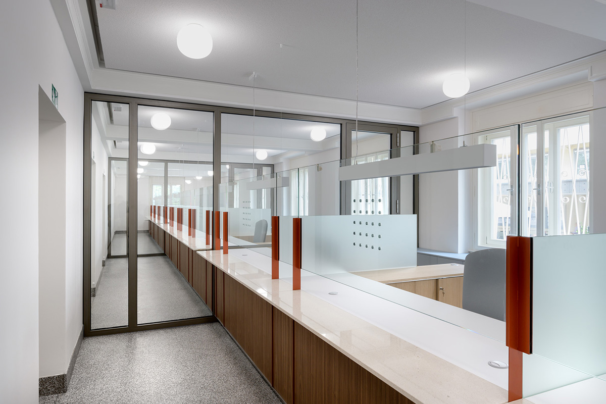 Pisarniški prostori so zaradi manjšega deleža spomeniško zaščitenih elementov zasnovani bolj sproščeno, vseeno pa je vizualni jezik skladen z obstoječim in ni pompozen. Reprezentativen delovni pult iz orehovega lesa in belega kamna členijo rdeči stebri, katerih raster sledi rastru tlorisa stavbe. Pisalne mize za njim so izvedene v nežnejših tonih hrastovega lesa ter svetlo modre barve. Poleg pulta prostor na dva dela, za zaposlene ter za obiskovalce, jasno razdeli tudi sprememba tlaka iz parketa v teraco.