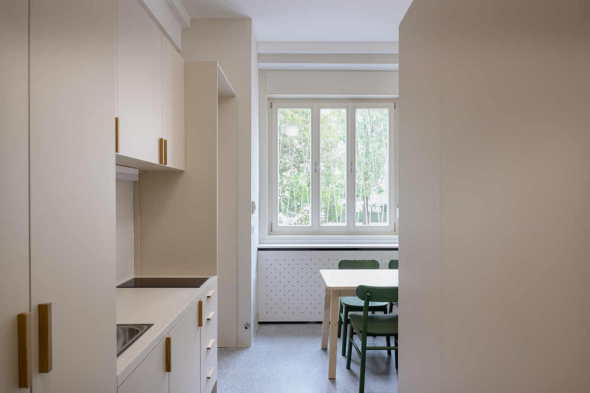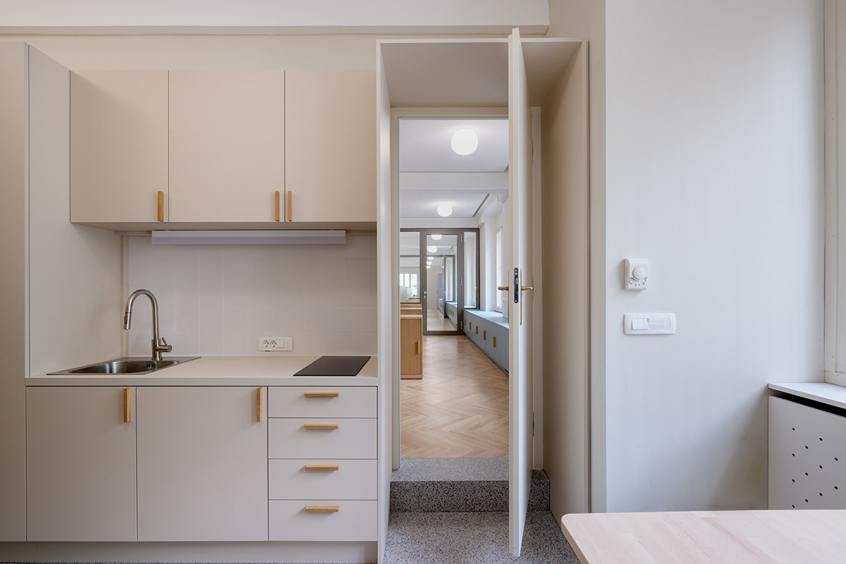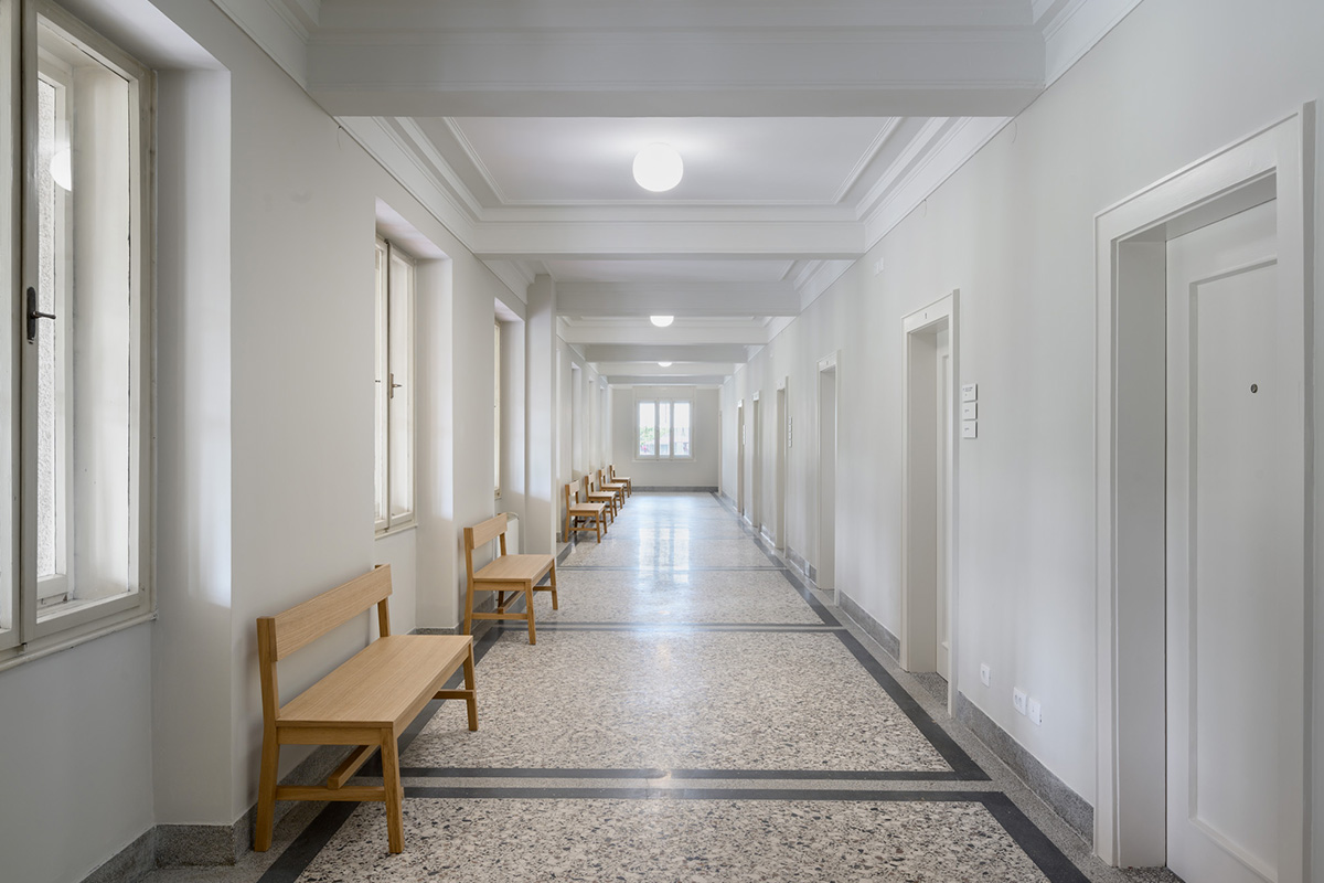 Hodnik, ki povezuje pisarne, je med prenovo doživel korenitejšo spremembo – odstranili so namreč zadnjo sobo, s čimer so odprli pogled na kamnito ložo ob stavbi. Na hodniku so zaradi višje stopnje zaščite arhitekti ohranili originalno materialnost, le vrata in del tlakov iz teraca je bilo na novo izvedenih po vzoru prvotnih. Poleg tega so dodali premično pohištvo iz hrastovega lesa.