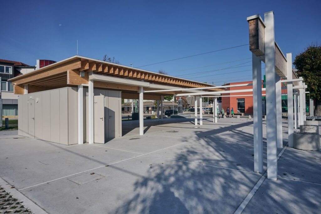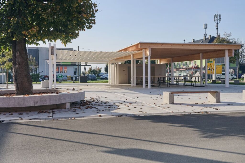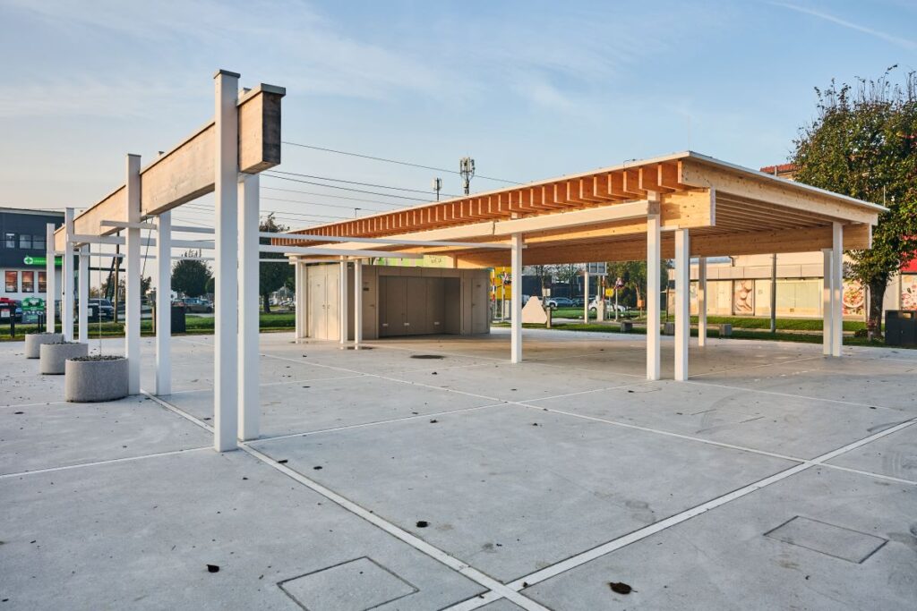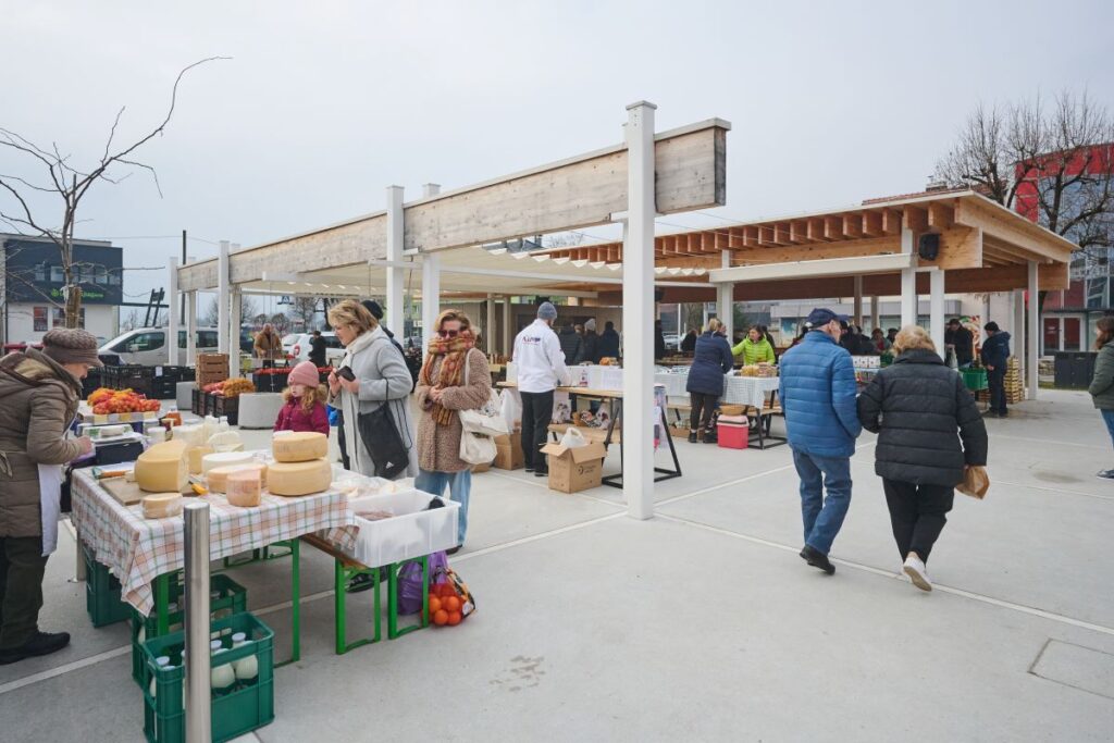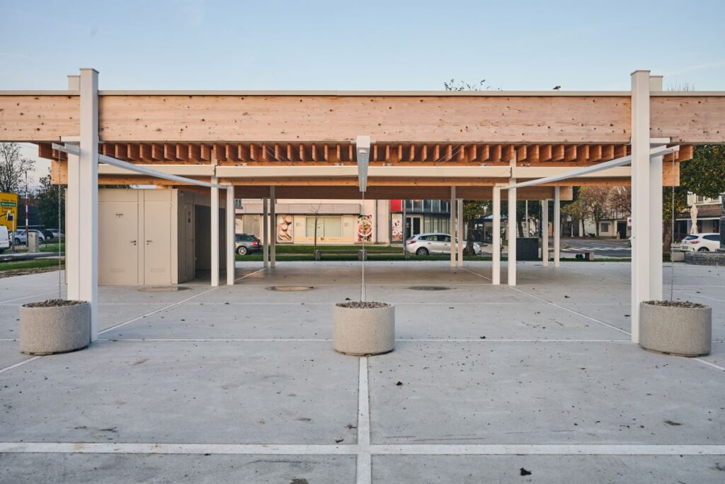 Nova tržnica (oz. trg) je pripeta na glavno krajevno os, ob kateri se zvrstijo trgovine, banka, upravna enota, pošta, občina in na koncu še železniška postaja. Trg zaseda ravno pravokotno zemljišče, pred ureditvijo namenjeno parkirišču. Zasnova ploščadi je preprosta in domišljena. Na ortogonalno mrežo tlaka so postavljeni trije redi lepo detajliranih parov kovinskih belih stebrov, ki tvorijo dve tržni območji. Del s fiksno streho in del s pomično streho iz platna. Vse ’stojnice’ so odstranljive – pospravijo jih v pokriti skladiščni kubus ob robu. V njem so tudi avtomati, hladilniki in sanitarije. Prodajne mize so zasnovane tako, da nudijo mizno površino na dveh višinah. Kovinska ogrodja stojnic so več funkcionalna – lahko so v rabi tudi kot ’praktikabli’ za oder ali kot podkonstrukcija tribun ob kulturnih in drugih krajevnih prireditvah.