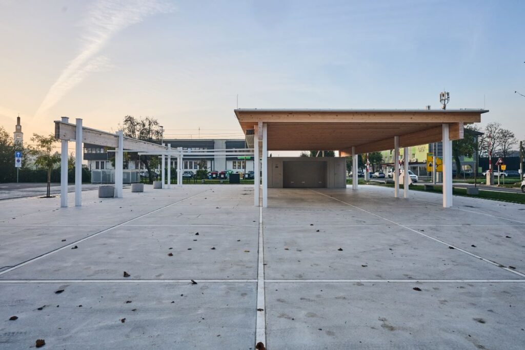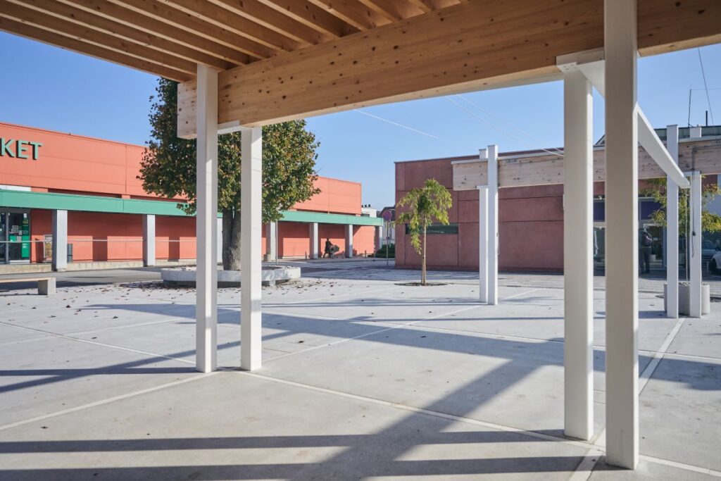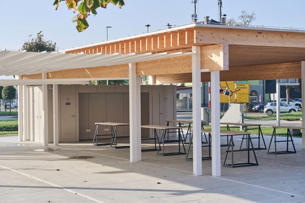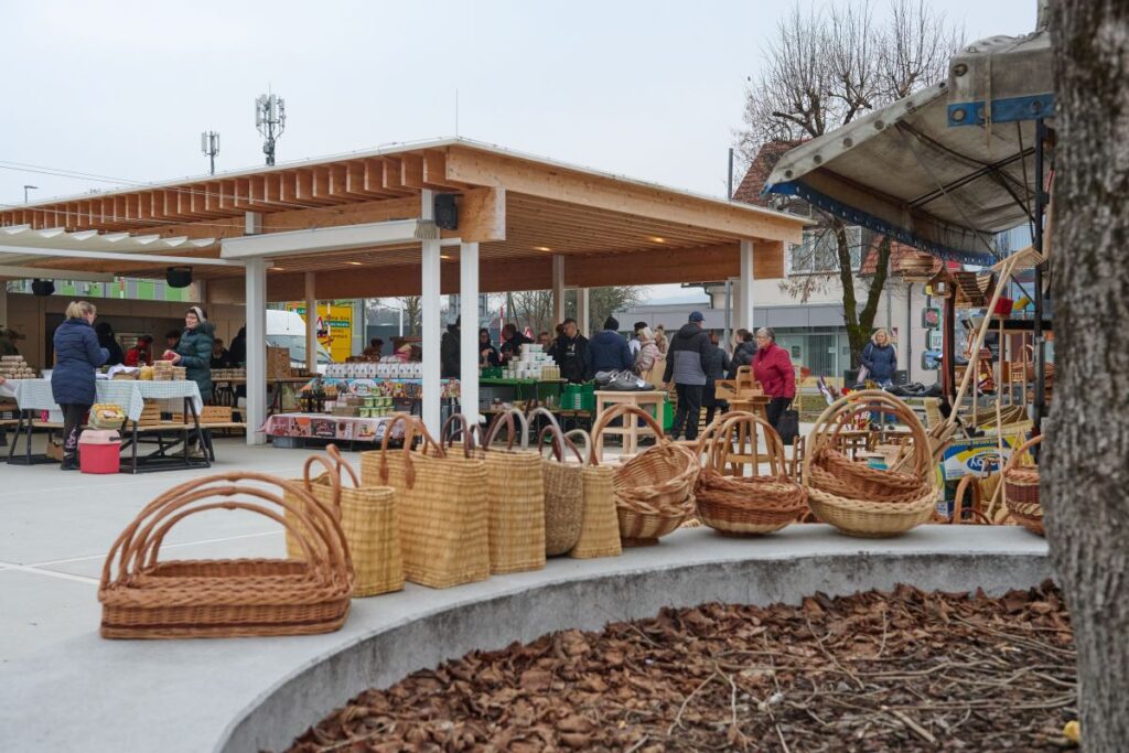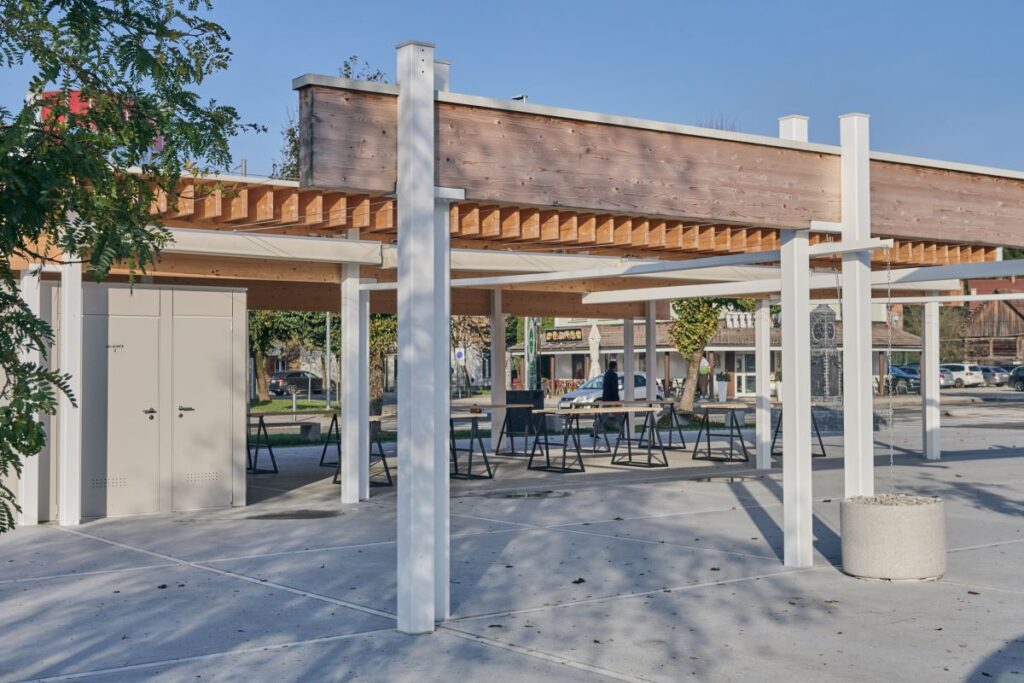 Nova tržnica (oz. trg) je pripeta na glavno krajevno os, ob kateri se zvrstijo trgovine, banka, upravna enota, pošta, občina in na koncu še železniška postaja. Trg zaseda ravno pravokotno zemljišče, pred ureditvijo namenjeno parkirišču. Zasnova ploščadi je preprosta in domišljena. Na ortogonalno mrežo tlaka so postavljeni trije redi lepo detajliranih parov kovinskih belih stebrov, ki tvorijo dve tržni območji. Del s fiksno streho in del s pomično streho iz platna. Vse ’stojnice’ so odstranljive – pospravijo jih v pokriti skladiščni kubus ob robu. V njem so tudi avtomati, hladilniki in sanitarije. Prodajne mize so zasnovane tako, da nudijo mizno površino na dveh višinah. Kovinska ogrodja stojnic so več funkcionalna – lahko so v rabi tudi kot ’praktikabli’ za oder ali kot podkonstrukcija tribun ob kulturnih in drugih krajevnih prireditvah.