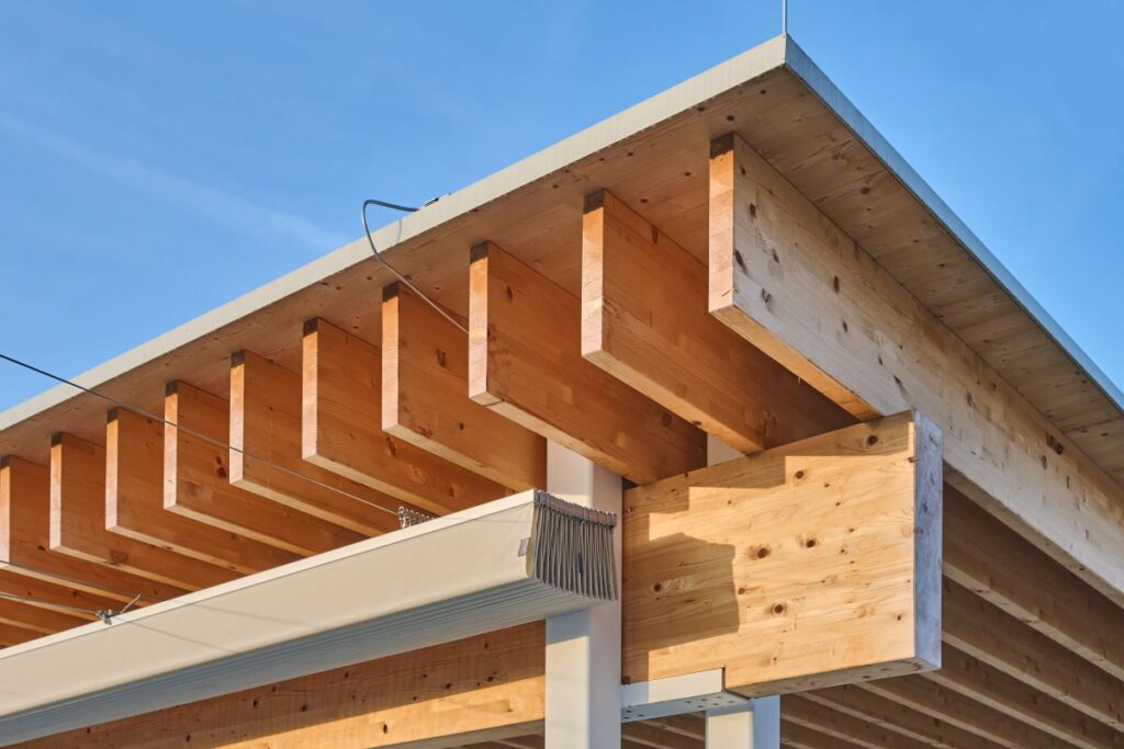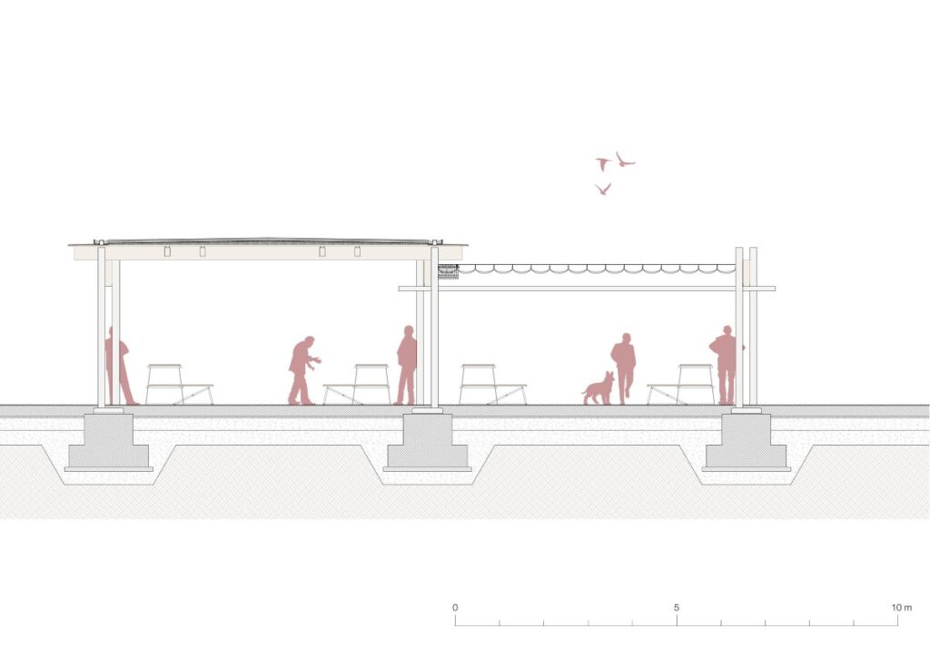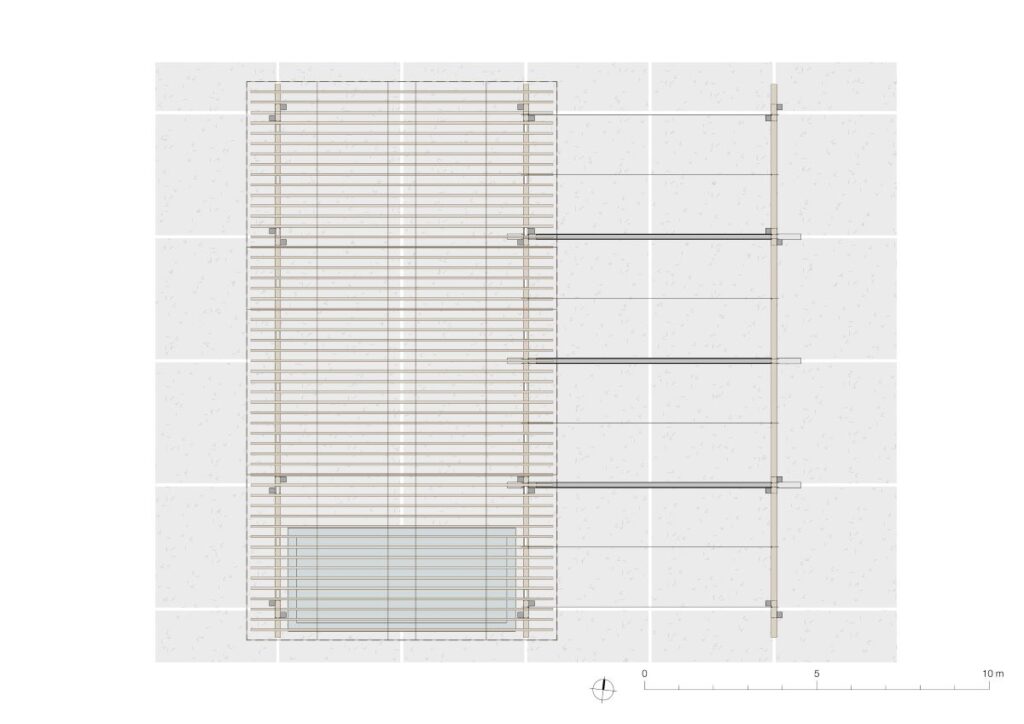 Oblikovanje strehe je preprosto in lepo. Strešna konstrukcija fiksnega dela je izvedena iz gostega rastra vzporednih lesenih špirovcev, podprtih z izrazito visokima lesenima stranskima legama. Legi sta vpeti v nosilček, zavarjen med dva diagonalno postavljena tanka kvadratna stebra. Diagonalna postavitev deluje izrazito tridimenzionalno; ob premikanju očišča se zdi, kot da bi se spreminjali tudi stebri. Nekateri od stebrov služijo kot odtočni žlebovi. Sama strešina fiksnega dela je na robovih zelo tanka in daje vtis lahkosti. Premični del strehe doprinese k stalno spreminjajočemu vtisu tržnega prostora in živahnosti. Raztegnjena platna zadržijo dež in sonce, ob lepem pomladnem in jesenskem vremenu pa so zložena. Odprejo se s preprostim ročnim mehanizmom. Odvodnjavanje meteorne vode iz raztegnjenih platen je v kvadratne žlebove, ki skupaj s krajno lego, verigami in poudarjenimi betonskimi valjastimi nadzemninimi peskolovi označujejo območje trgovanja tudi, ko so platna pospravljena.
