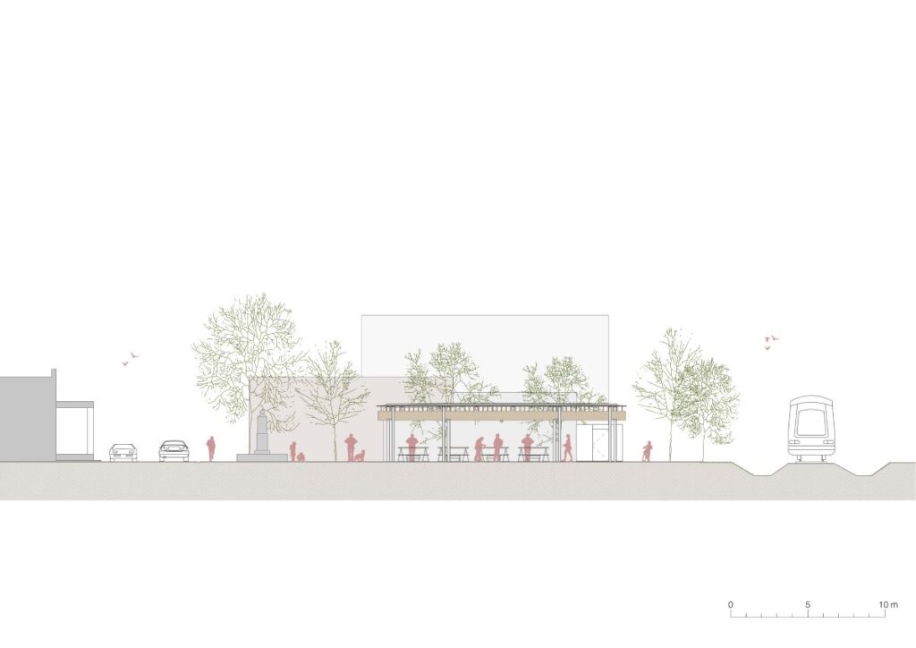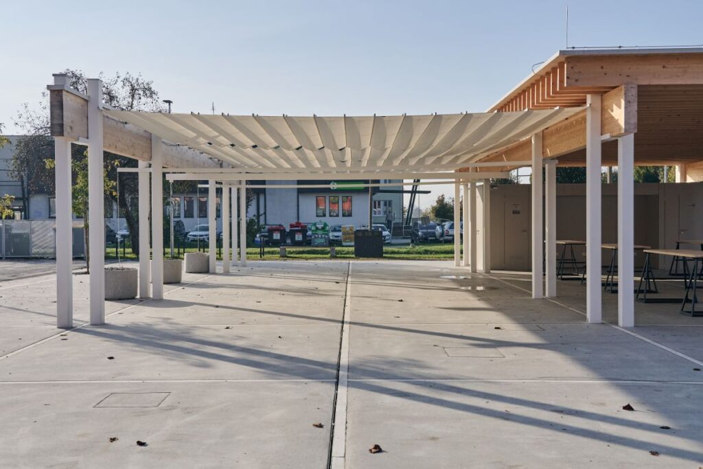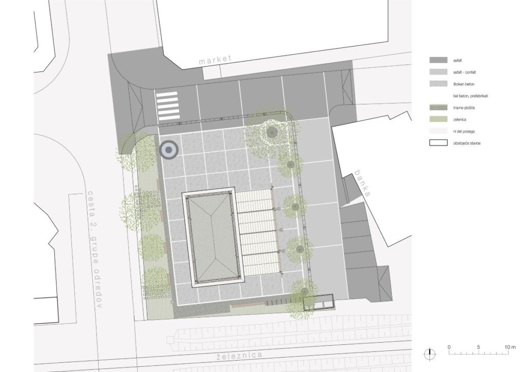 Tržnica je ob robovih zamejena z novima drevoredoma odpornih gledičij, stara lipa na vogalu pa poudarjena z okroglo betonsko klopco okoli debla. Ortogonalna mreža v tlaku je izvedena iz prefabriciranih belih betonskih elementov, med katerimi so kvadratne ploskve brušenega sivega betona. Bela mreža v tlaku se širi čez mejo tržnice na cesto ob robu trga.
