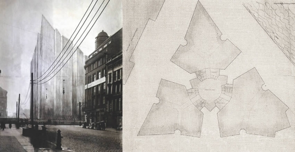 Miesov precedenčni natečajni projekt je temeljil na ideji popolne konstrukcijske razbremenitve fasadnega ovoja hiše; kar pomeni, da bi bil ovoj nebotičnika v celoti izdelan iz stekla. Fasada bi torej lahko postala popolnoma transparentna oziroma refleksivna, odvisno od kota, s katerega gledaš, in trenutka v dnevu, v katerem gledaš v objekt. Inspiracija za tako radikalno zasnovan nebotičnik naj bi se porodila ob opazovanju nedokončanih ameriških nebotičnikov. Jeklene konstrukcije brez fasadnega ovoja so Miesa tako navdušile, da je zasnoval objekt, pri katerem je jeklena konstrukcija le prekrita s steklom. Za razliko od tehnokratske fasade je tloris nebotičnika, ki zavzema kristalu podobno obliko, veliko bolj ekspresiven.