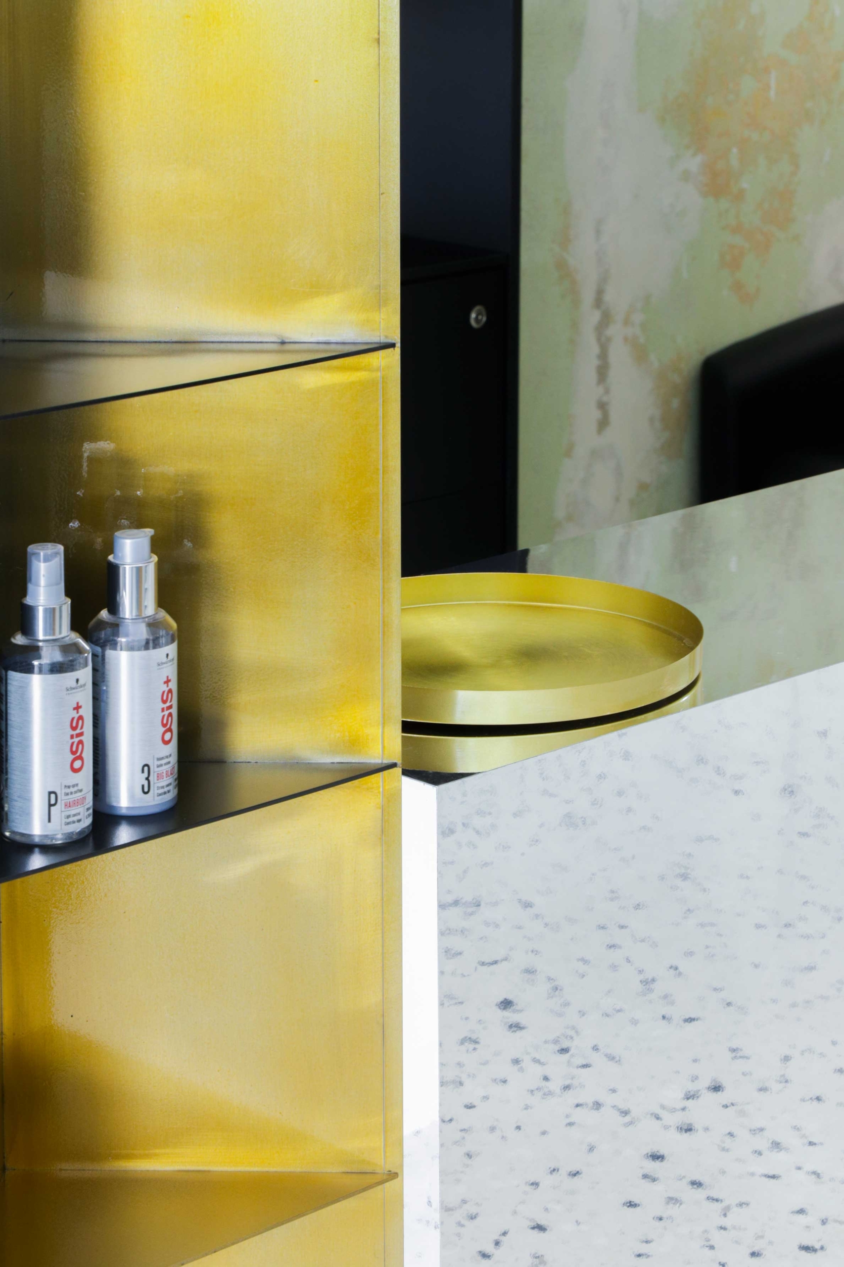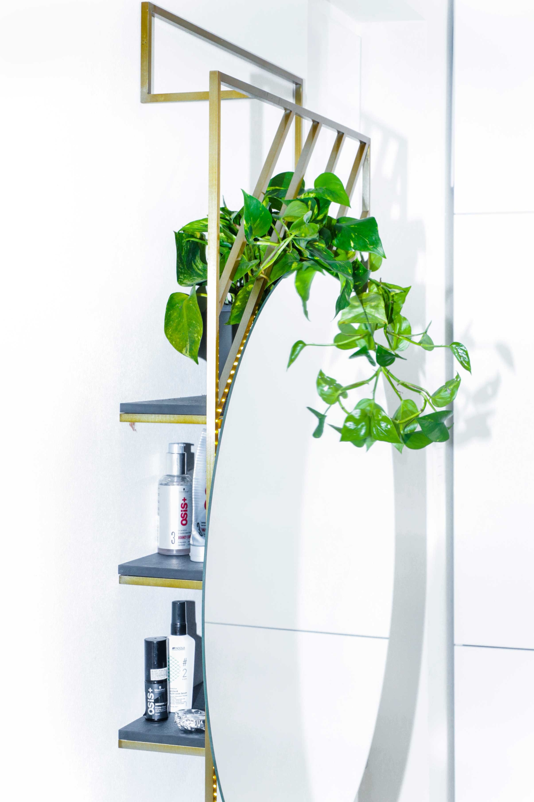 Duhovita izjava so okrogla ogledala, okoli katerih se prepletajo zelene rastline. Njihove vitice, listi in poganjki spominjajo na neukročene kodre, ki obkrožajo človeški obraz. Arhitektka je prej razdrobljen prostor z odpiranjem vmesnih sten spremenila v eno samo pretočno celoto, s predelnim pultom pa tloris vseeno smiselno razdelila na koridor za zaposlene in del za obiskovalce. Prek velike zasteklitve salon komunicira z zunanjostjo in je podaljšek javnega prostora. V tem pogledu se salon želi dotakniti značaja staromodne mestne brivnice, kjer se izmenjujejo mnenja in kjer se pomenkuje o novicah.