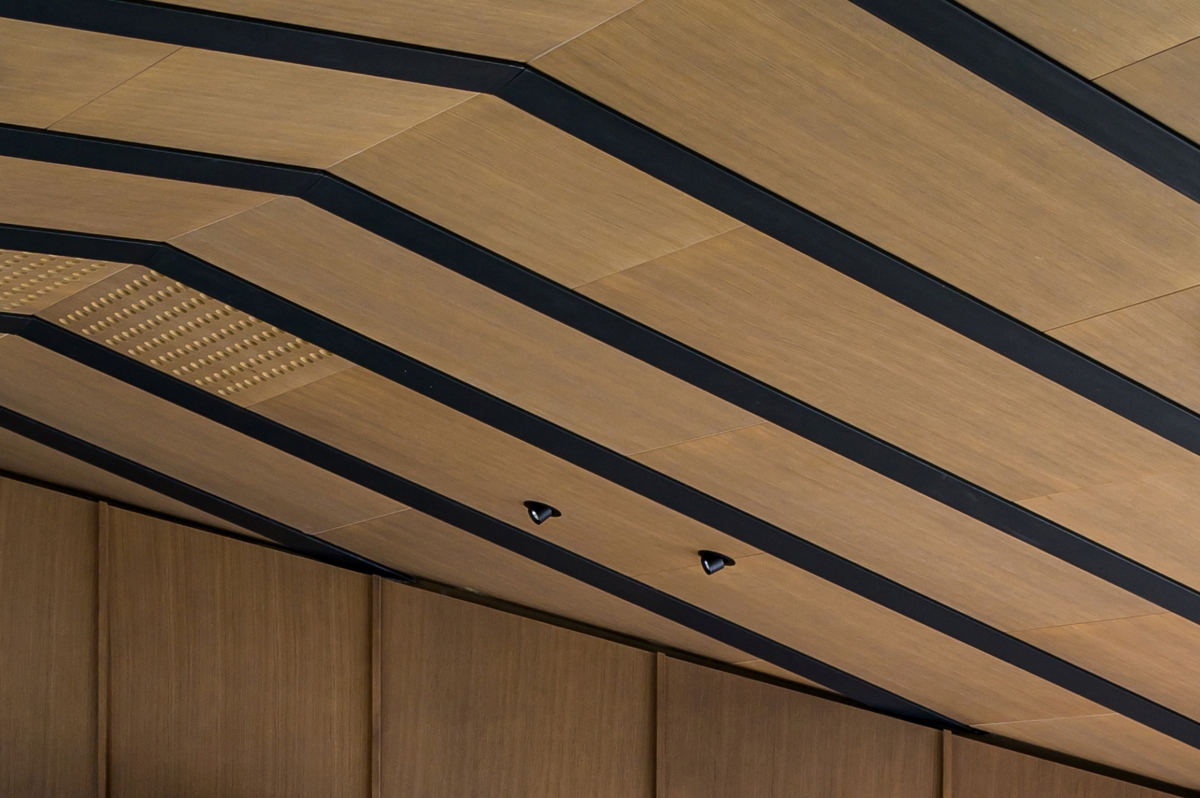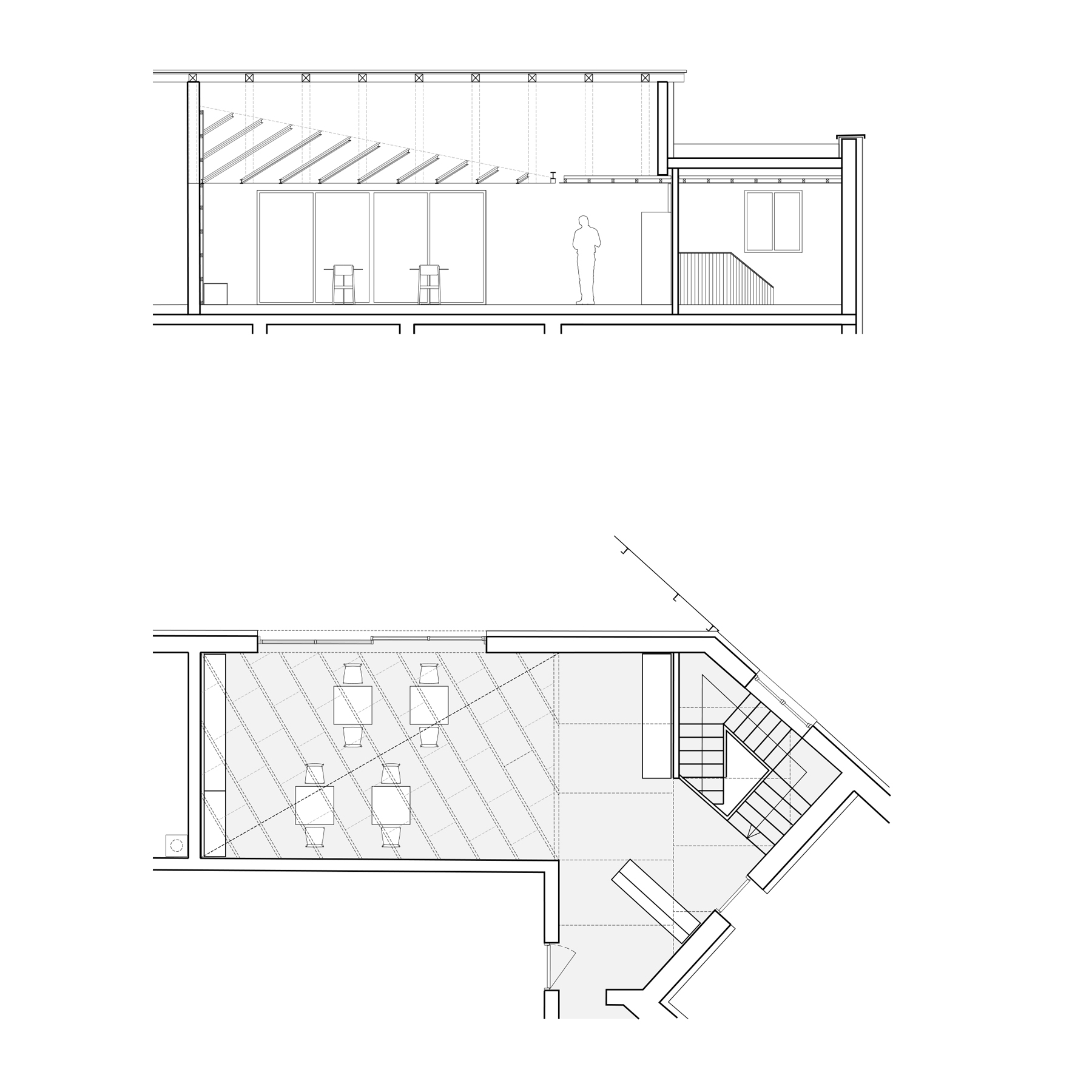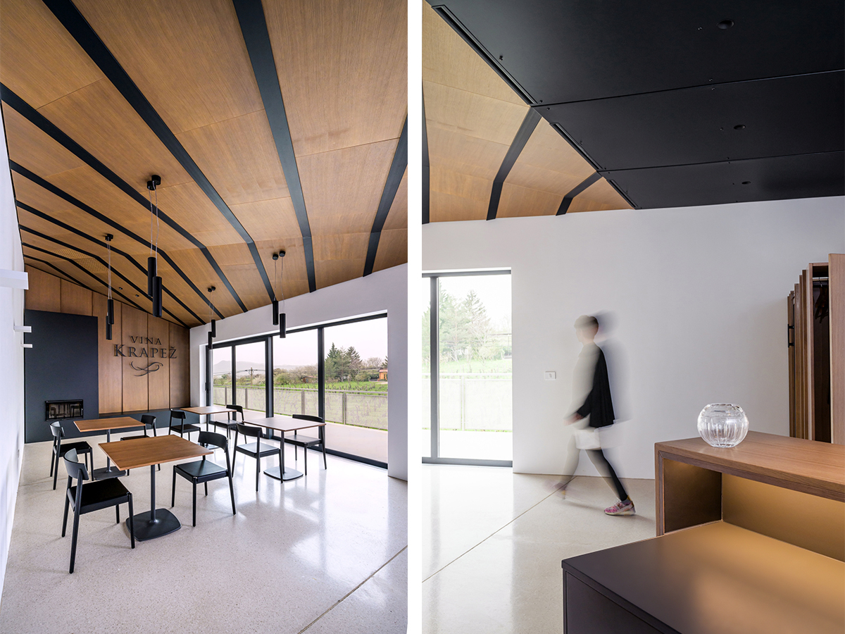 Osnovna poteza ureditve je spuščen strop, ki s svojo strukturo razločuje dva dela interierja: vstopno stopnišče s šankom na eni strani in degustacijski del s pogledi na okoliško pokrajino in izhodom na teraso. Spuščen strop ima funkcijo skrivanja zahtevnih strojnih inštalacij. Diagonalno poševno sleme nad večjim prostorom uvaja geometrijsko interpretacijo tradicionalne opečnate strehe, ravni strop iz temne kovine nad vhodnim delom pa tvori dialog v kontrastu.