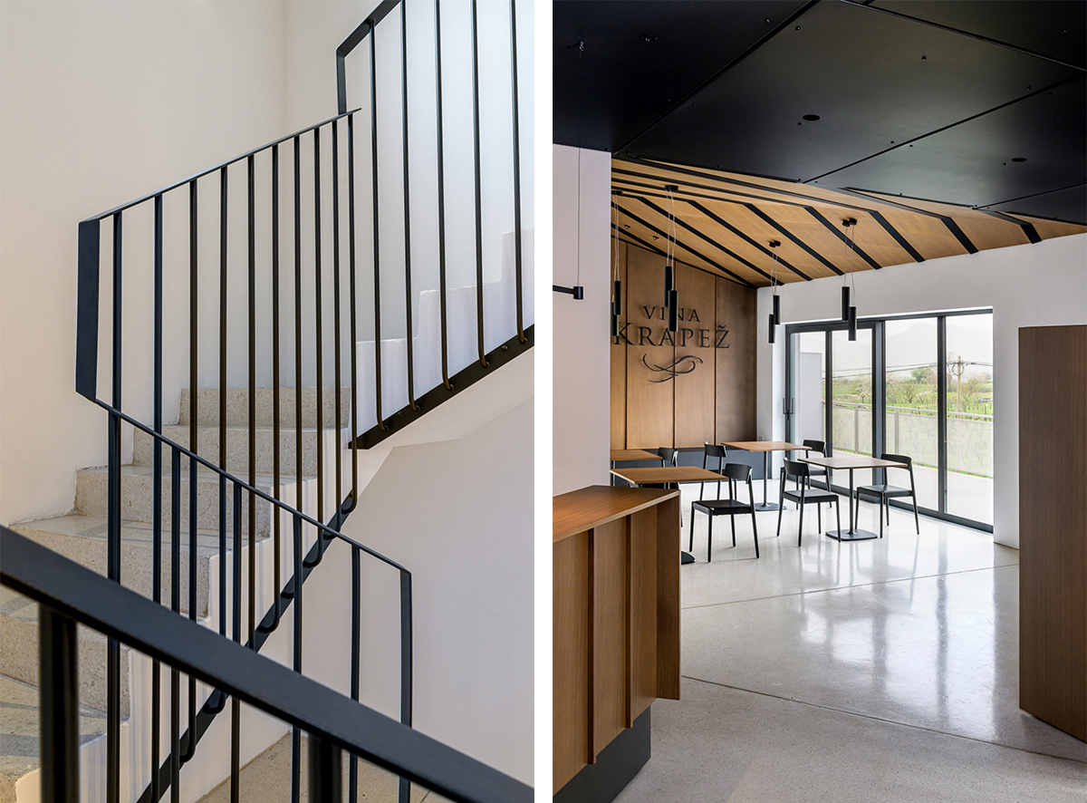 Klasični materiali, kot so dimljen masiven hrast, temna kovina in teraco, ustvarjajo eleganten interier z zadržanimi, a dovršenimi detajli. »Novi prostor je refleksija okušanega vina,« povzame arhitektka.