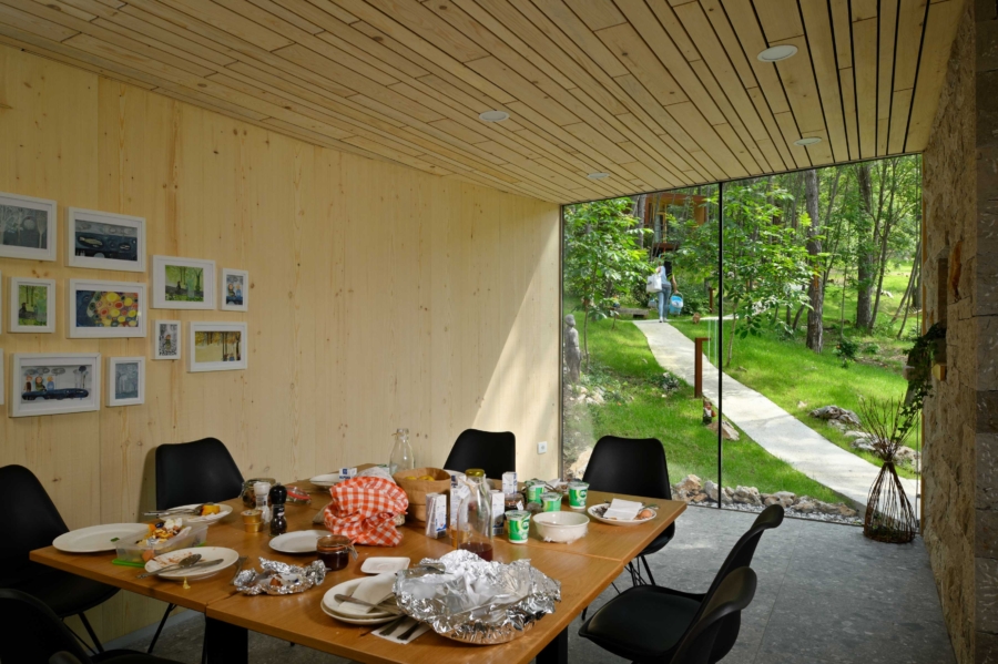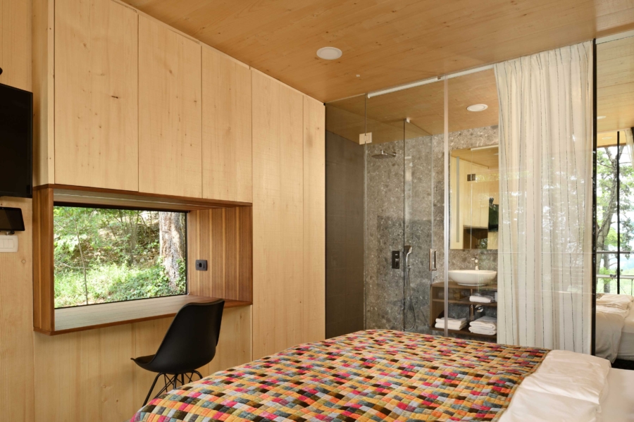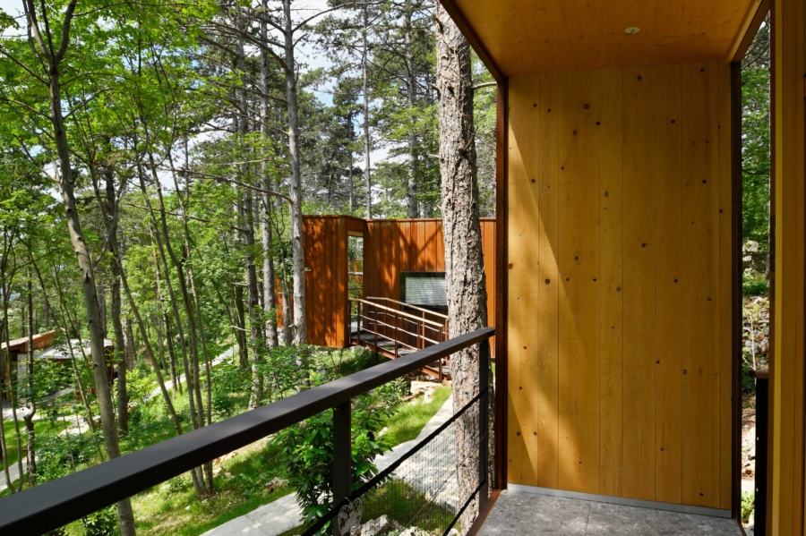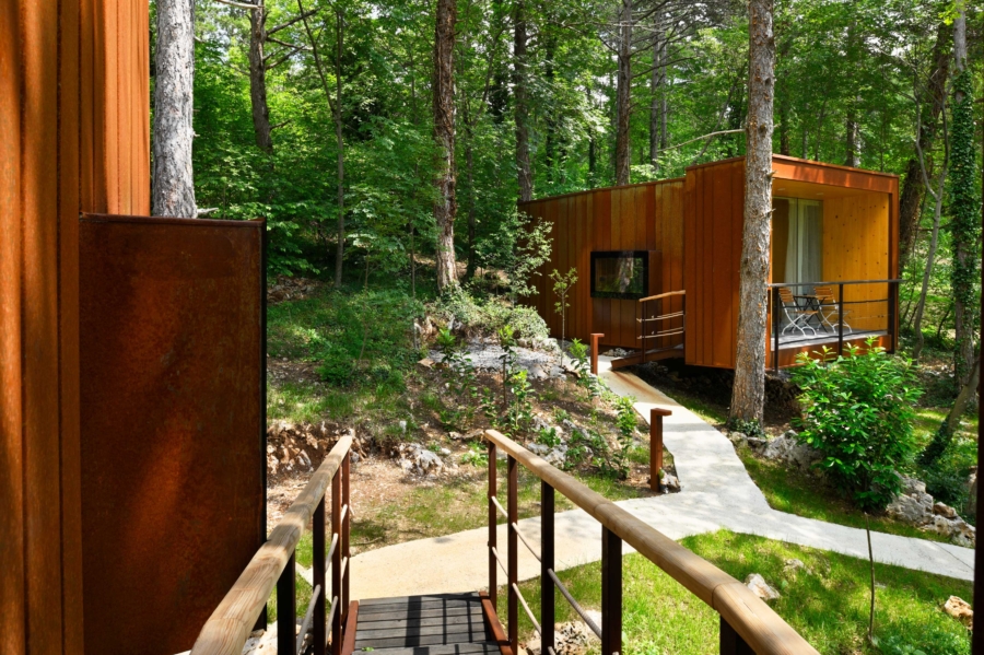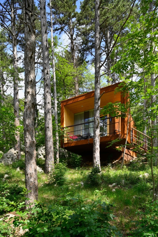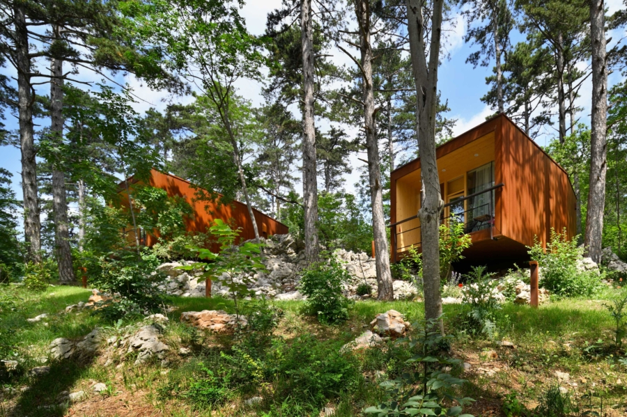 Notranjost počitniških objektov je zasnovana preprosto in domačno. Interier zaznamuje raba svetlega smrekovega lesa, zaradi katerega so hiške svetle in prijetno dišijo po lesu. Na zunanji fasadi smreko dopolnjuje korten. Tloris je preprost in se izogiba pretirani delitvi prostorov, ki bi manj kot 30m2 velikim hišicam vlila občutek utesnjenosti.