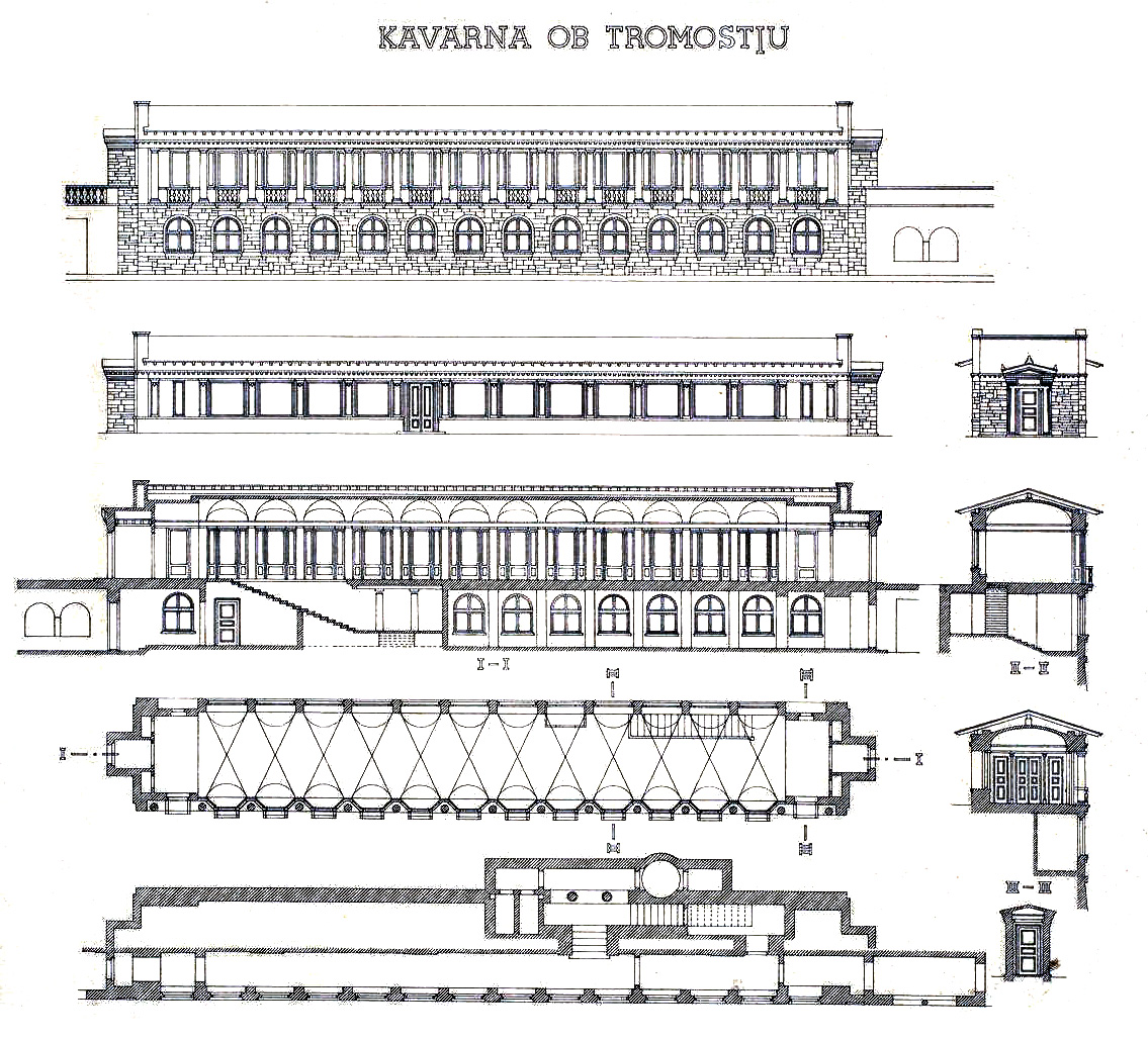 Plečnik je bil v svojih idejah in zamislih še veliko bolj velikopotezen kot v realiziranih delih. Ko je urejal središče Ljubljane s Tromostovjem in tržnicami, so bile njegove ambicije veliko večje. Za območje, kjer je danes živilska tržnica, je izdelal načrte za novi magistrat. Predvidel je monumentalni Mesarski most, ki bi bil po površini skoraj tako velik kot stolnica. Načrtoval pa je tudi novo kavarno ob Prešernovem spomeniku. Eden od vhodov v kavarno bi stal prav na mestu, kjer je danes kiosk. Kavarno si je zamislil kot zastekljeno lopo s strukturirano fasado ob Ljubljanici. V spodnji etaži se je načrtovani objekt približal Ljubljanici, podobno kot pri potezi tržnic. Skozi kavarno bi potekala promenada ob reki. Stopnišče med nivojema bi bilo izpeljano podobno, kot ga je oblikoval pri kavarni Makalonca. Dva stebra bi uokvirila pogled na vodo. Kavarna bi definirala rob Prešernovega trga in ustvarila prehod na nabrežje. Če bi bila kavarna ob Tromostovju zgrajena, bi bila nedvomno še ena izmed velikih Plečnikovih mojstrovin.