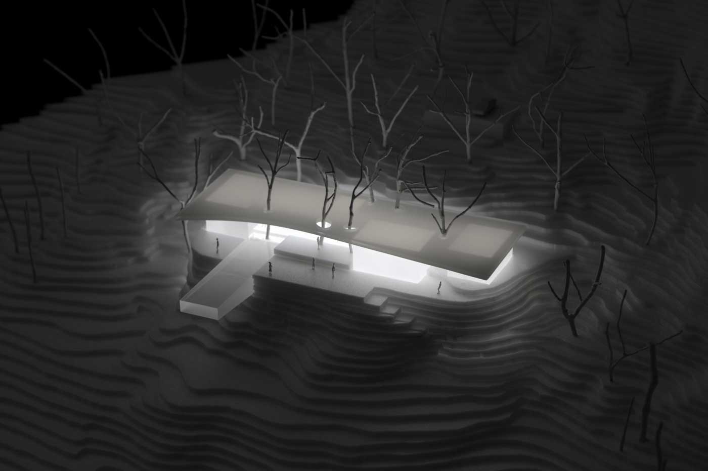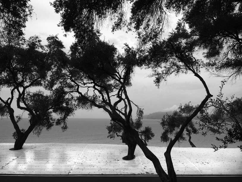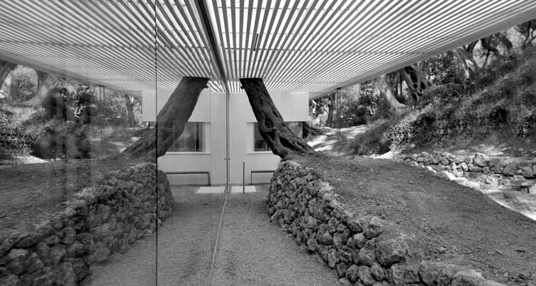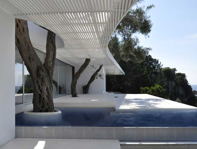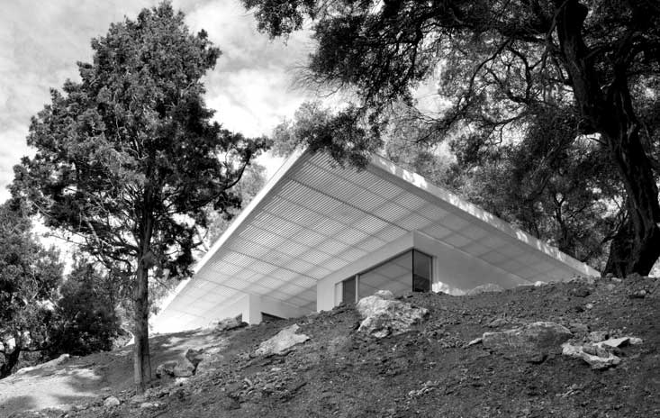 Oblikovanje počitniškega doma na Jonskem morju je zahtevalo smiselno in občutljivo arhitekturno strategijo, da je bilo mogoče izkoristiti specifične podnebne pogoje in naravne okoliščine, ki jih zaznamujejo deževne zime, močno sončno obsevanje in visoke temperature v poletnih mesecih. Prosojna parabolična lesena krošnja v kombinaciji z drevesnimi listi zagotavlja senco in zavetje, hkrati pa udoben, zavarovan, fluiden prostor za celodnevno bivanje na prostem ali v notranjosti.
