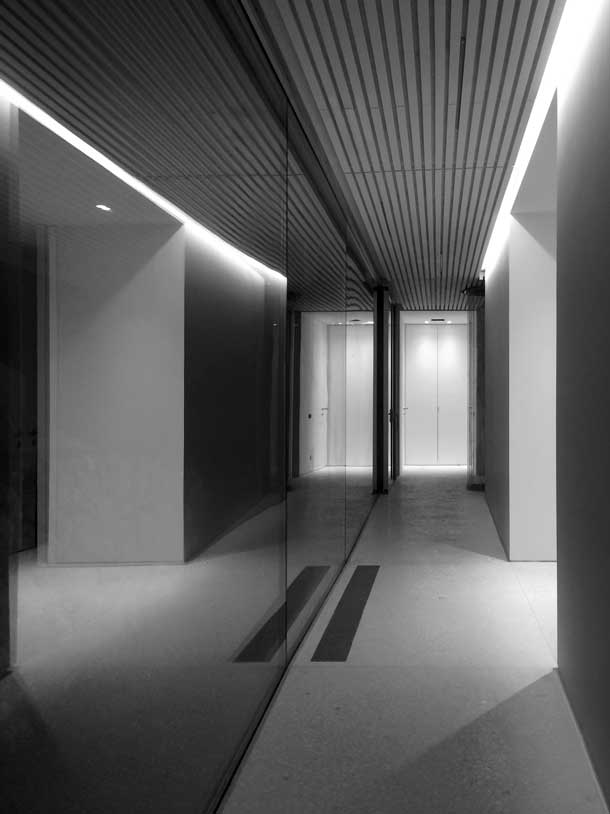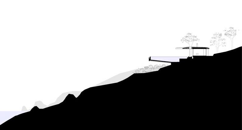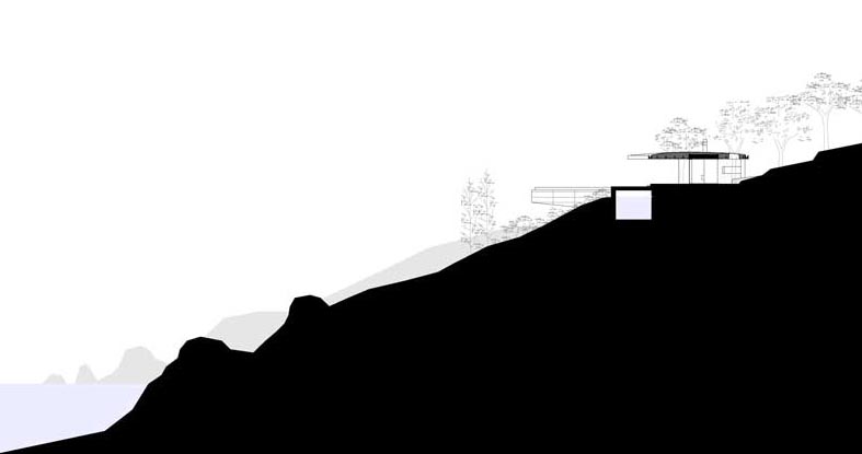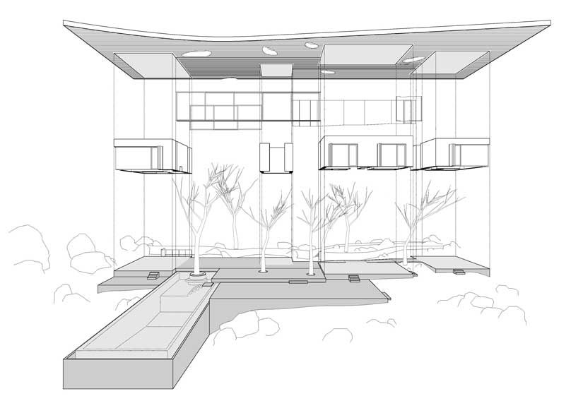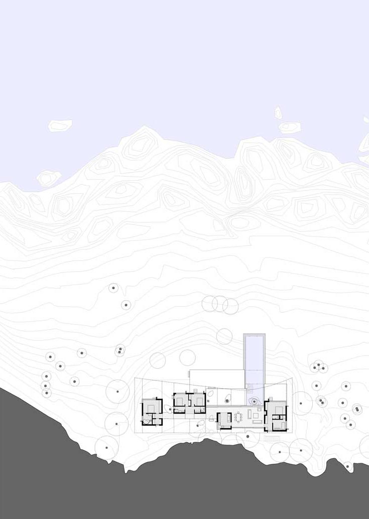Tlorisno je hiša zasnovana s serijo platform, ki združujejo bivalne vzorce za družino na počitnicah; hkrati intimo in odprtost, komunikacijo. Zasebni prostori, ki vključujejo spalnice in mokre prostore, so organizirani znotraj štirih samostojnih volumnov, vmesni prostori pa so namenjeni bivalnim površinam. Te so navidezno podaljšane skozi velike zastekljene površine. Pravokotno na 9 metrov dolgo linearno hišo je konzolno umeščen 18-metrski plavalni bazen, poravnan s horizontom morja.