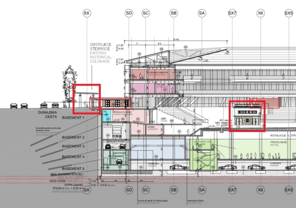 Razmerje med novim in starim, med varovanjem (ali rekonstruiranim) in »dodanim« je lepo razvidno iz prereza. Zdi se mi, da ta zadošča za učinkovito predstavo tako strokovnjaka kot laika, kaj je jedro projekta. Da bi lahko ilustriral, kaj so (tako ohranjeni kot rekonstruirani) elementi Plečnikovega stadiona, sem jih moral označiti z debelo rdečo črto, drugače bi se v masah novogradnje popolnoma izgubili. Klobuk snamem pred človekom, ki bi si upal javno zagovarjati tak prerez kot model varovanja dediščine.