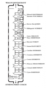 Najbolj legendarni vlak verjetno ostaja Orient ekspres; najbolj legendarni film, ki se dogaja na vlaku, je zato zasluženo Umor na Orient ekspresu prve dame detektivskega romana Agathe Christie. Knjigi je priložen celo natančen načrt vagona, v katerem potuje belgijski detektiv Hercule Poirot in v katerem se zgodi umor iz naslova. Načrt je genialni primer iluzije sodelovanja bralca pri reševanju umora.