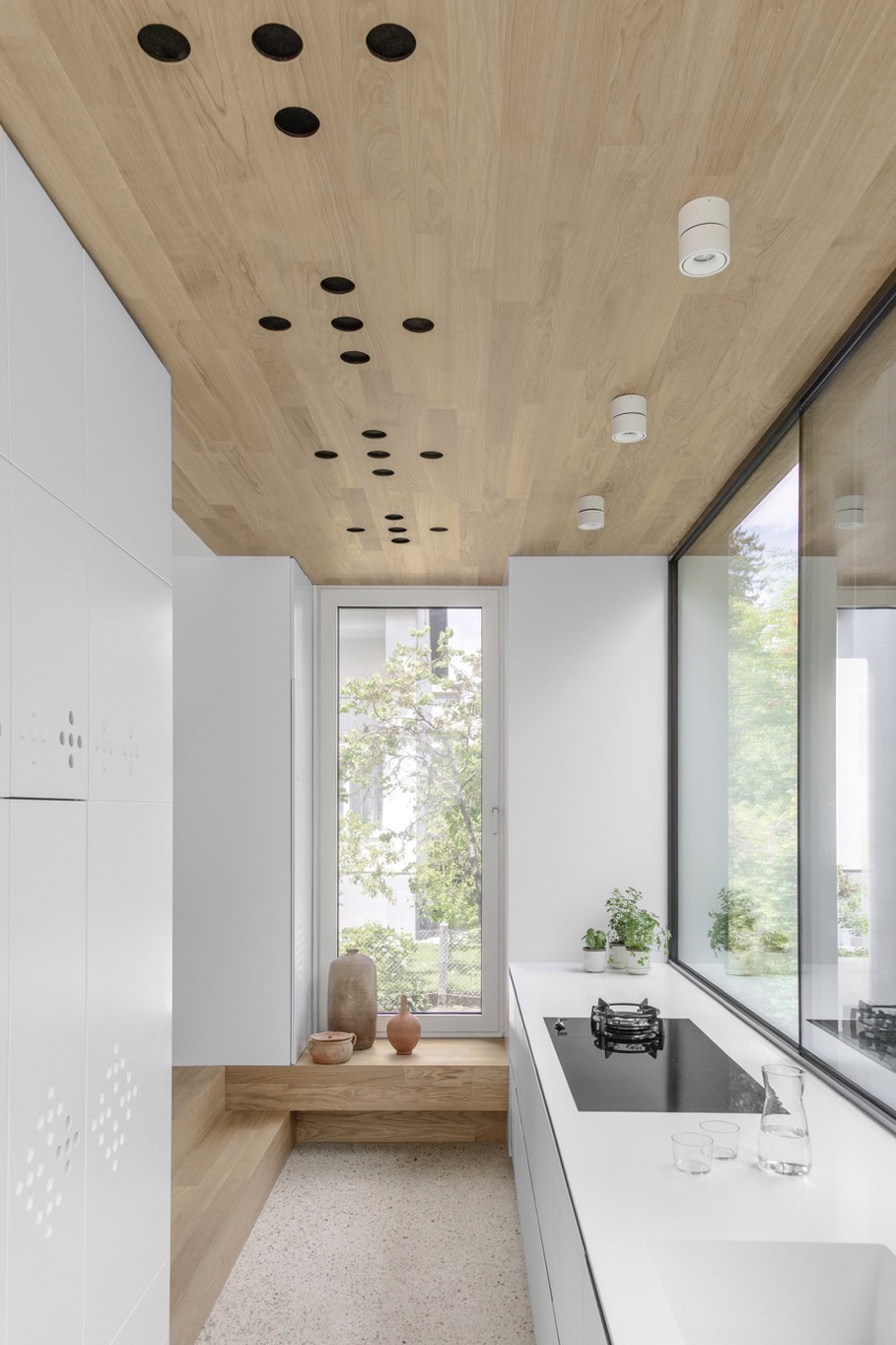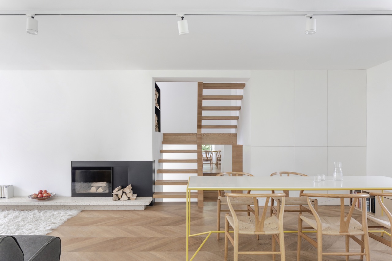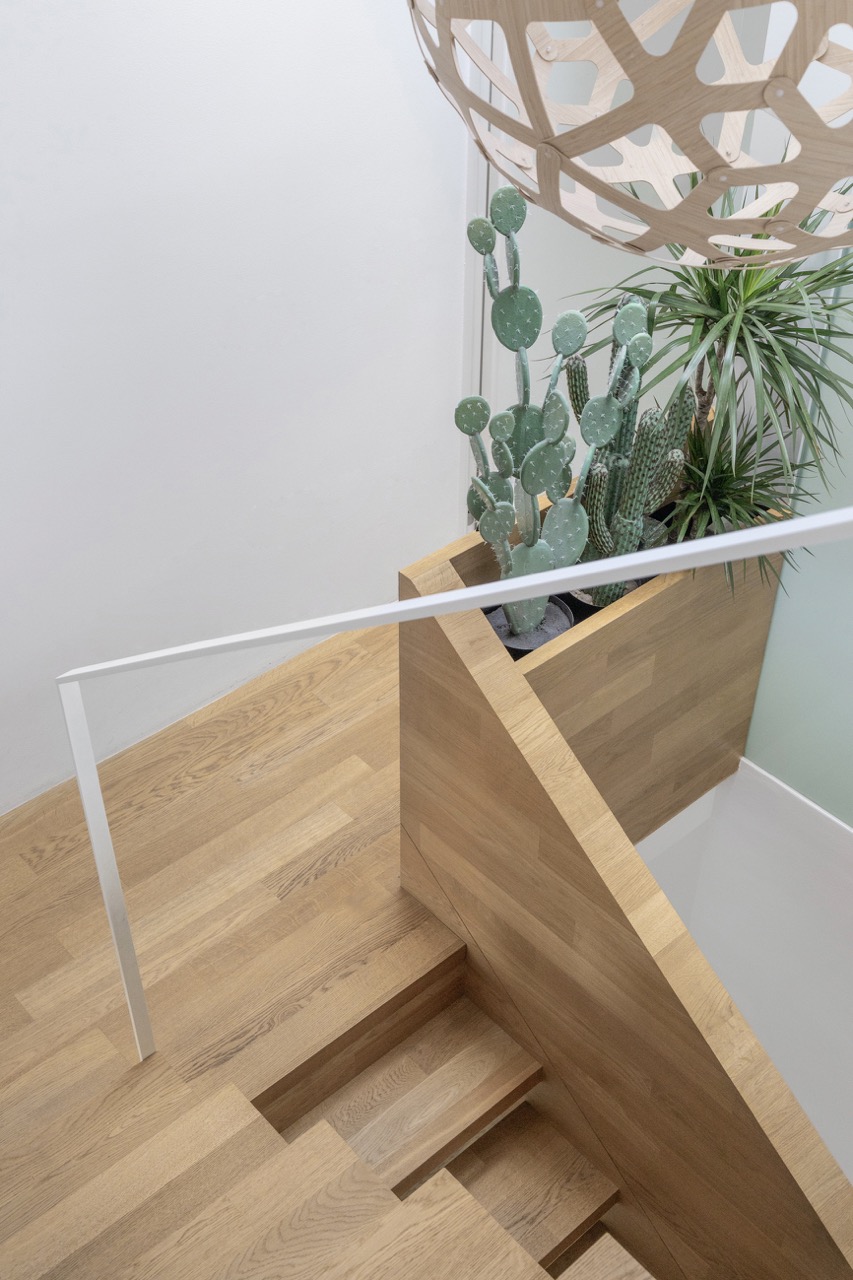 S prenovo so arhitekti 6 medetaž preoblikovali v enovit vertikalen prostor z osrednjim odprtim stopniščem, ki odpira poglede in vizualno povezuje posamezne prostore. Z izbranimi materiali, barvami in teksturami so želeli še nadgraditi idejo prepletanja prostora in doseči vizualne učinke, ki z minimalnimi posegi ključno prispevajo k boljši osvetljenosti in večjemu občutku prostornosti. Vizualni jezik prenove je estetski in preprost, s kombinacijo lesa in belih sten pa ustvari svetel in domačen interier. S premišljeno reorganizacijo programa so si arhitekti prizadevali za maksimalen izkoristek uporabnega prostora v vsaki medetaži. Prenovo interierja dopolnjuje dozidava pritličnega prizidka s kuhinjo ob severovzhodnem robu objekta, ki s preprostim gabaritom in umirjeno zunanjo podobo ne preglasi prvotnega izraza vrstne hiše.