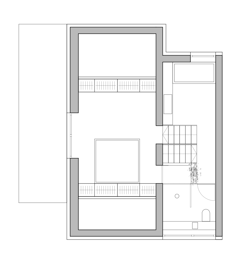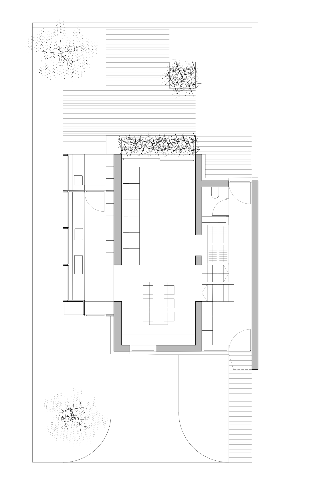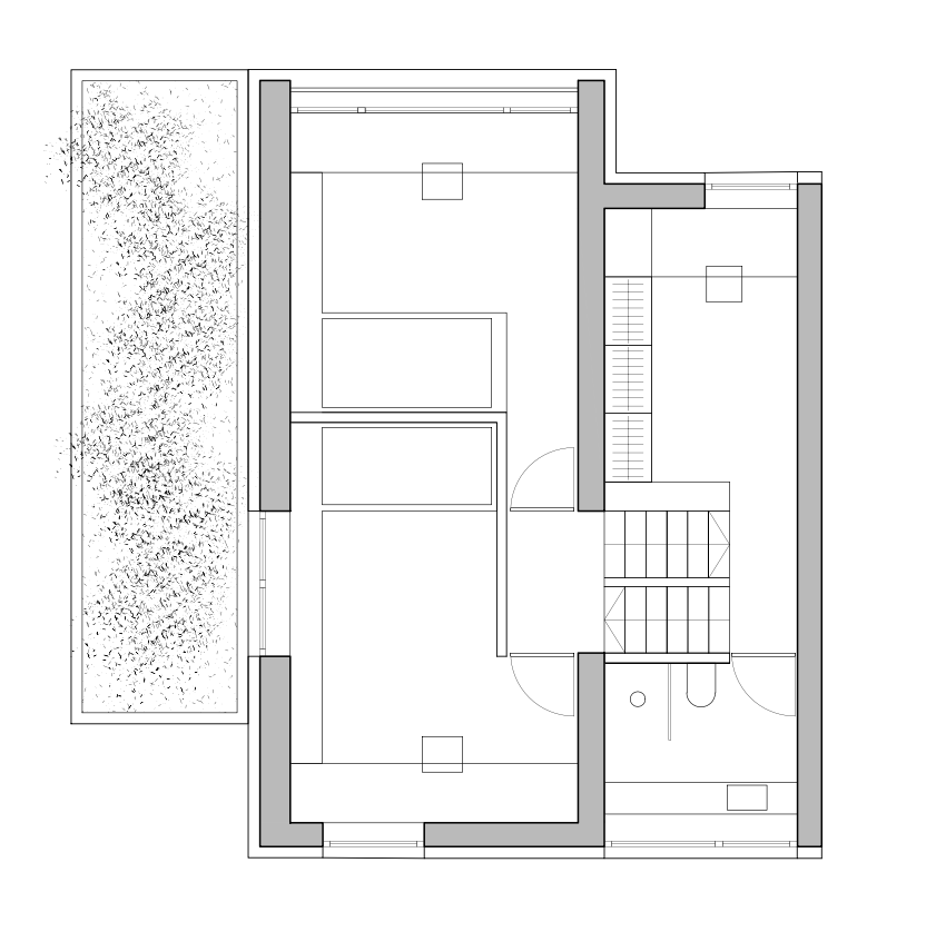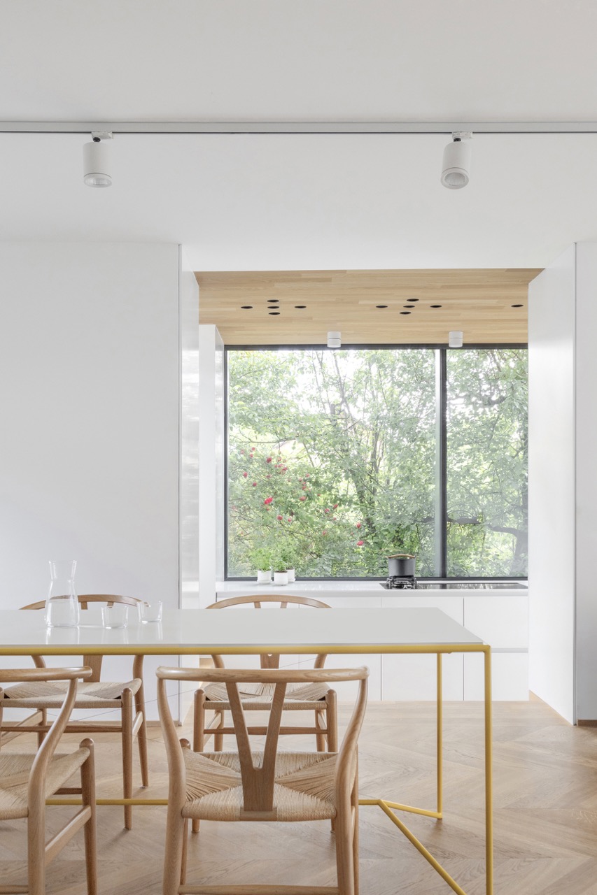 S prenovo so arhitekti 6 medetaž preoblikovali v enovit vertikalen prostor z osrednjim odprtim stopniščem, ki odpira poglede in vizualno povezuje posamezne prostore. Z izbranimi materiali, barvami in teksturami so želeli še nadgraditi idejo prepletanja prostora in doseči vizualne učinke, ki z minimalnimi posegi ključno prispevajo k boljši osvetljenosti in večjemu občutku prostornosti. Vizualni jezik prenove je estetski in preprost, s kombinacijo lesa in belih sten pa ustvari svetel in domačen interier. S premišljeno reorganizacijo programa so si arhitekti prizadevali za maksimalen izkoristek uporabnega prostora v vsaki medetaži. Prenovo interierja dopolnjuje dozidava pritličnega prizidka s kuhinjo ob severovzhodnem robu objekta, ki s preprostim gabaritom in umirjeno zunanjo podobo ne preglasi prvotnega izraza vrstne hiše.