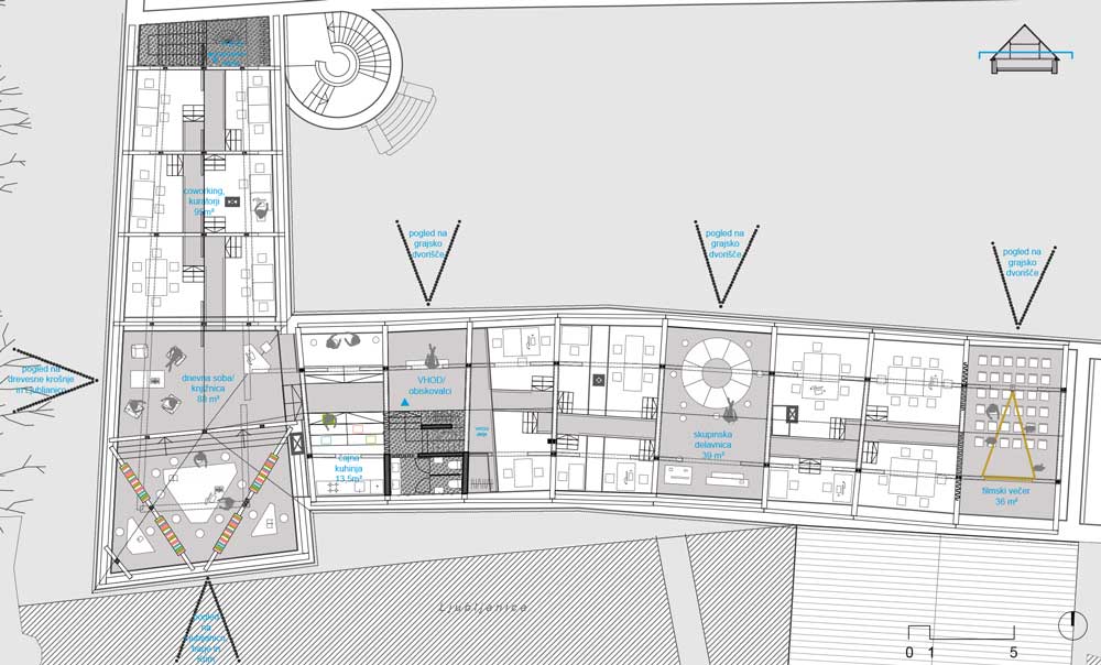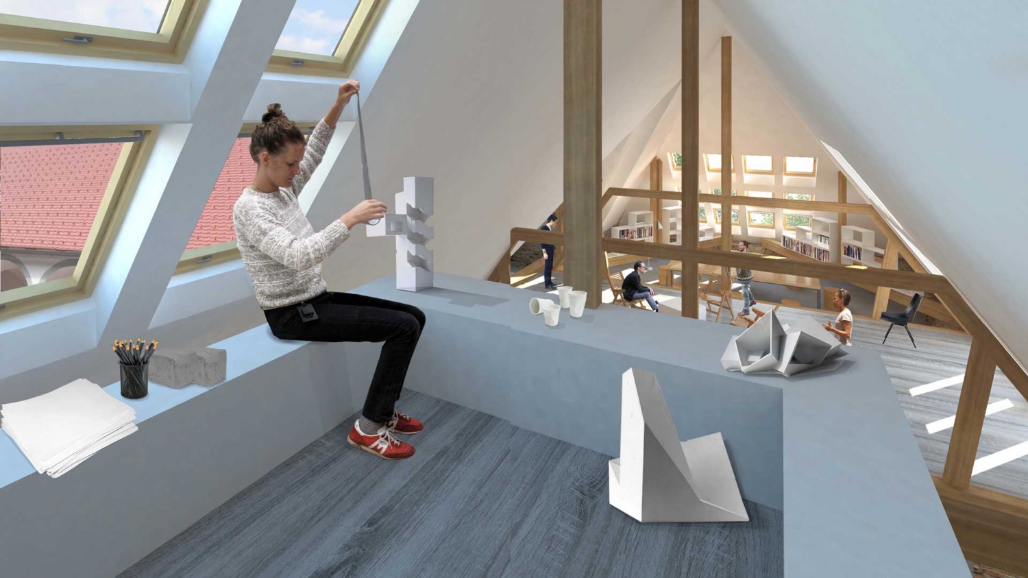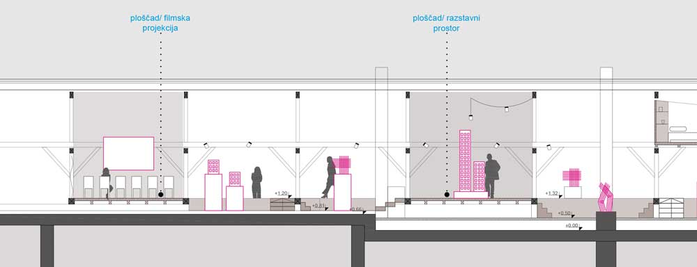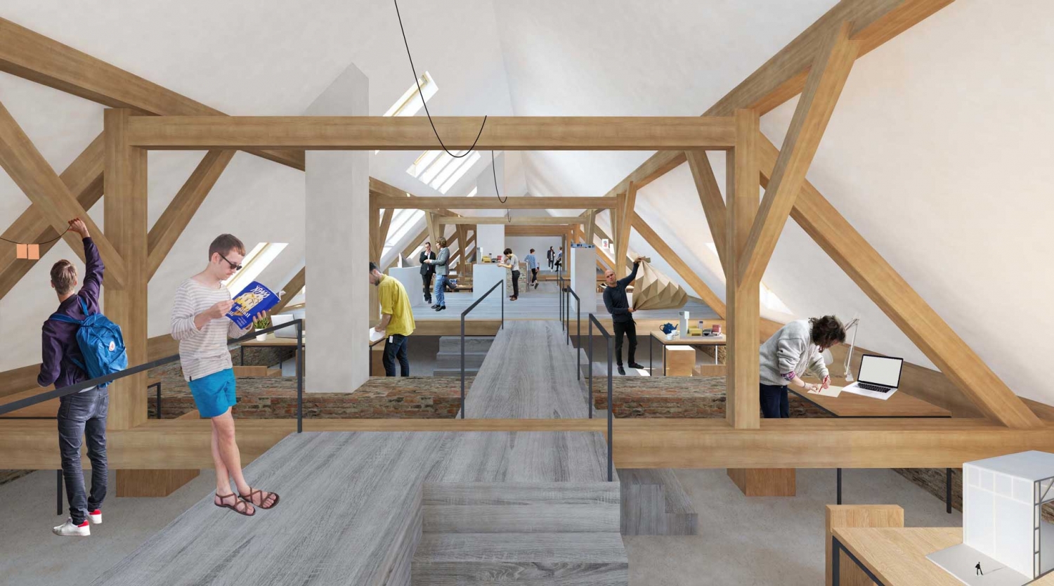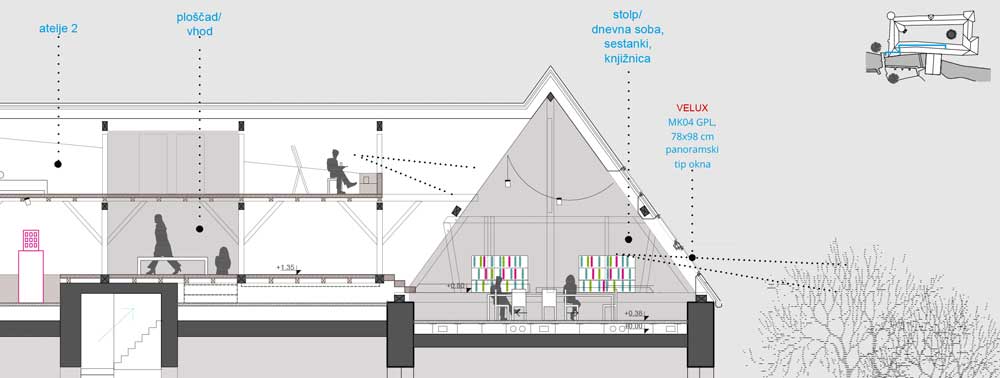 Projekt je pri odločitvi, da ne bo posegal v obstoječo konstrukcijo ostrešja, radikalno neinvaziven. V svojem predlogu izkorišča danosti konstrukcije in na podlagi teh ustvarja sekvenco ploščadi in mostov. Ta ustvarjajo kontinuirano enonivojsko pot skozi podstreho, v kateri uporabi raumplanovsko razgibanost tudi za umeščanje programa. Da bi izkoristil prostor pod potjo, ustvari inovativno pohištvo, ki je spravljeno v njenem tlaku, kar omogoča različne uporabnosti danega prostora na preprost način, hkrati pa sprosti dodatne površine po višini prostora. Programe umesti logično in po premisleku. Predlog legalizira trenutno stanje in s tem nedvomno doseže kriterij izvedljivosti. Njegova ključna pomanjkljivost je, da fiksira programske sklope glede na danosti obstoječega prostora, zaradi česar je manj prilagodljiv pri uporabi, kot pa tisti predlogi, ki s posegom v konstrukcijo pridobijo stojno višino.