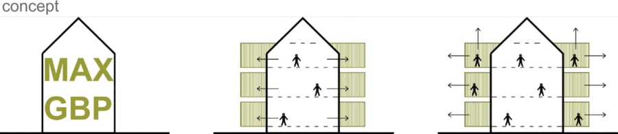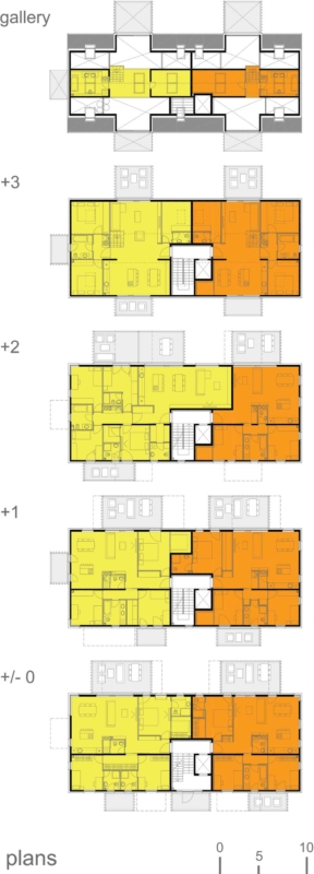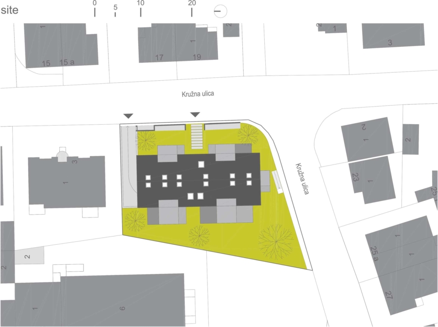 Na stiku med notranjim in zunanjim prostorom se torej stanovanja v večstanovanjski stavbi Kružna podaljšujejo v mesto. Stanovanja so bila v grobem zasnovana in razdeljena, arhitekti pa so jih nato individualizirali in preuredili po željah bodočih lastnikov. Vsaka izmed bivalnih enot ima kar dva izhoda v zunanjost, relativno majhna površina jedra in odsotnost hodnika pa zagotavljata, da so stanovanja prostorna in izkoristek prostora v hiši optimalen.