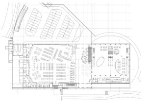 Preprost zunanji izgled objekta v sebi skriva premišljeno zasnovo, ki je naročnikove programske smernice in zahteve po kapacitetah spretno izvedla znotraj številnih omejitev lokacije. Sorazmerno majhna površina, znatne potrebe po parkirnih mestih, omogočanje pogledov preko objekta, centralna mestna lega ter padajoč teren so bili okviri, ki so definirali center. Ta se od tipičnih nakupovalnih središč razlikuje že v samem bistvu. Gre za »poizkus arhitekturnega soočanja z vedno bolj perečim problemom nakupovalnih centrov.«1 Nakupovanje se že desetletja iz središč seli na obrobja mest, na poceni zemljišča izven naselij. S povečano mobilnostjo prebivalstva so razdalje postale zanemarljive, večji nakupi manjkrat tedensko po nižjih cenah pa bolj smiselni. Z ameriških tal je trend prišel tudi v Slovenijo, vse prevečkrat pa v prostoru pomeni stihijsko gradnjo, podrejeno kapitalu, ki se v zasnovi komaj dotika arhitekturnih načel. Avtorja sta v Novem mestu predlagala prehoden in členjen volumen z neposrednim dostopom z več strani in nivojev, ki pušča pritličje javnim površinam, parkirišča pa skrije v kletne etaže. Radikalno sta se odmaknila od tipičnih vase zaprtih nakupovalnih centrov, obdanih s preprogo parkirišč, in ponudila bolj mestotvorno zasnovo. Nadgrajena je z raznolikim programom, ki center oživlja ob različnih delih dneva, saj združuje komercialne vsebine, poslovne in družabne prostore.