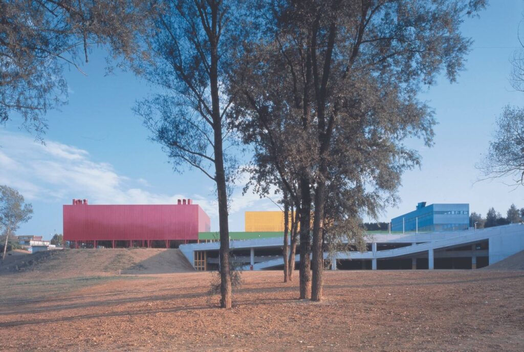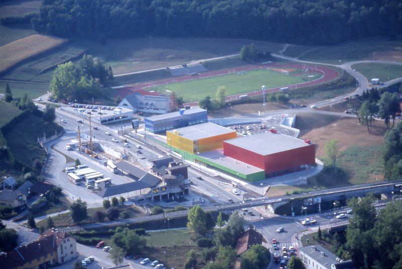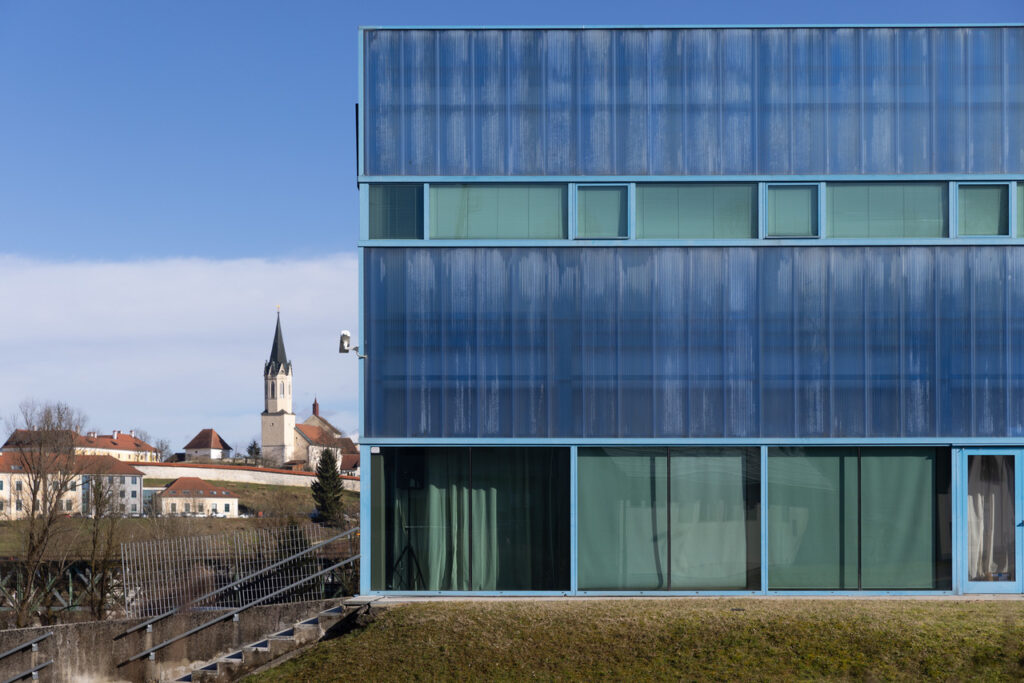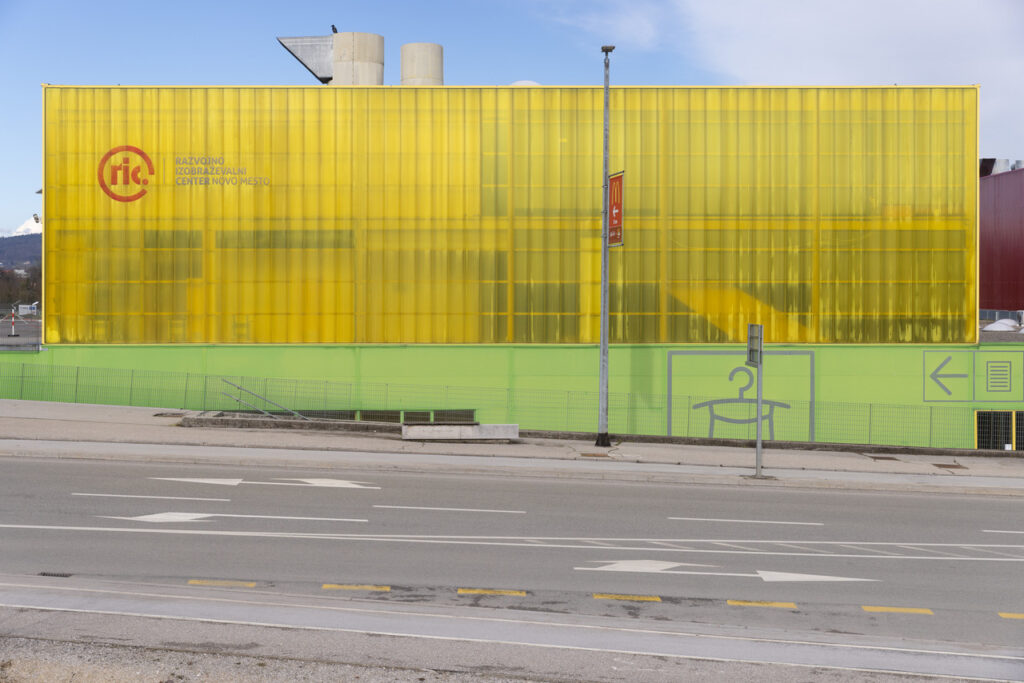 Trije kockasti kvadri, postavljeni na četrtega, bolj ploščatega, sestavljajo kompozicijo, ki je vstopni točki ob jugozahodni vpadnici v Novo mesto pred dvema desetletjema dodala svojevrsten pečat. Jasno delitev stavbne mase dodatno poudari tudi barvno kodiranje – vsak v svoji primarni barvi spominjajo na velikanske lego kocke. V prostoru je njihova igra zagotovo nekaj, kar izstopa. Lahkotni pisani volumni kompozicije sodelujejo v nenavadnem kolažu mikrolokacije.