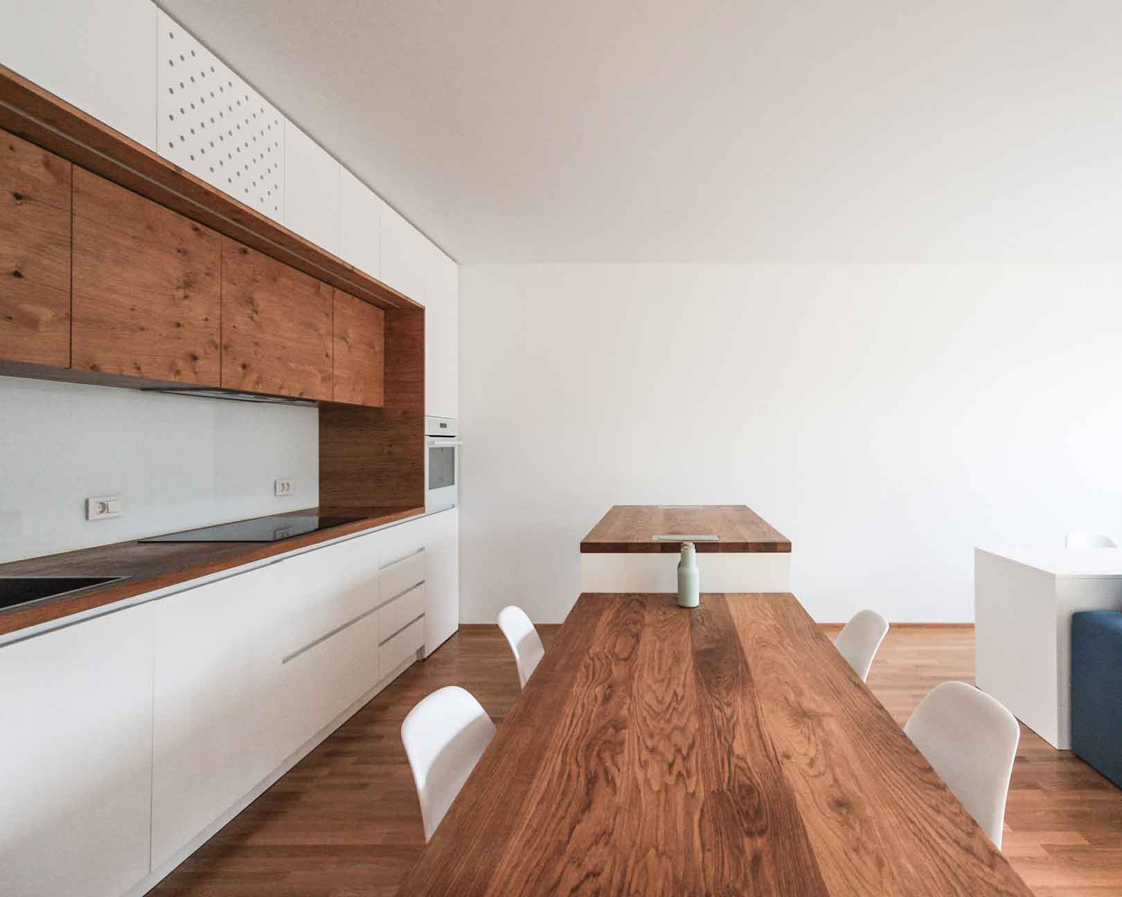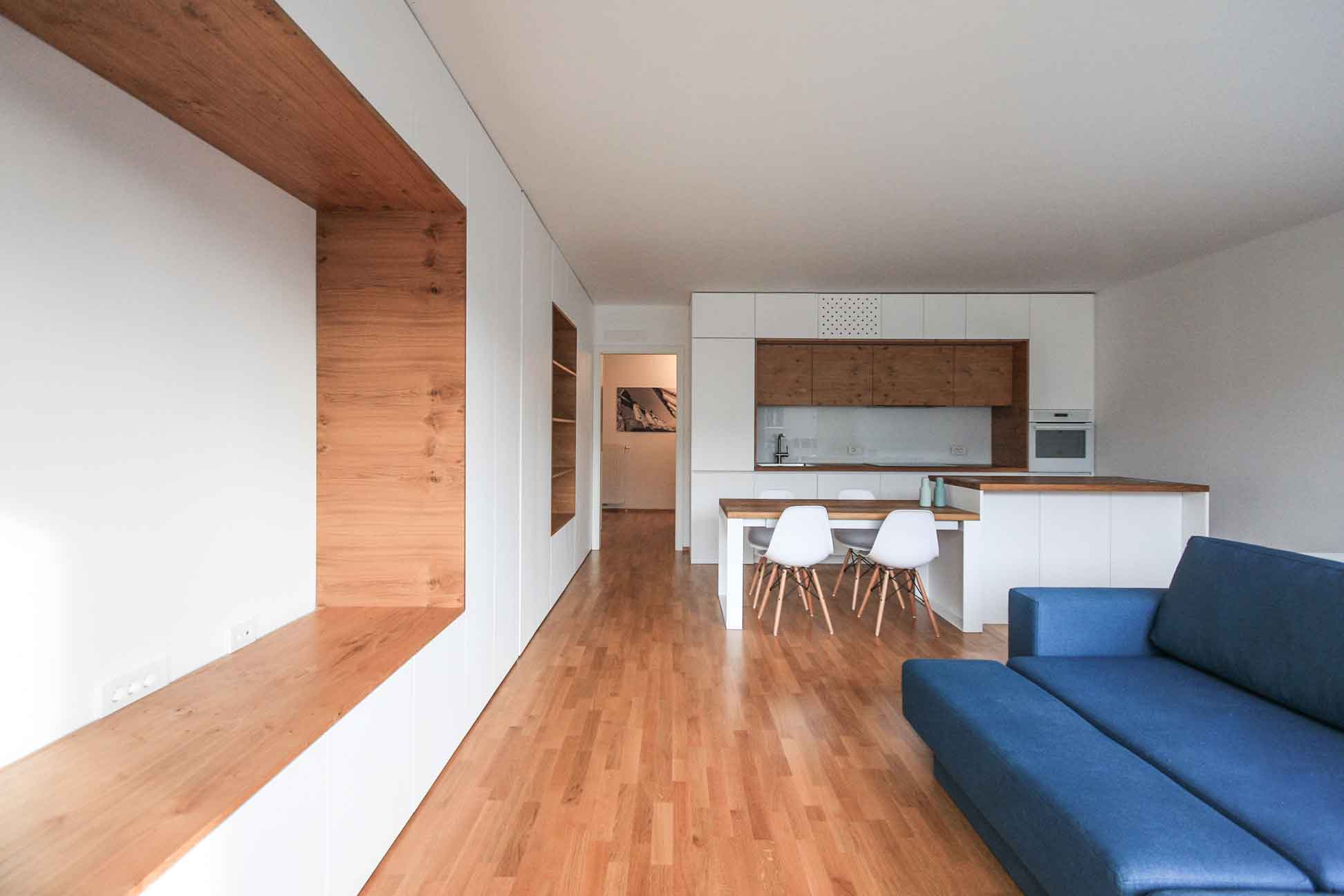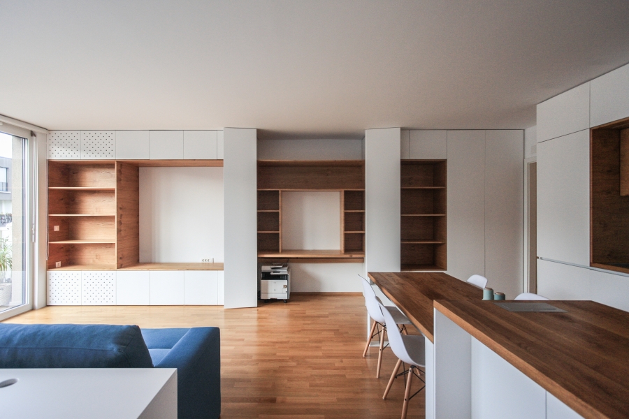 Naročniki so želeli svetlo in odprto stanovanje, zato v bivalnih prostorih prevladuje topla belina, ki jo dopolnjujejo leseni elementi. Ti so načrtno izbrani tako, da se tu in tam v lesu znajdejo majhne nepravilnosti, grče in zanimivi detajli, ki sicer minimalistično in na prvi pogled strogo zasnovo notranje opreme približujejo uporabniku. Kljub nerazsipni kvadraturi stanovanja je prostora dovolj, saj se arhitekt s pridom poslužuje rabe niš, ki prostor optično in funkcionalno povečajo. V omarah ob vzdolžni steni bivalnega prostora tako za drsnimi vrati najdemo odlično izkoriščen delovni kotiček.