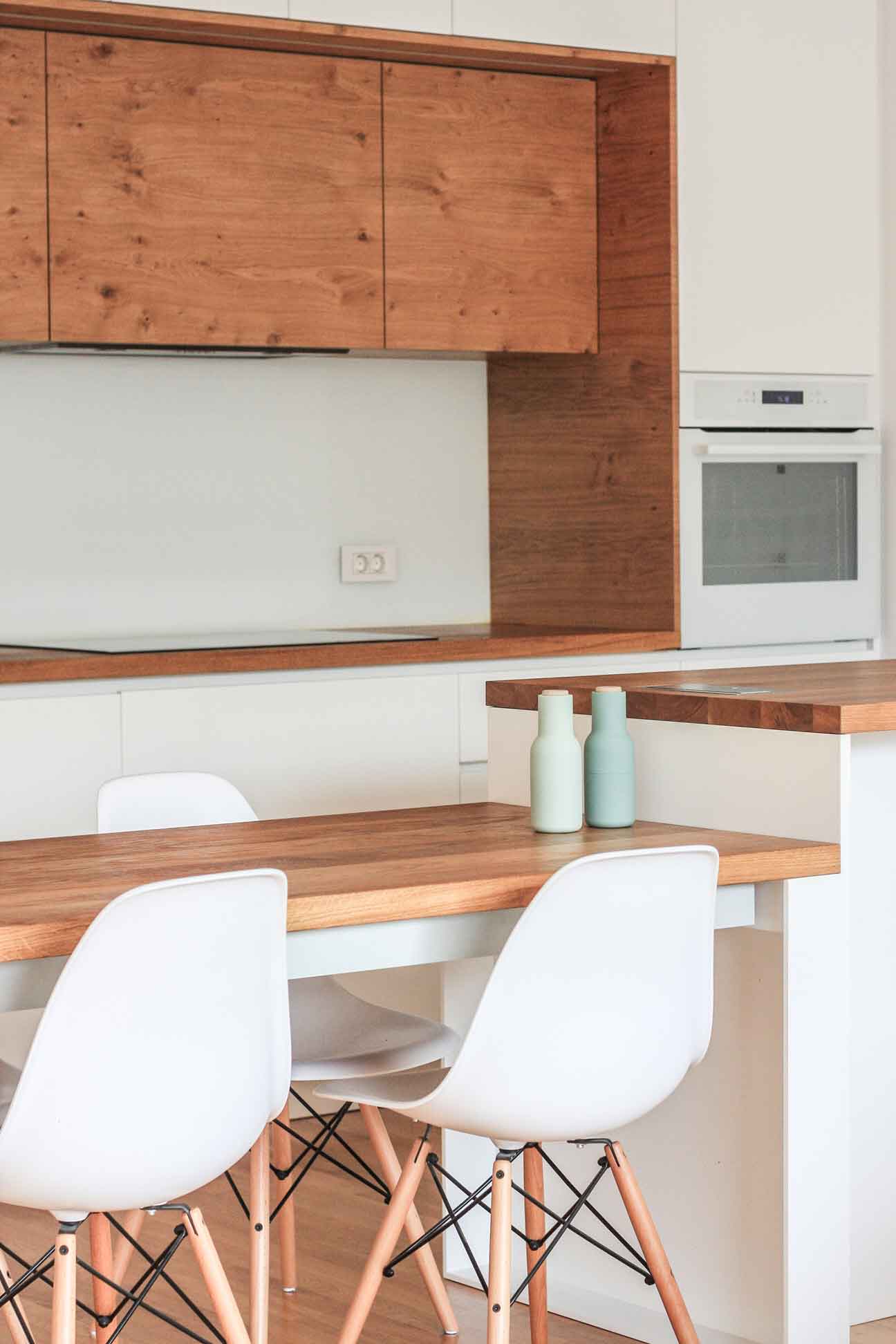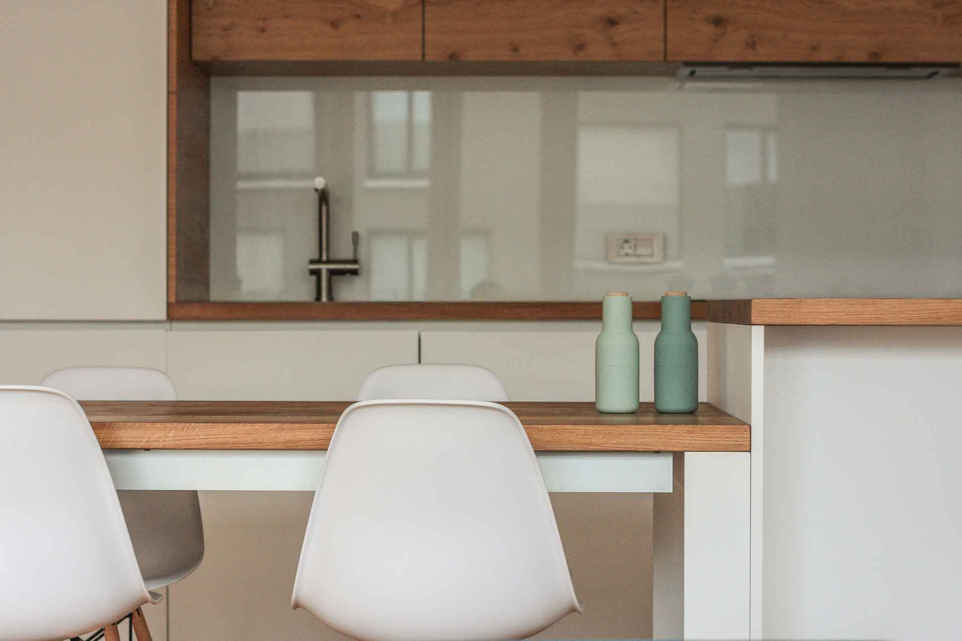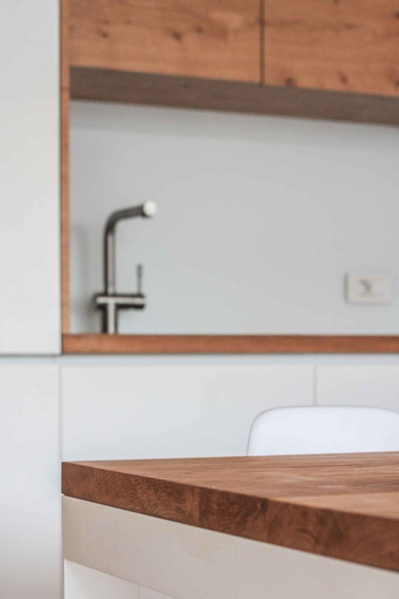 Naročniki so želeli svetlo in odprto stanovanje, zato v bivalnih prostorih prevladuje topla belina, ki jo dopolnjujejo leseni elementi. Ti so načrtno izbrani tako, da se tu in tam v lesu znajdejo majhne nepravilnosti, grče in zanimivi detajli, ki sicer minimalistično in na prvi pogled strogo zasnovo notranje opreme približujejo uporabniku. Kljub nerazsipni kvadraturi stanovanja je prostora dovolj, saj se arhitekt s pridom poslužuje rabe niš, ki prostor optično in funkcionalno povečajo. V omarah ob vzdolžni steni bivalnega prostora tako za drsnimi vrati najdemo odlično izkoriščen delovni kotiček.