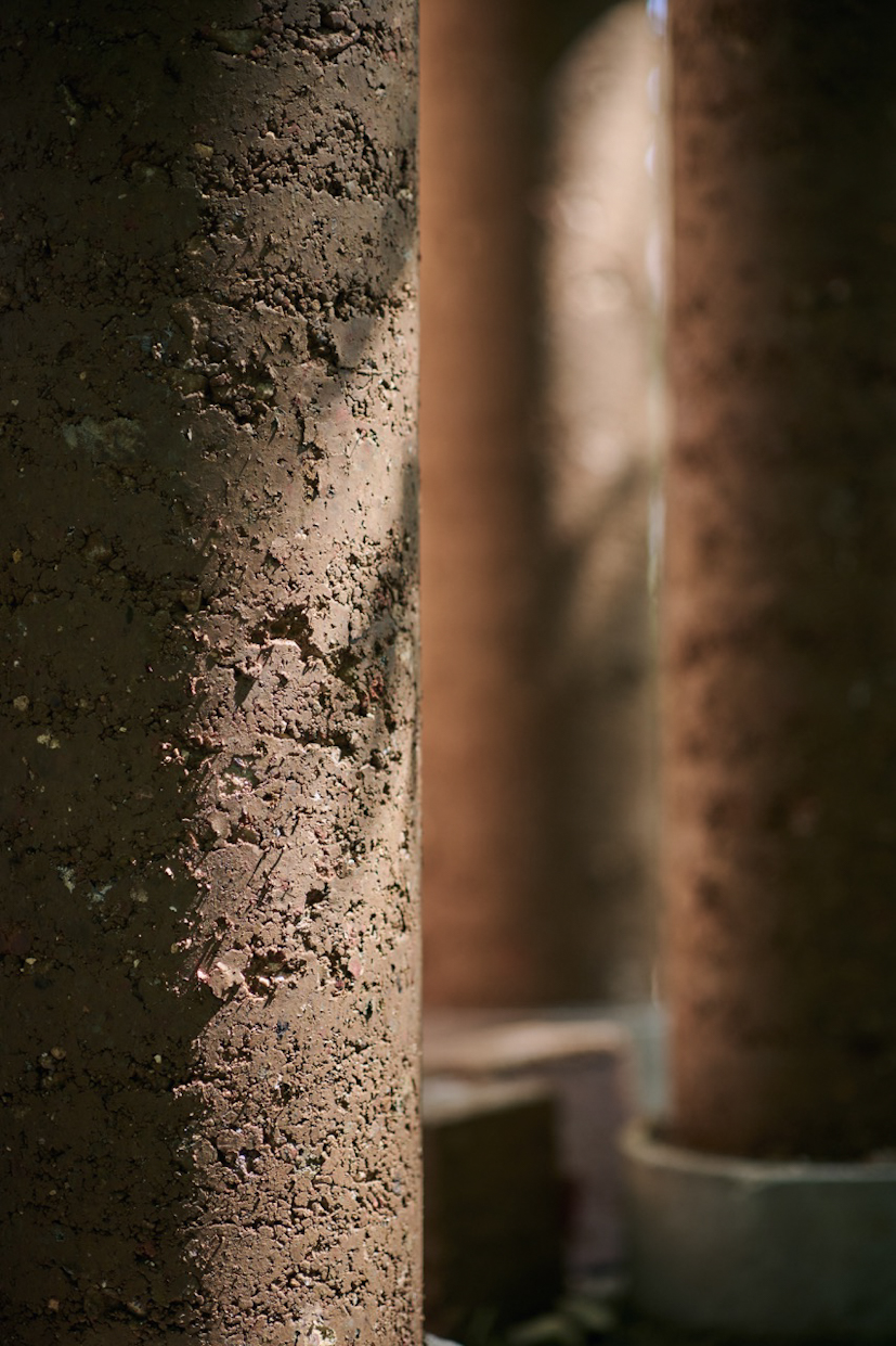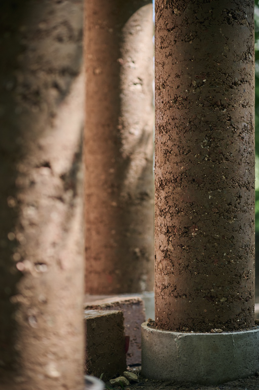 Stebrišče. Kako visoko in kako vitko lahko gradimo z zemljo? To je bilo eno od izhodiščnih vprašanj letošnjega paviljona. Drugo pa je bilo, kako lahko različni dodatki izboljšajo zemeljsko mešanico. Odločili smo se za stebre okroglega prereza, ker nimajo vogalov in je njihova površina enakomerno izpostavljena klimatskim vplivom. Premer stebra je le 30 cm. Tak steber je stabilen do višine dobrega metra. A želeli smo višje. Zato smo jedro ojačali z železnimi armaturnimi palicami. Pri višini dveh metrov so stebri stabilni in trdni. Sedem stebrov smo gradili sedem dni. V mešanico smo dodajali kokosova vlakna, ki za skoraj dvakrat povečajo tlačno trdnost materiala.