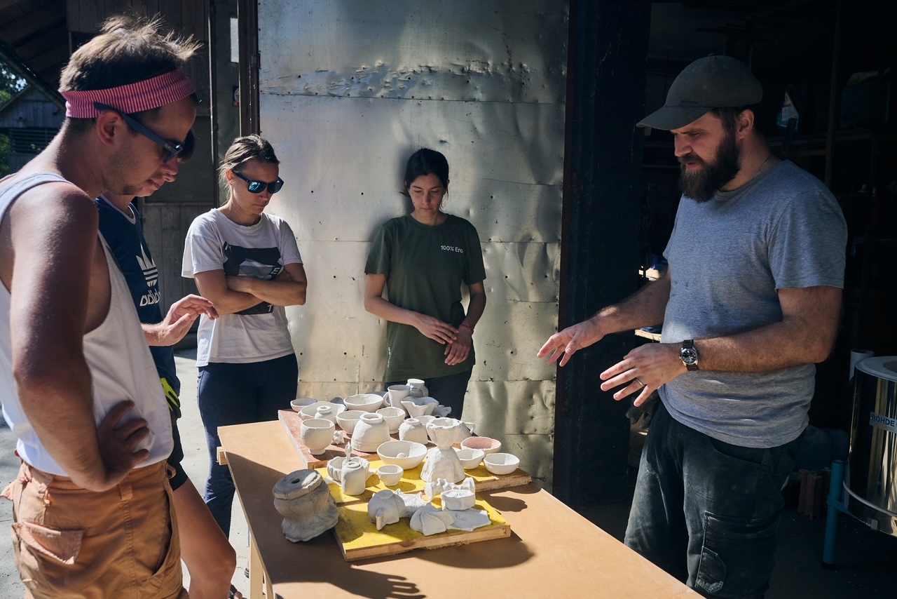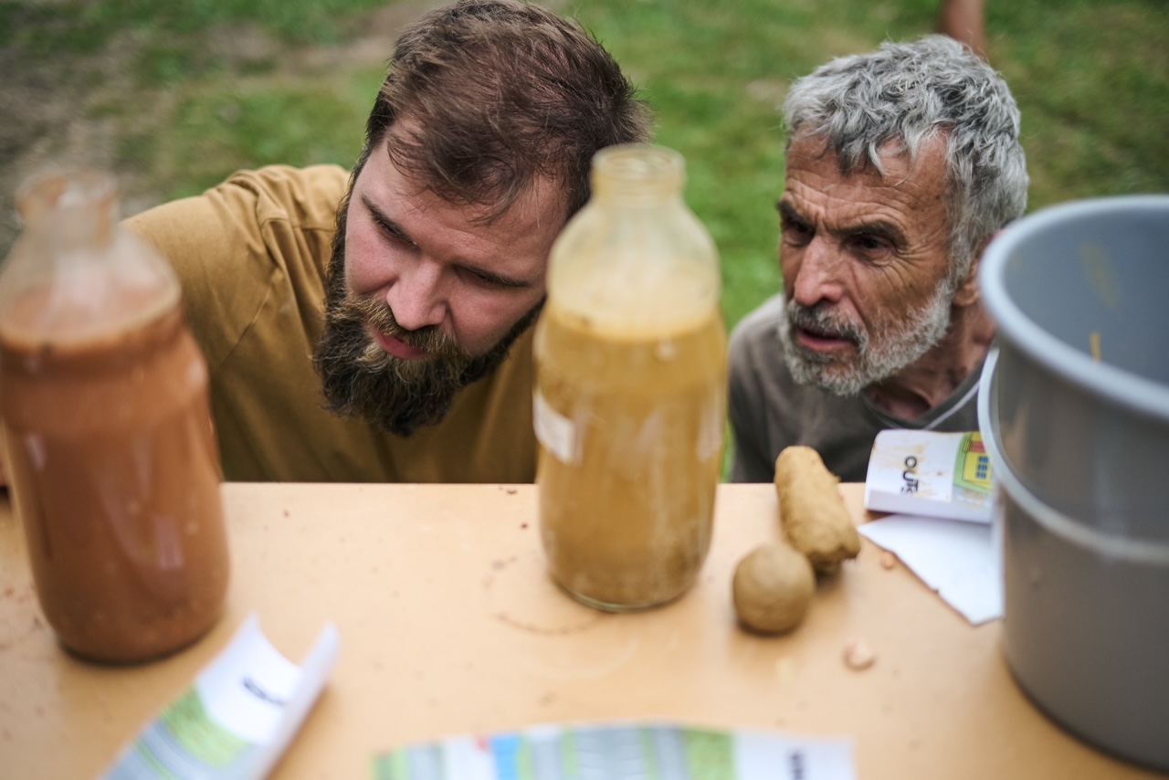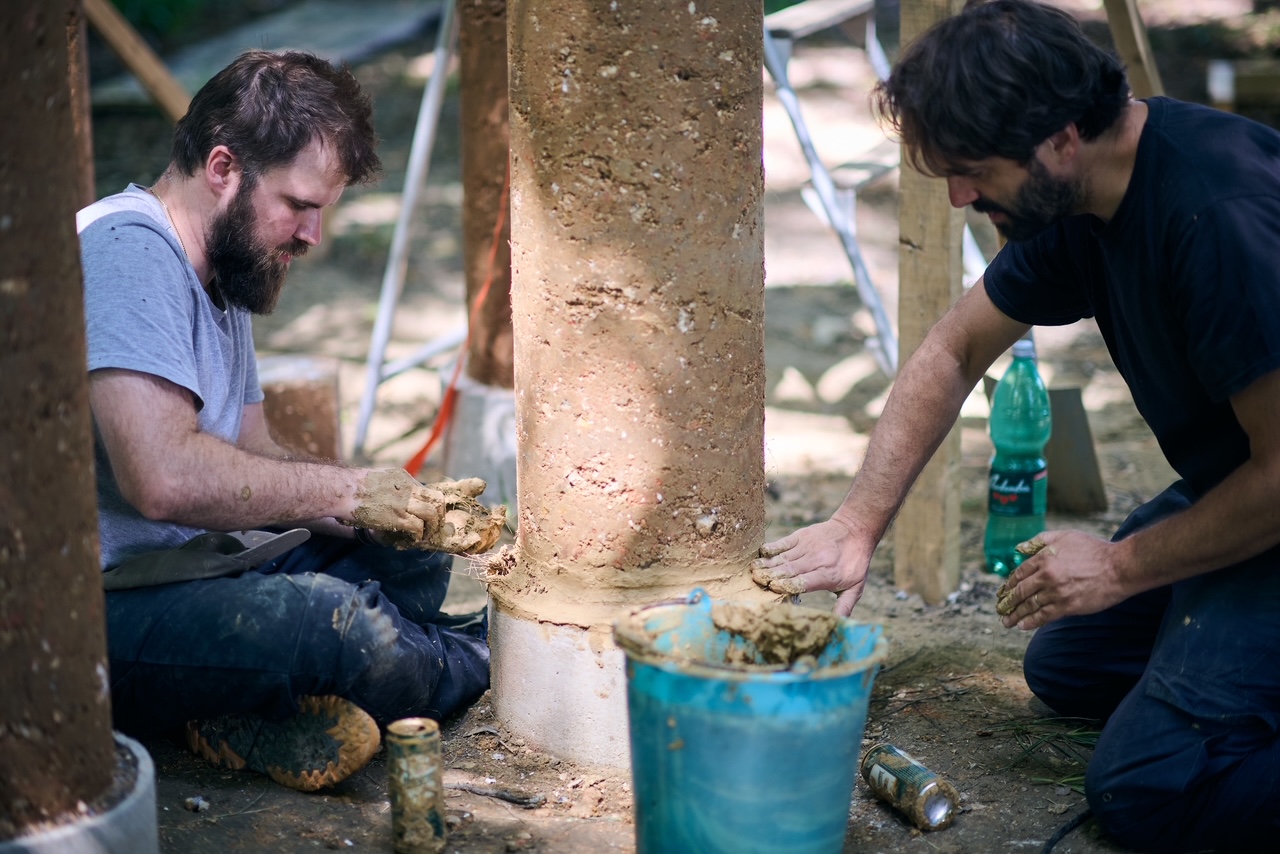 V Centru za gradnjo z zemljo je to gravitacijo zemlje zelo jasno čutiti. Skupaj z udeleženci letošnje delavnice smo pet dni pripravljali mešanico ilovice in peska ter neutrudno zbijali steber za stebrom. Iskali smo izboljšave, popravljali napake in pripravljali testne kocke. V času počitka pa je marsikdo vzel v roke še kepo gline in jo začel oblikovati. Še zvečer so ob ognju nastajale skodelice, skledice, naprstniki in drobne skulpture.