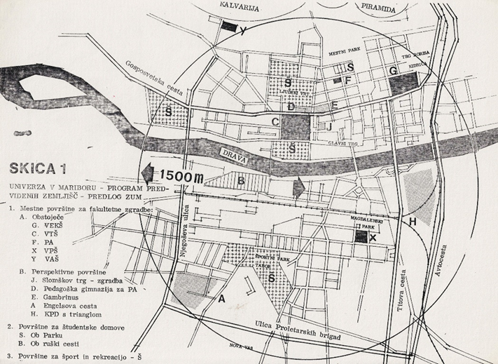 2 Čeprav so predvidene površine v načelu spejemljive, jih mora združenje v skladu s sprejetim razvojnim konceptom nove univerze aktivirati v funkcionalnem prostorskem in časovnam pogledu, tako da ob izgradni in hkratnem razvoju ne bo prizadet reden pedagoško zanstveni proces. To pa narekuje v prvi fazi dograjevanje že obstoječih kapacitet (VEKš) in funkcionalno vključevanje novih kapacitet v enotno univerzo (rektorat in VPŠ na Slomškovem trgu, PA ln VŠK s dokumentacijskim centrom). Pri tem pa površine ob obstoječih kapacitetah in predvidene površine ob pedagoški gimnaziji in kare Gambrinus ne zadoščata za zaključek prve faze izgradnje do leta 1980. Zato je po temeljitem preudarku bil sprejet predlog, da bi k predlaganim površinam priključili kot najustreznejše še površine pod Kalvarijo, med Kmetijskim zavodom in VAŠ.