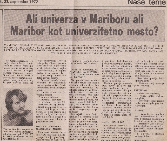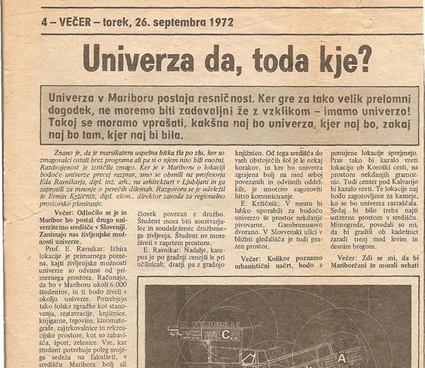 V obravnavanem obdobju so nastajali v Mariboru prvi zametki nove slovenske univerze. Prevladalo je prepričanje, da bo odločitev o novem univerzitetnem središču vplivala na vrsto pozitivnih dejavnikov, tako v sami štajerski regiji kot tudi v širšem slovenskem prostoru. Kot aktiven član ljubljanske univerzitetne delovne skupine in sodelavec v Ravnikarjevem teamu, sem kmalu prepoznal sorodnost obeh prostorskih situacij. Bil sem v tesnem stiku s svojo mariborsko generacijo in z znanimi mariborskimi arhitekti zato smo odprli javno polemiko o urbanistični usodi mesta. Ob tem je bila pomembna strokovna avtoriteta arhitektov Boruta Pečenka in Branka Kocmuta. Predsem slednji, nekdanji Ravnikarjev asistent in osrednja mariborska strokovna in intelektualna figura je bil naklonjen ideji mestne univerze. Kajti, podobno kot v Ljubljani, se je tudi v Mariboru odločalo med dvema možnostima, ali: