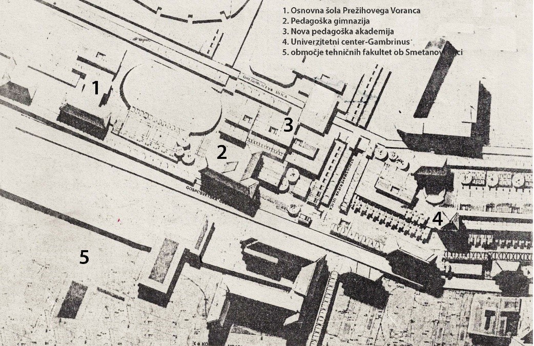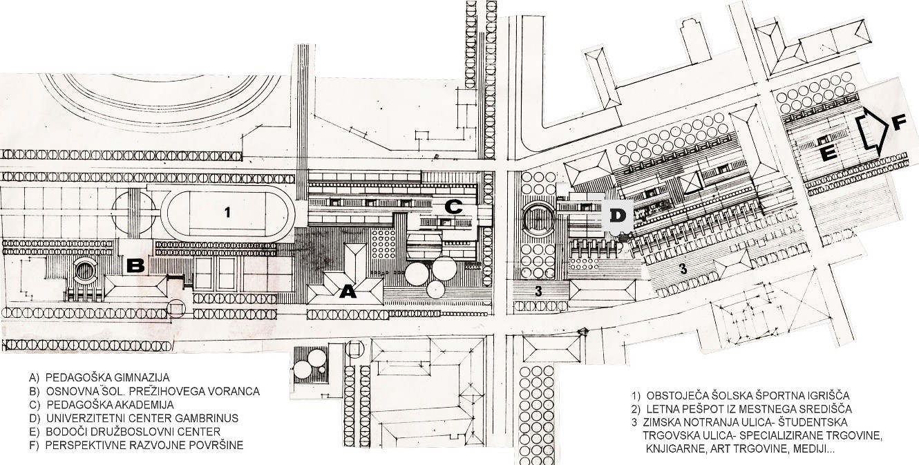 Modificirana prvotna urbanistična zasnova z dislocirano pedagoško akademijo in študenskimi domovi.