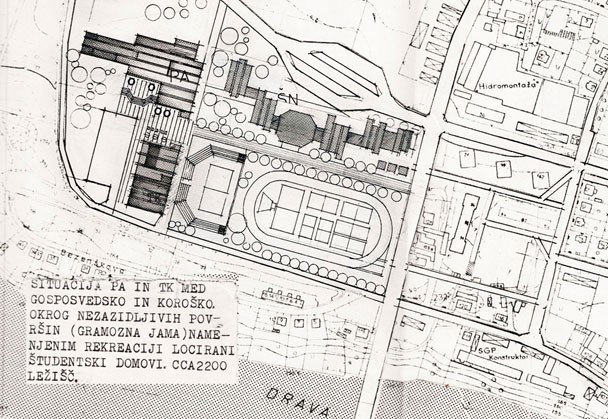 Urbanistična skica možnega večnamenskega univerzitetnega centra z zametki družboslovega centra.