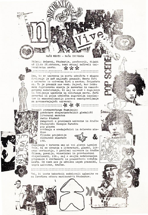 Primer letaka, ki je pozival študente in meščane k udeležbi na dogodkih, ki so bili organizirani ob odprtju razstave projekta nove univerze v prostorih »bodočega rektorata« na Slomškovem trgu.