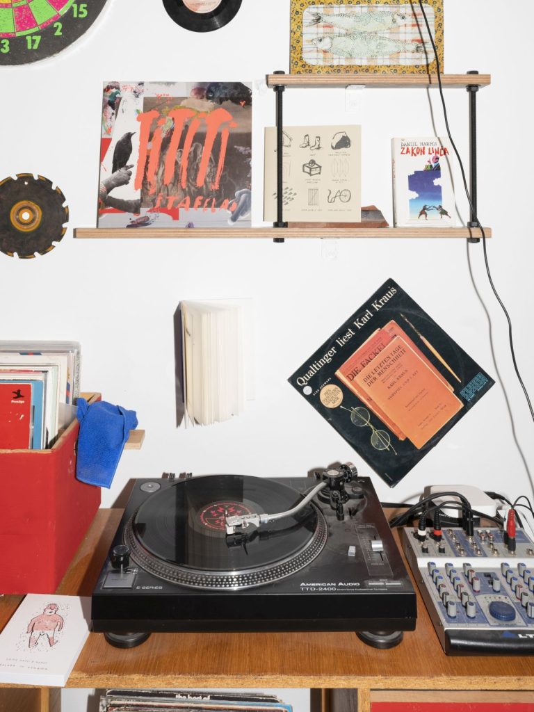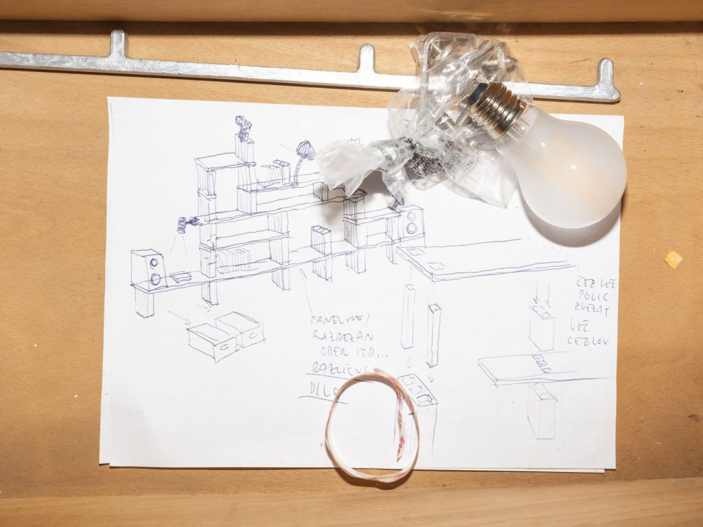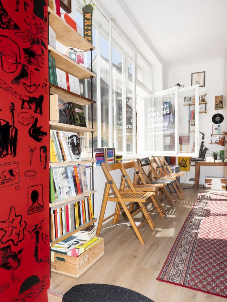 Vzdolž Trubarjeve ulice, ki se vije skozi srce mesta, je nanizanih nekaj povsem unikatnih kotičkov. Od starinarnice Carniola Antiqa, ki me vedno začara s svojo izložbo vselej menjajočih se grafik, slik in predmetov (prispevek v Outsider#36), do Hiše eksperimentov, kjer lahko ležite na postelji iz žebljev. Če se sprehodite še malo višje po ulici, vas pot popelje do uredništva literarno-umetniškega društva Literatura, kjer je sedež založbe, vse od oktobra pa tudi domovanje Literaturinih knjig, ki so se znašle na poličkah v prenovljeni knjigarniški »dnevni sobi«, kot ji šaljivo rečejo na uredništvu. V upanju, da se bodo tako odprli za bralke in bralce so lani na založbi sklenili, da jim bodo ponudili tudi fizičen, ne le spletni nakup knjig in to kar na sedežu uredništva. Rezultat je samosvoj knjigarniški prostor, ki ga odlikuje oblikovalska zasnova Mateja Stupice, čigar budno oko je kar eno leto nadzorovalo prenovo. Na Literaturi vsekakor niso ubrali konvencionalnega pristopa in niso najeli arhitekta, ampak so Mateju, slikarju in vsestranskemu vizualnemu umetniku,  prepustili proste roke pri preobrazbi. Kot pove sam, je ključna beseda pri oblikovanju tega prostora zanj improvizacija, saj si je želel ustvariti prostor, ki bi bil poln slik, ilustracij, starin, pisanih predmetov in drugih detajlov, na katerem si lahko med branjem spočijemo oči. Tako lahko na stenah občudujemo mnoge njegove uokvirjene ilustracije pa tudi nekaj del Žige Kariža.