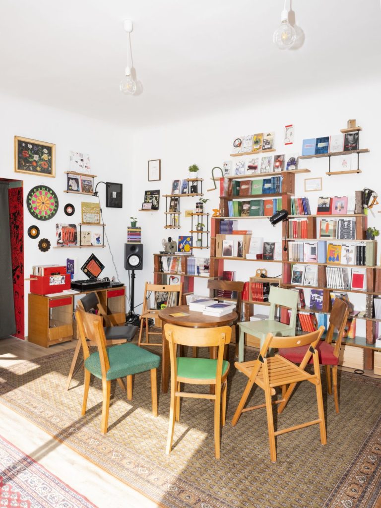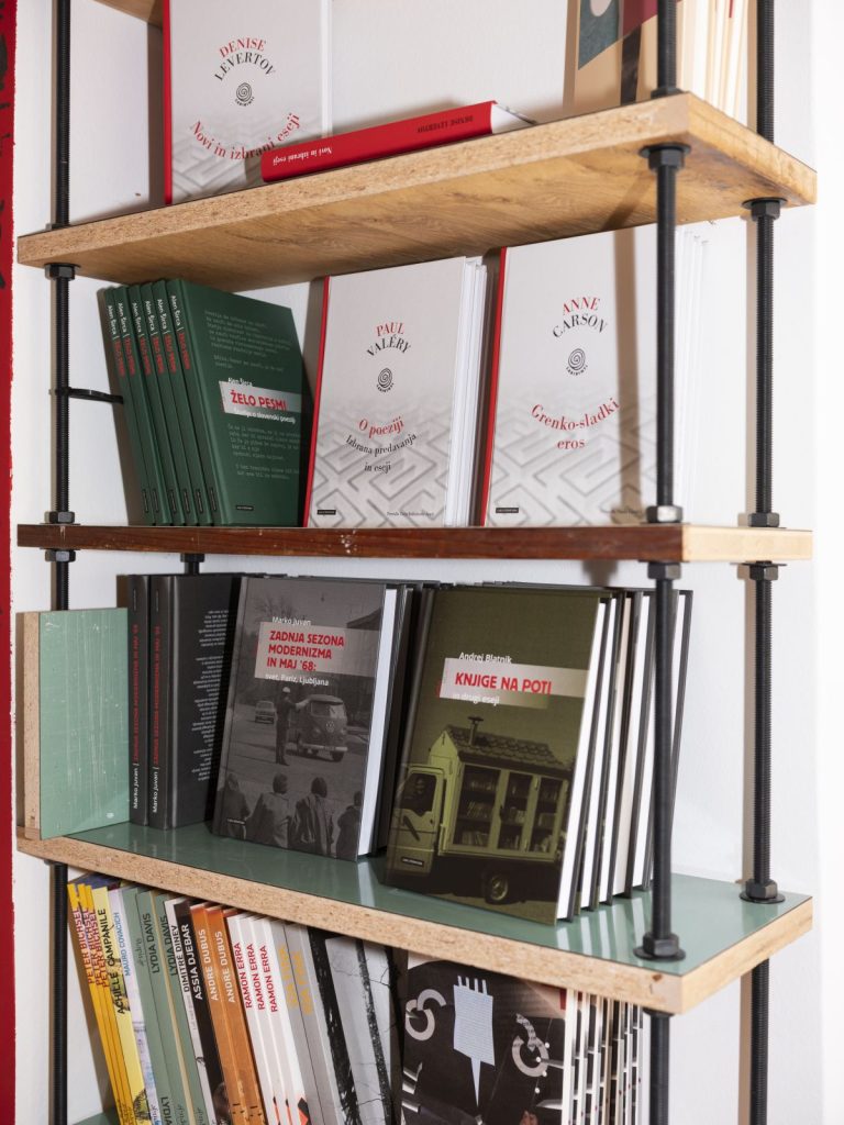 Prostor, po katerem se lahko sprehodite in v njem listate knjige, je povezan z manjšo pisarno, ki jo od glavnega prostora ločuje zavesa. Za to zaveso so uredniški prostori. Kot je povedala urednica in predsednica društva, Veronika Šoster, se je ideja za namenski prostor prodajalne knjig porodila že dolgo nazaj, ob prvi ediciji Literaturinega festivala Prepišno uredništvo. Založba se je nato dvakrat selila in naposled našla svoje zatočišče na Trubarjevi.