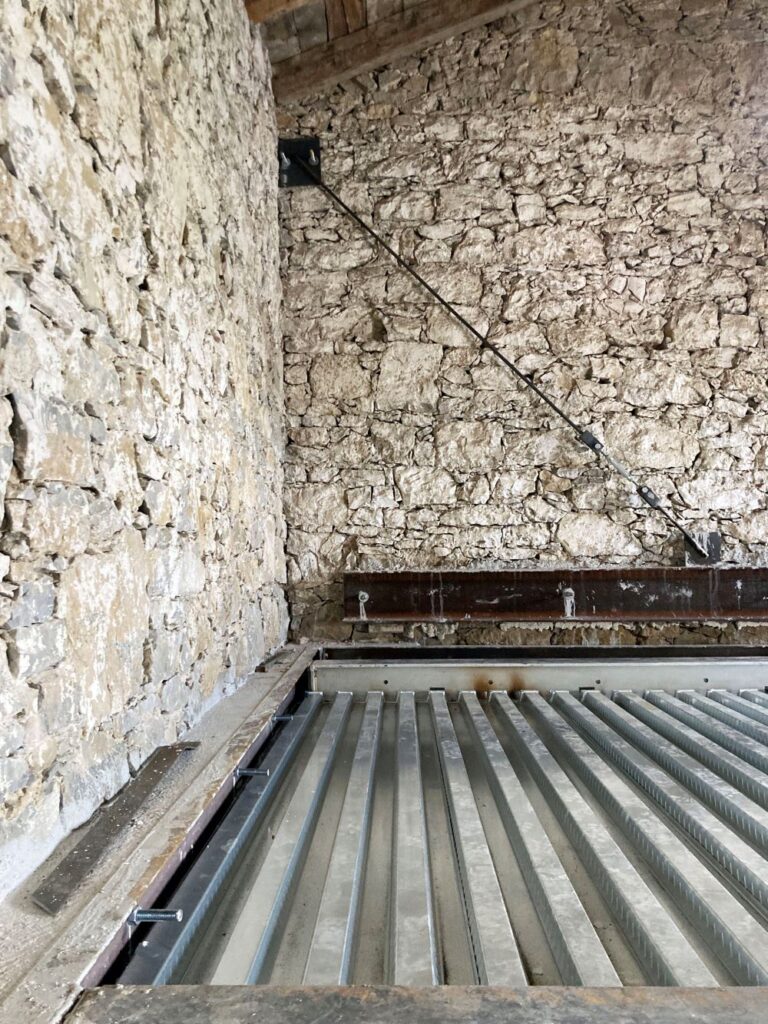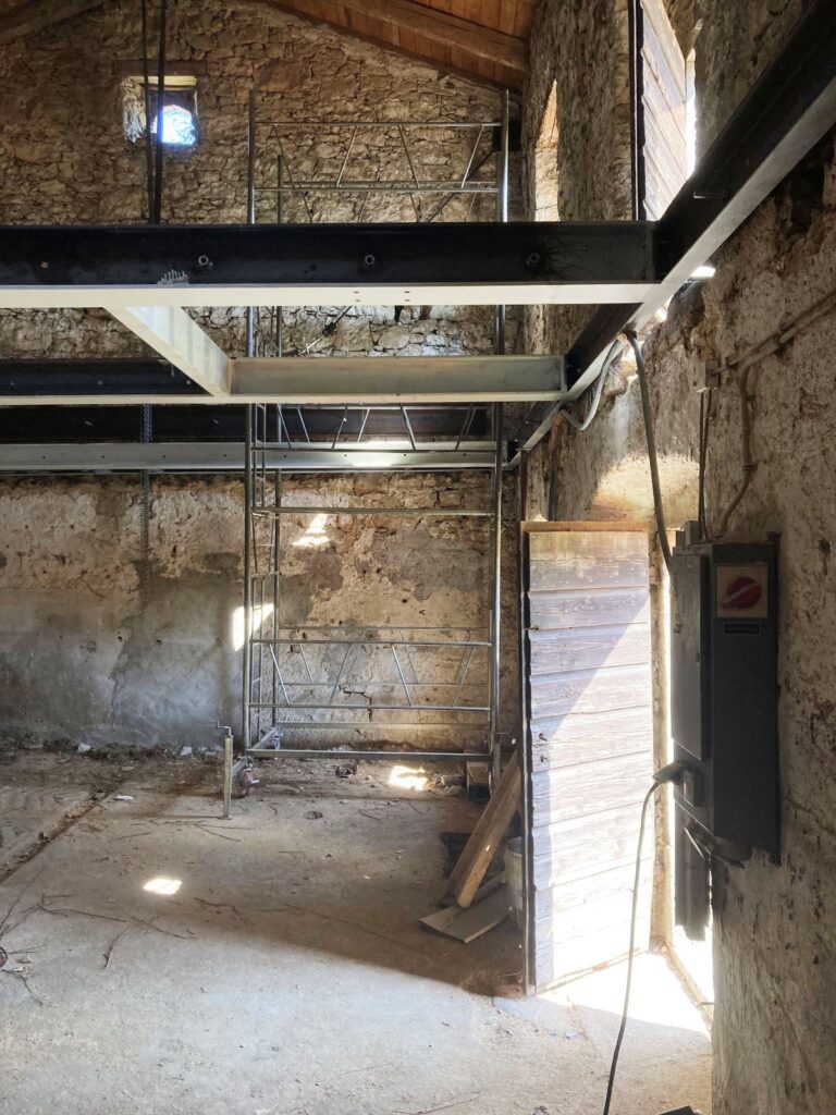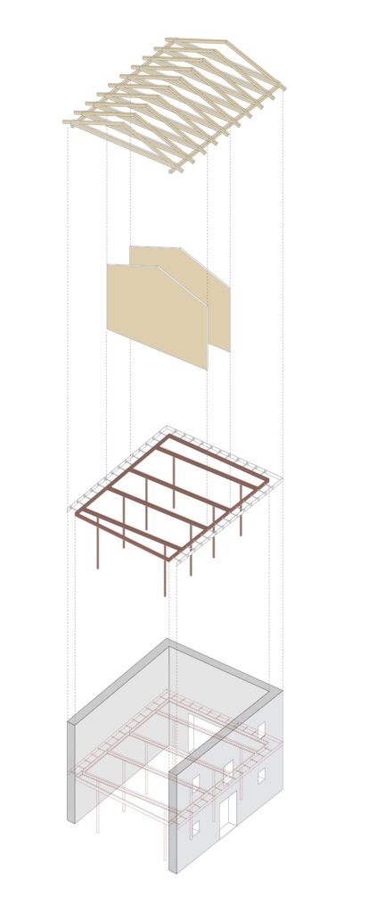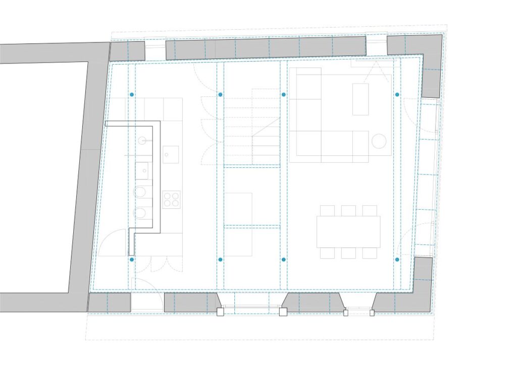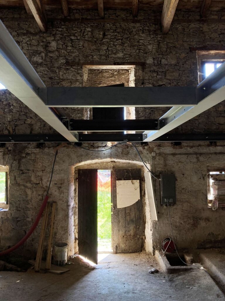 V to idejo smo dodali 4 pare stebrov, da bi težo prenesli na tla in ne bi obremenili zidov. Z vidnimi stebri v pritličju šele razumemo pomen posega. Nova kovinska konstrukcija postane stičišče programskih, konstrukcijskih, funkcionalnih, bivanjskih vprašanj prenove obstoječega objekta. Ni samo konstrukcija, je tudi koncept prenove, način sanacije obstoječih zidov in je prostorska organizacija. Vse na štirih konstrukcijskih oseh, na osmih stebrih, ki odmaknjeni od kamnitega zidu, ne le da nosijo in prostorsko določajo novo vsebino v nadstropju, temveč imajo tudi neposredno nosilno vlogo. V teh osmih stebrih in kovinskem obroču je povzeta celotna arhitekturna zgodba prenove.