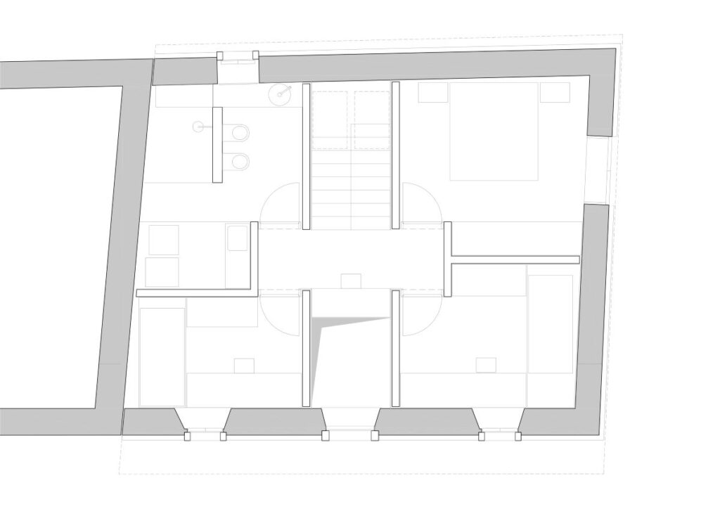 Predvsem pa je bil nekdanji hlev primeren tudi za enodružinsko hišo. Tlorisna organizacija je lahko upoštevala vse obstoječe odprtine, ki ostajajo na svojih prvotnih mestih. V fasado smo posegli zgolj na vzhodu.