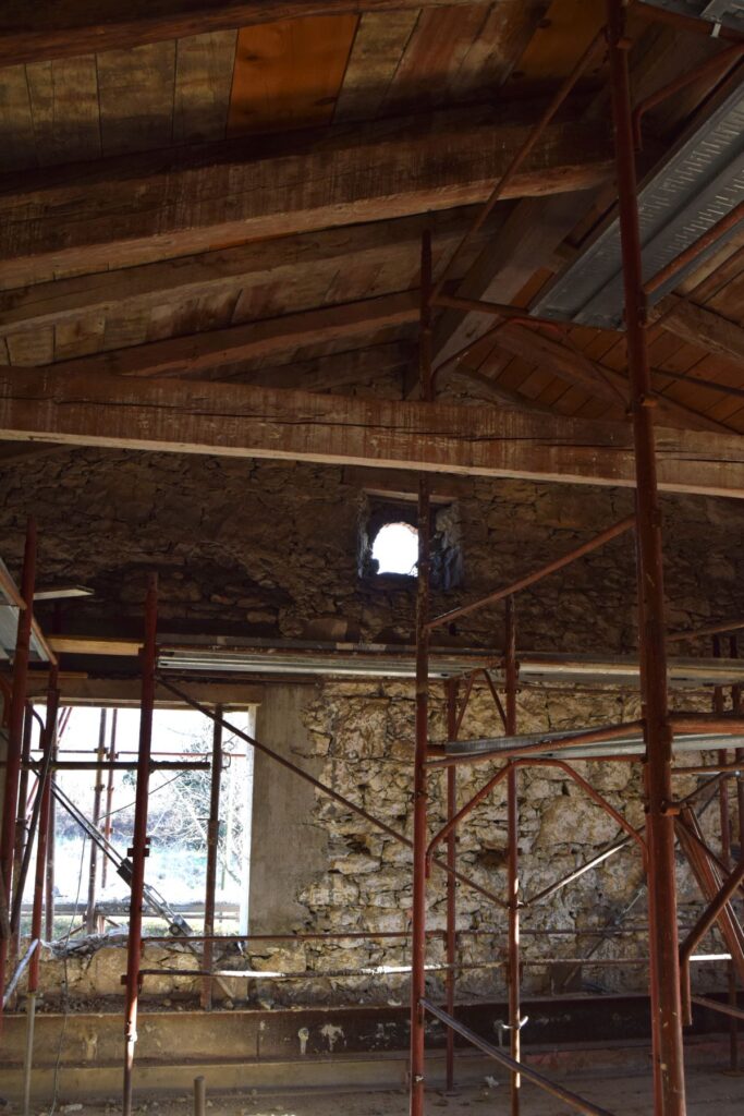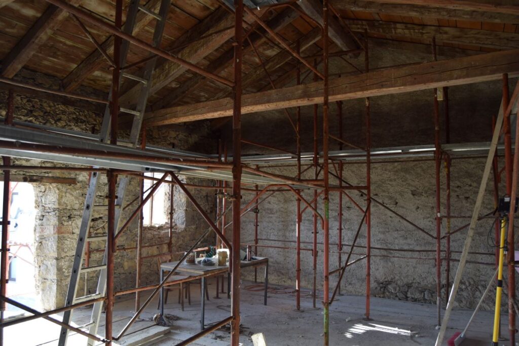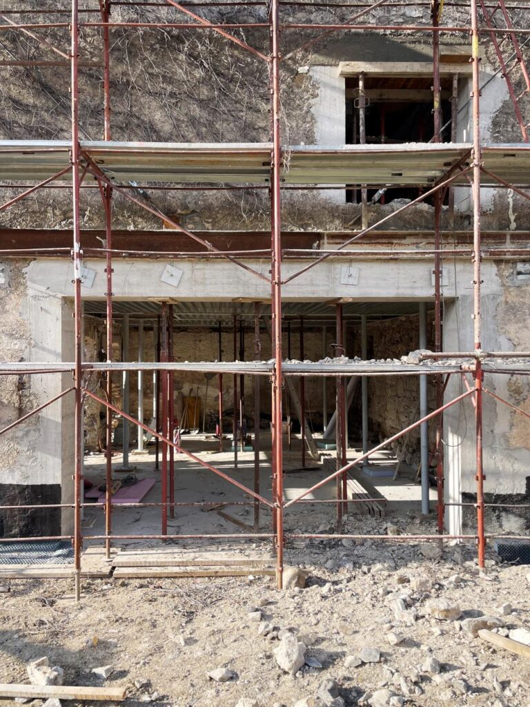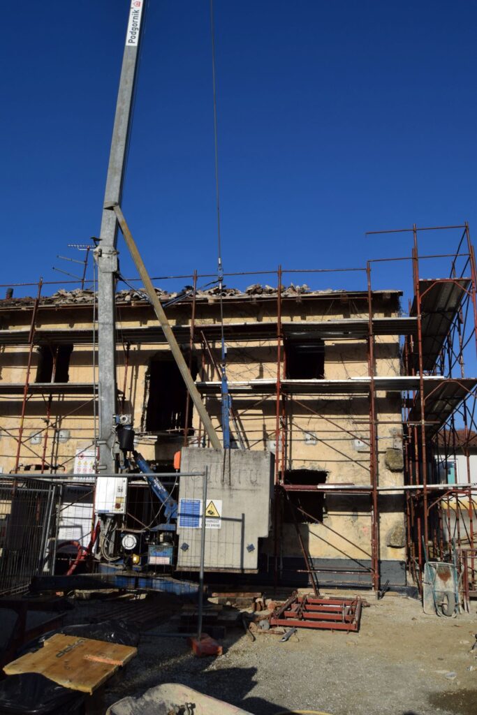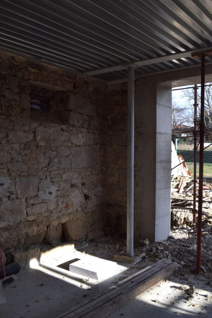 Gradbena dela se izvajajo od začetka lanskega oktobra. Gradbena dela vključujejo notranji in zunanji izkop, izvedbo drenaž in odvoda vode, notranjo temeljno ploščo, nove preboje, zamenjavo strehe in del zunanje ureditve. Dela naj bi trajala do konca februarja. Skupaj bodo gradbena dela trajala pet mesecev. Že pred pričetkom gradbenih del je bila vgrajena kovinska konstrukcija, ki je stabilizirala zidove in omogočila nadaljna dela. Kot rečeno, je ta dela opravil investitor sam.