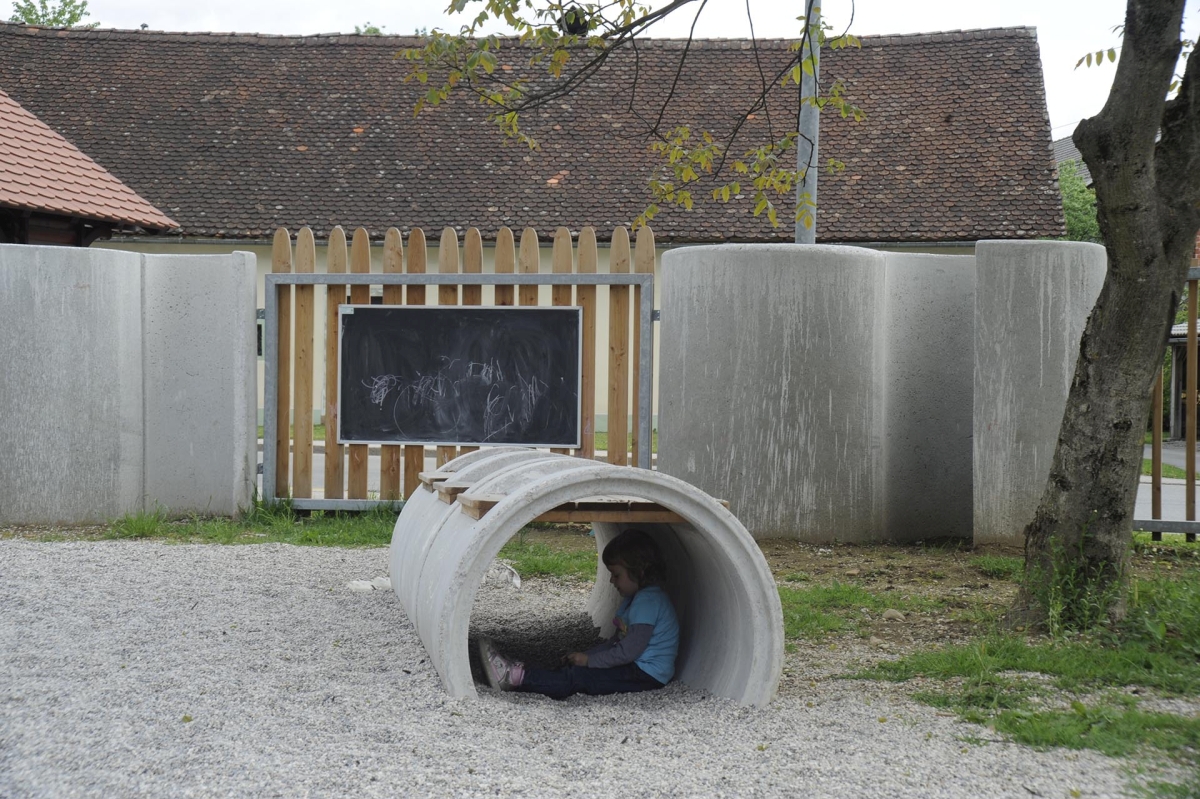 Paleta rešitev je dovolj obširna, da si lahko zastavimo vprašanje, v čem je privlačnost polizdelka iz surovega betona, primarno namenjenega odvajanju fekalij. Delno je mogoče odgovor najti v modernističnem načelu gradnje s prefabrikati; cevi so poleg tega univerzalne oblike, ki združuje v sebi krog in kvadrat, na voljo so v najrazličnejših dimenzijah, izdelava je nezahtevna in cenena. A v pogostosti njihove uporabe predvsem v prostorih igre lahko morebiti prepoznavamo še nekaj več od golega racionalizma: betonska cev je na svoj način moderna abstrakcija enega od najbolj prvinskih bivališč – jame. Izkustvo praznine, izdolbene v masivni obod, je nedvomno ena najvztrajnejših tem arhitekture, zakoreninjena globoko v nezavednem. V tem smislu je blizu pojmu »prvinskega prostora«, prostorske izkušnje maternice, ki ga je raziskoval in v svojem projektu vrtca Mladi rod v Ljubljani tudi v praksi preizkušal Stanko Kristl, ob Rotiji Badjura eden osrednjih pionirjev arhitekture vrtcev pri nas.