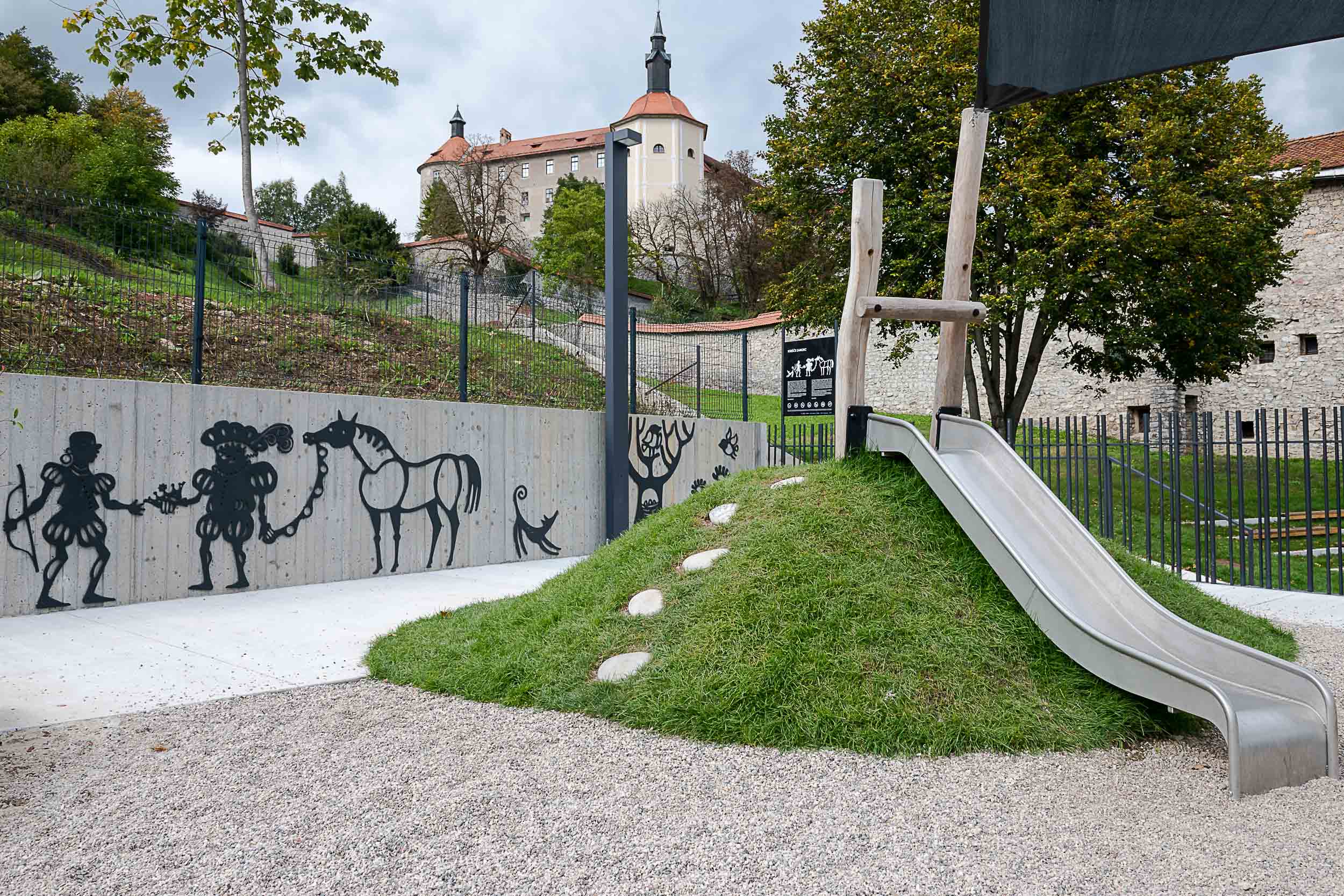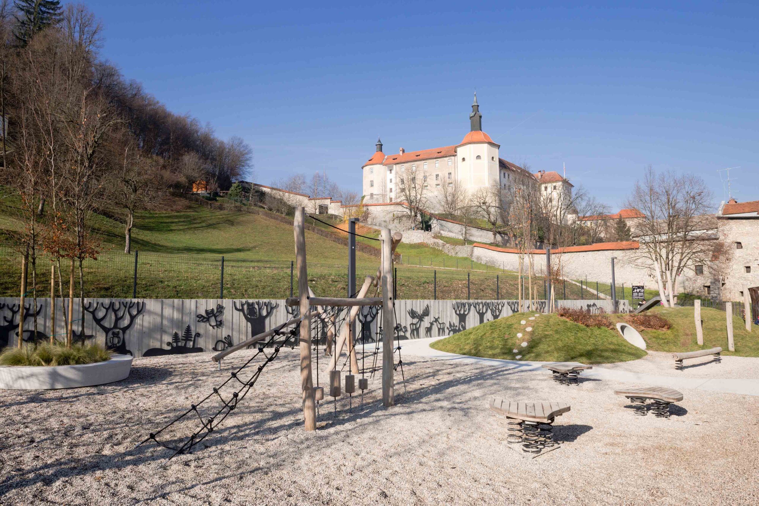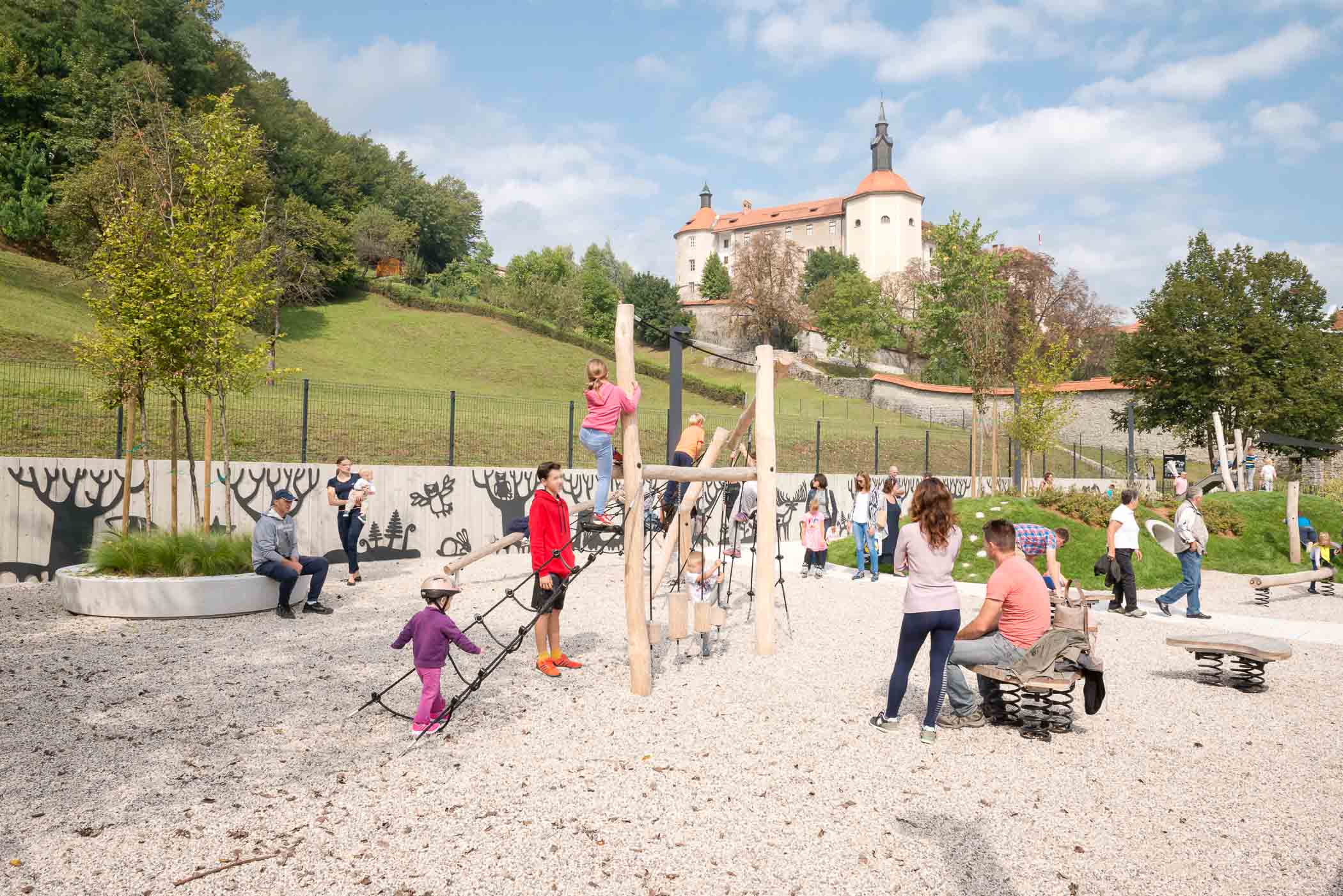 Škofjeloški otroci se lahko po novem zabavajo na prijetnem igrišču pod gradom, ki so ga oblikovali v arhitekturnem biroju Ravnikar Potokar.