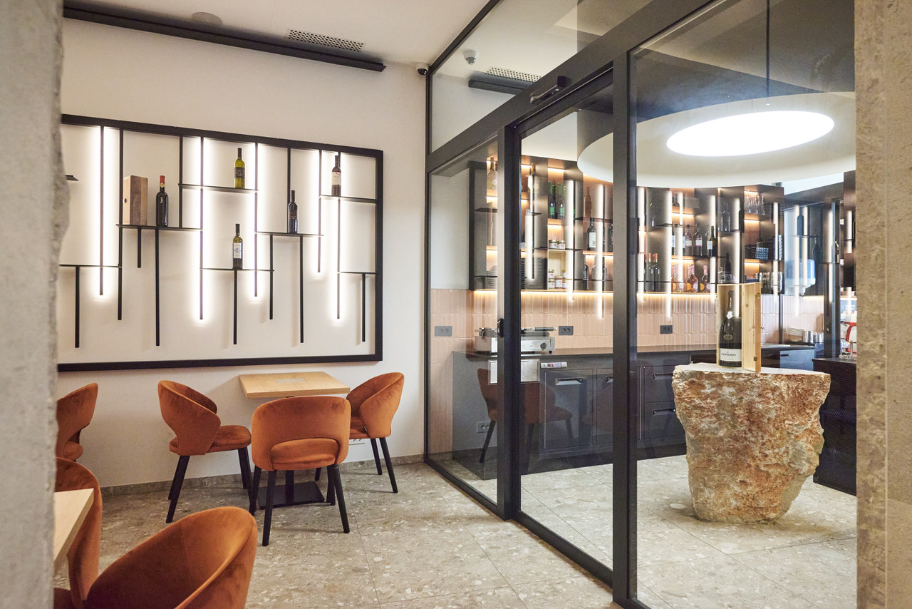 Ambienti v lokalu se stopnjujejo in nadgrajujejo; vstopni del je tipično barski, za značilno tržaško stoječe pitje kave ob šanku. Temu sledi domiselno izkoriščena višinska razlika dveh stopnic za razdelitev lokala na visoke barske mize s stoli in nizke mize z oblazinjenimi stoli v notranjosti bara. Po najdaljši steni poteka intenzivno modra oblazinjena klop pod stenskim muralom, vertikalni poudarki v lokalu pa so izvedeni v značilnem kraškem kamnu. Zadnji, najintimnejši prostor spominja na sodobno vinsko klet, z regalom za steklenice, kamnito stranico in leseno oblogo v obliki lesenih vrat, ki zaokrožijo vtis »kraškega hrama«.