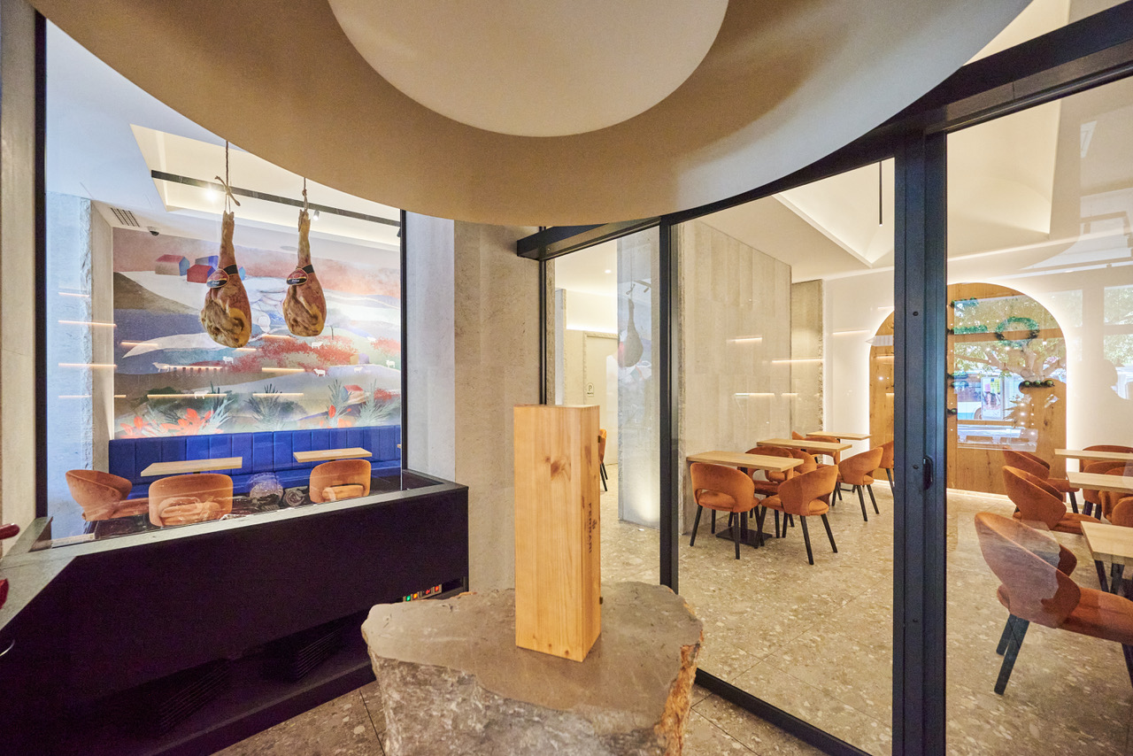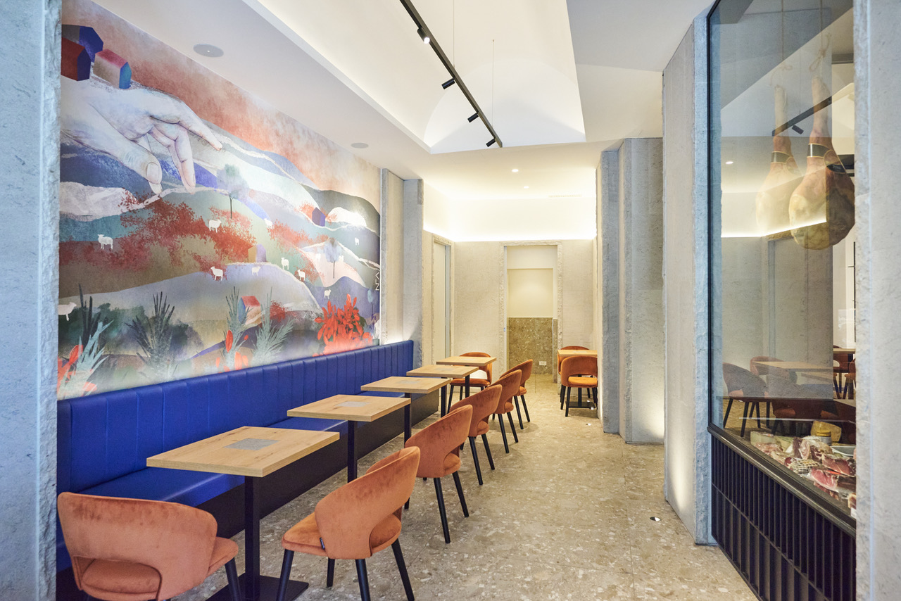 V središču lokala sta izložba pršutov in mesnin, s katero se avtorica pokloni bližnji tržnici in trgovskemu značaju tržaške četrti, ter osrednji element, grobo izklesan kamnit podstavek, na katerem je, kot na oltarju, izpostavljeno kraško bogastvo, dobro vino in pršut.